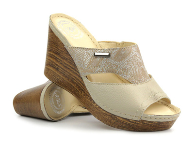 Skórzane klapki damskie na koturnie - Waldi 1127, kremowy