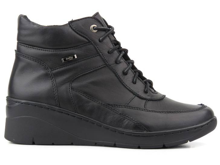 Botki damskie cenionej polskiej marki Helios Komfort zostały wykonane z wysokiej jakości skóry naturalnej licowej w kolorze czarnym. Wnętrze jest ocieplone przyjemnym w dotyku polarem obuwniczym. Zamek błyskawiczny pozwala na szybkie i wygodne zakładanie botków Helios. Dzięki regulacji sznurowadeł, model można dobrze dopasować do nogi. Gruba podeszwa z koturnem 5 cm jest wykonana z lekkiego tworzywa, dzięki czemu nie męczy stóp.