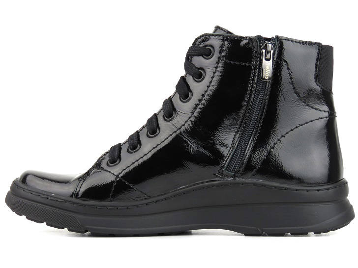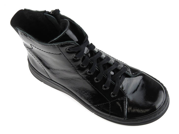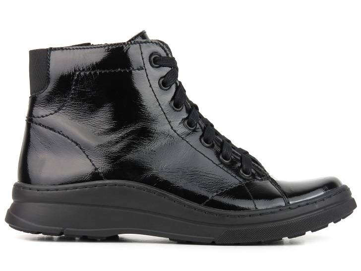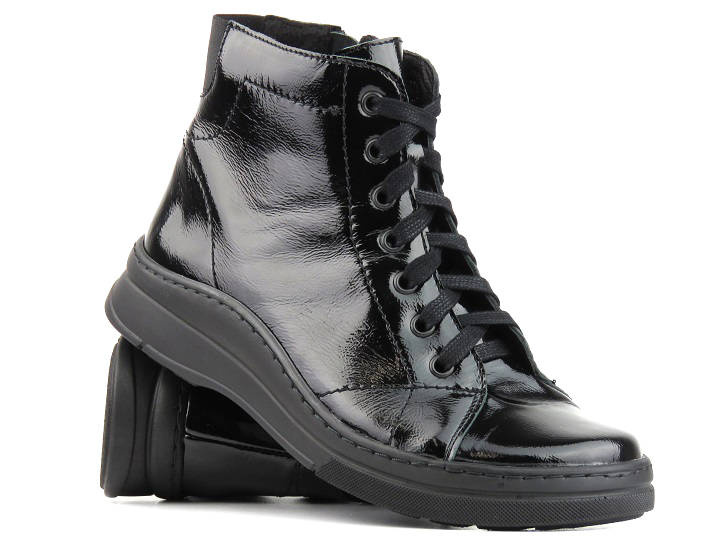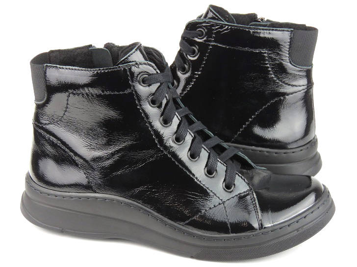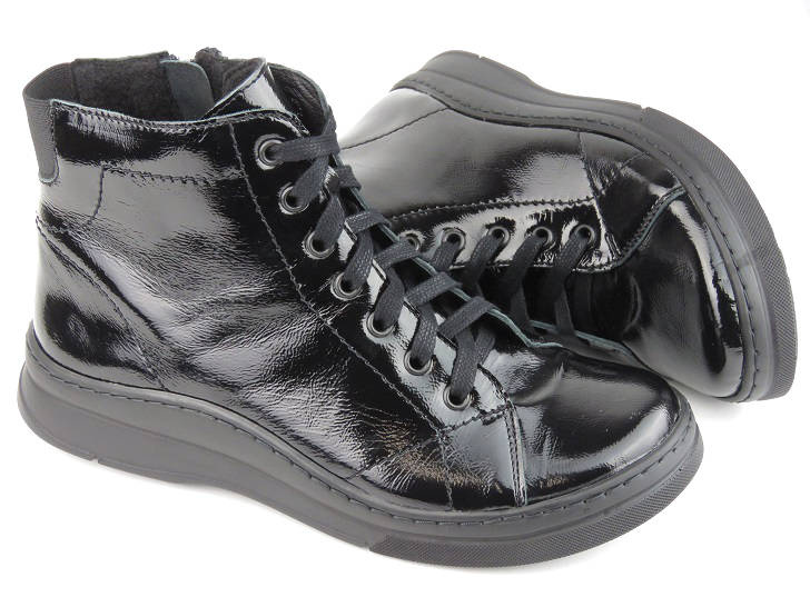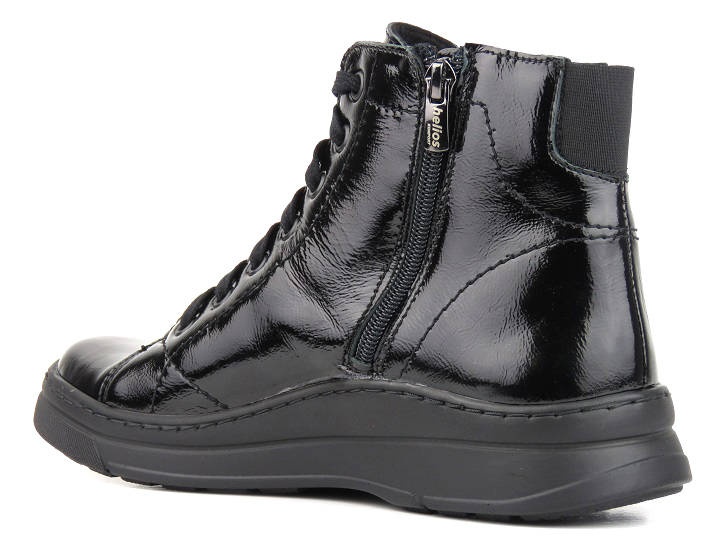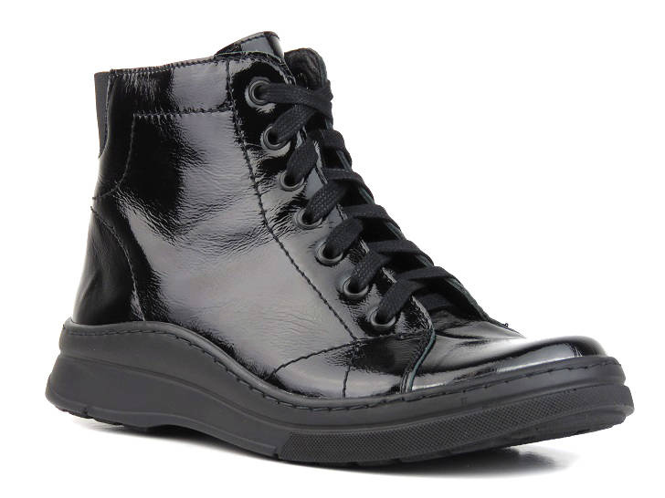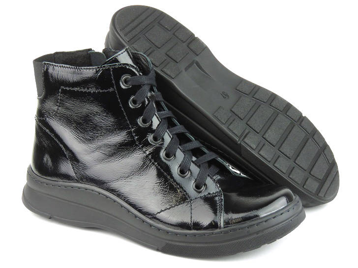 Botki damskie cenionej polskiej marki Helios Komfort zostały wykonane z wysokiej jakości skóry naturalnej lakierowanej w czarnym kolorze. Wnętrze jest ocieplone filcem obuwniczym, który chroni stopy przed chłodem. Zamek błyskawiczny pozwala na szybkie i wygodne zakładanie obuwia. Dzięki zastosowaniu sznurowania i elastycznej gumki z tyłu, model można dobrze dopasować do nogi. Gruba podeszwa w sportowym stylu zapewnia dobrą izolację od podłoża i amortyzację. Jest ona także lekka i wygodna. Czarny lakier cholewki prezentuje się oryginalnie.