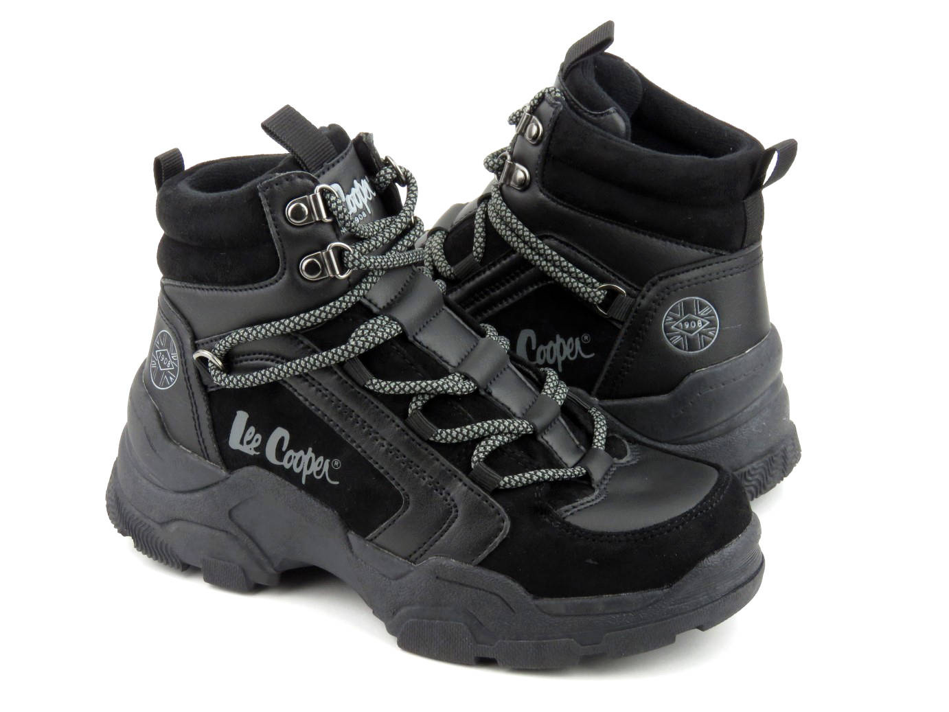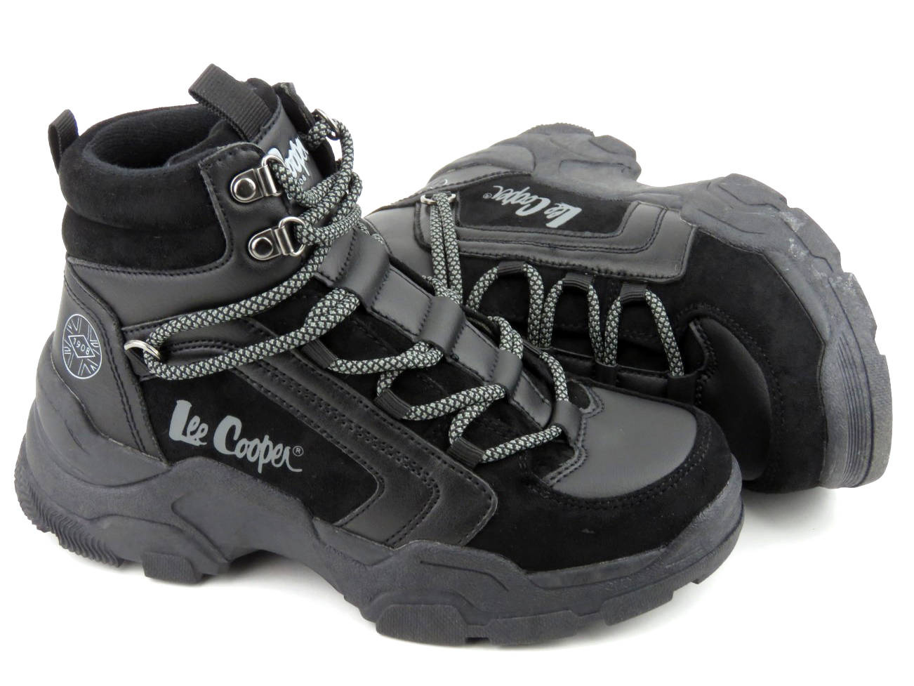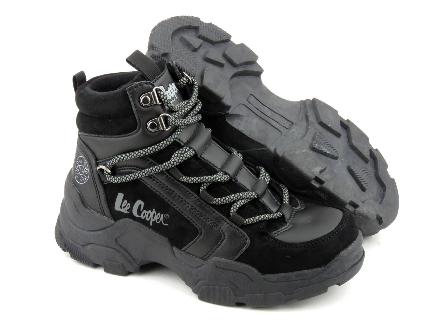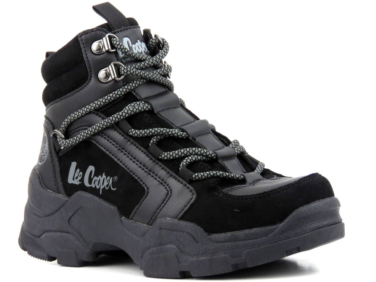Cholewka traperów damskich zimowych brytyjskiej marki Lee Cooper została wykonana ze skóry ekologicznej w kolorze czarnym.