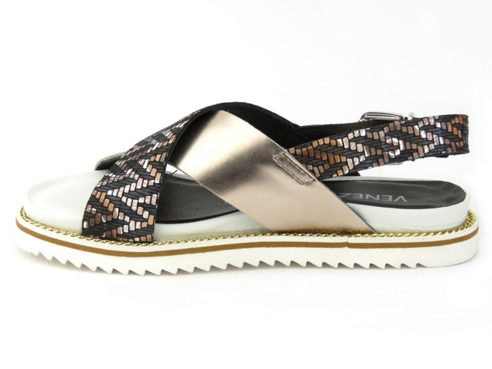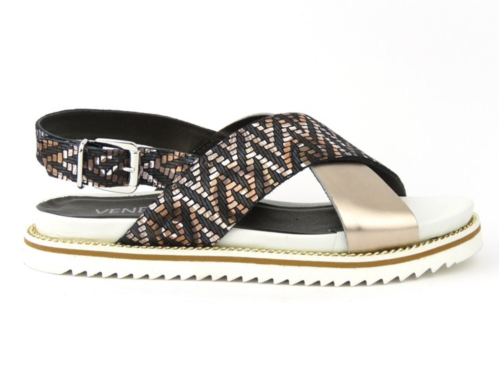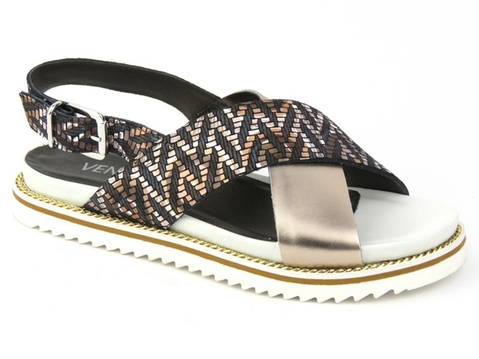 Sandały wykonane ze skóry naturalnej w melicznym odcieniu brązu. Oryginalny, kolorowy nadruk. Wygodne, regulowane zapięcie na wysokości kostki. Komfort zapewni skórzana wkładka podbita miękką gąbką. Żłobiona podeszwa z oryginalnym otokiem w formie metalowego łańcuszka.