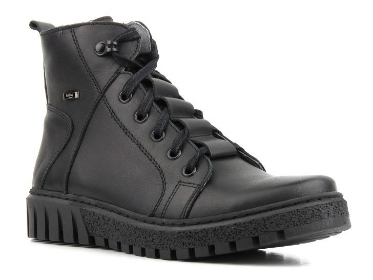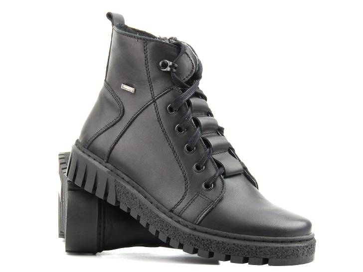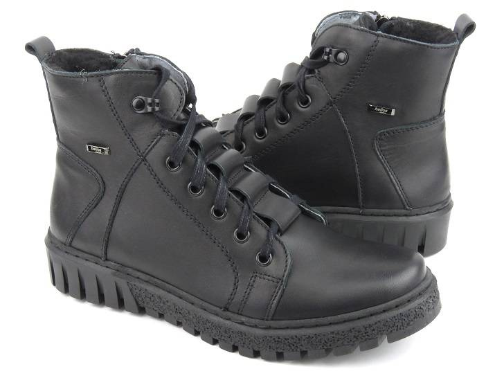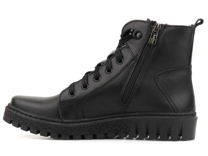 Trapery damskie cenionej polskiej marki Helios Komfort zostały wykonane z wysokiej jakości skóry naturalnej licowej w kolorze czarnym. Wnętrze jest ocieplone wełną naturalną, która zapewnia ciepło i miękkość. Suwak pozwala na szybkie i wygodne zakładanie obuwia. Dzięki regulacji sznurowadeł, cholewkę można dobrze dopasować do stopy. Modna, traperowa podeszwa z termokauczuku dobrze izoluje od podłoża i ma właściwości antypoślizgowe. Gładka, czarna cholewka traperów Helios będzie pasowała do wielu stylizacji.