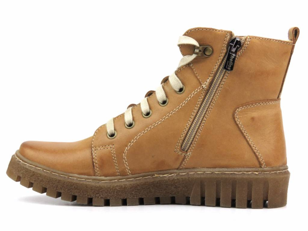 Gładka, brązowa cholewka traperów Helios będzie pasowała do wielu stylizacji.