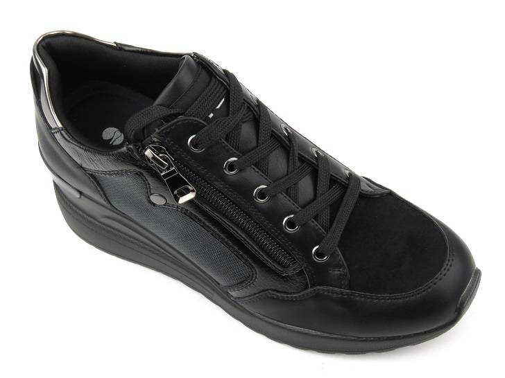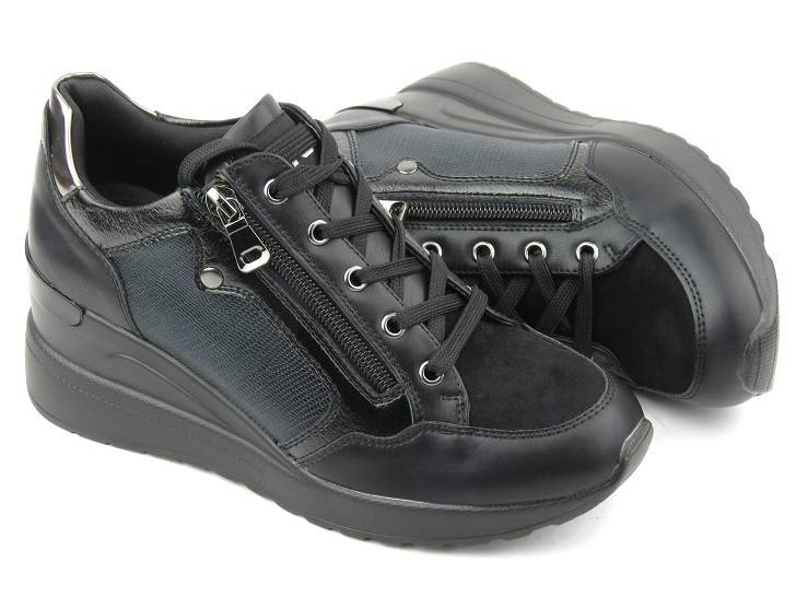 Buty damskie sportowe marki INBLU wykonane zostały z kilku rodzajów skóry ekologicznej w kolorze czarnym - uniwersalnym i praktycznym. Wyściółkę stanowi wygodna tkanina. Wkładka została osadzona na miękkiej piance, by każdy krok był lekki, komfortowy.