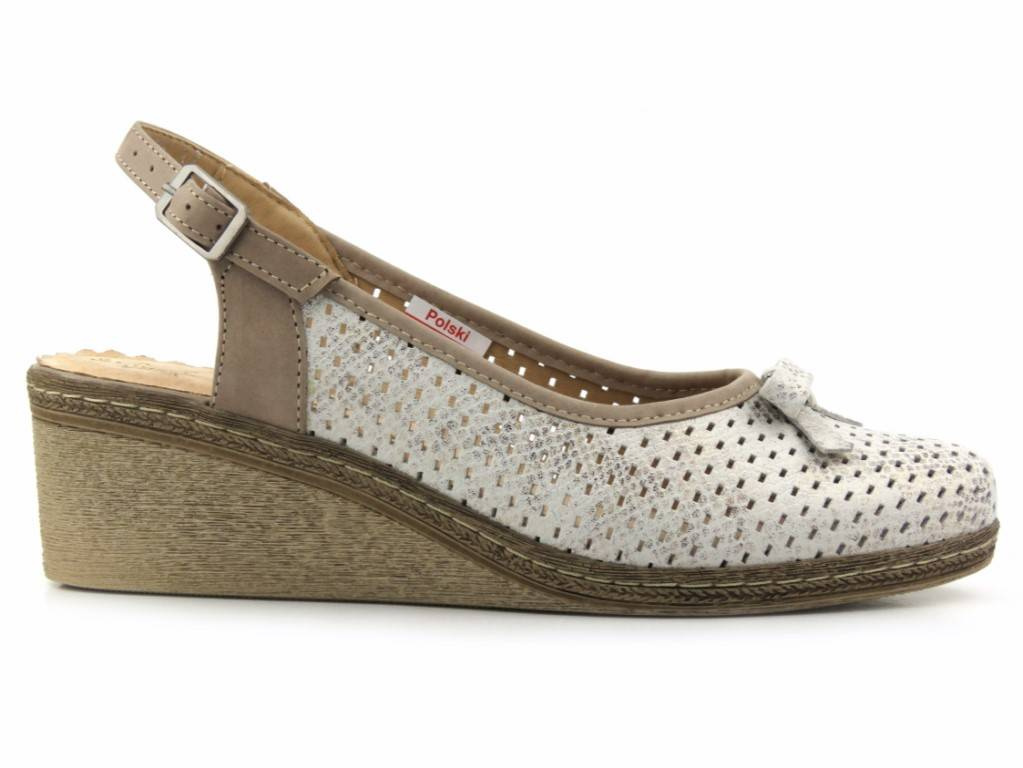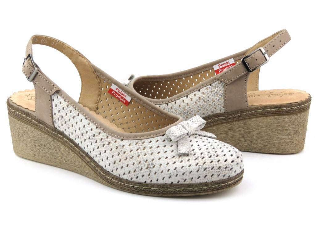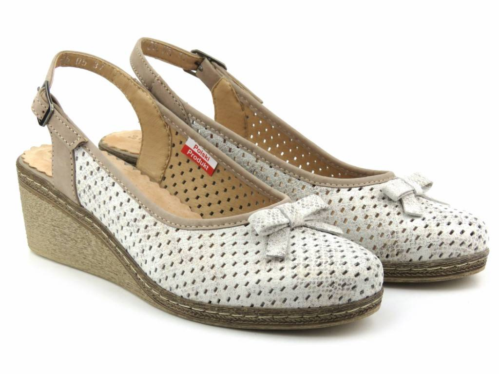 Model urozmaicono kokardką, a neutralny kolor połyskującej bieli w połączeniu z beżem ładnie dopełni wiele letnich stylizacji.