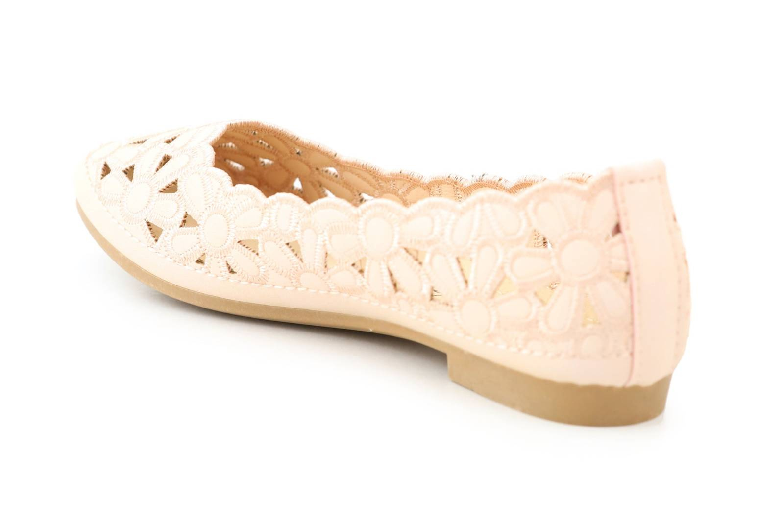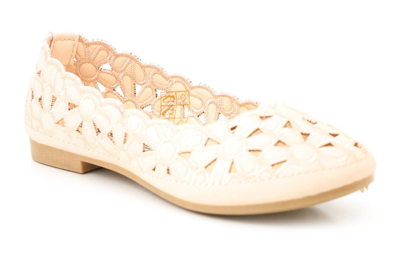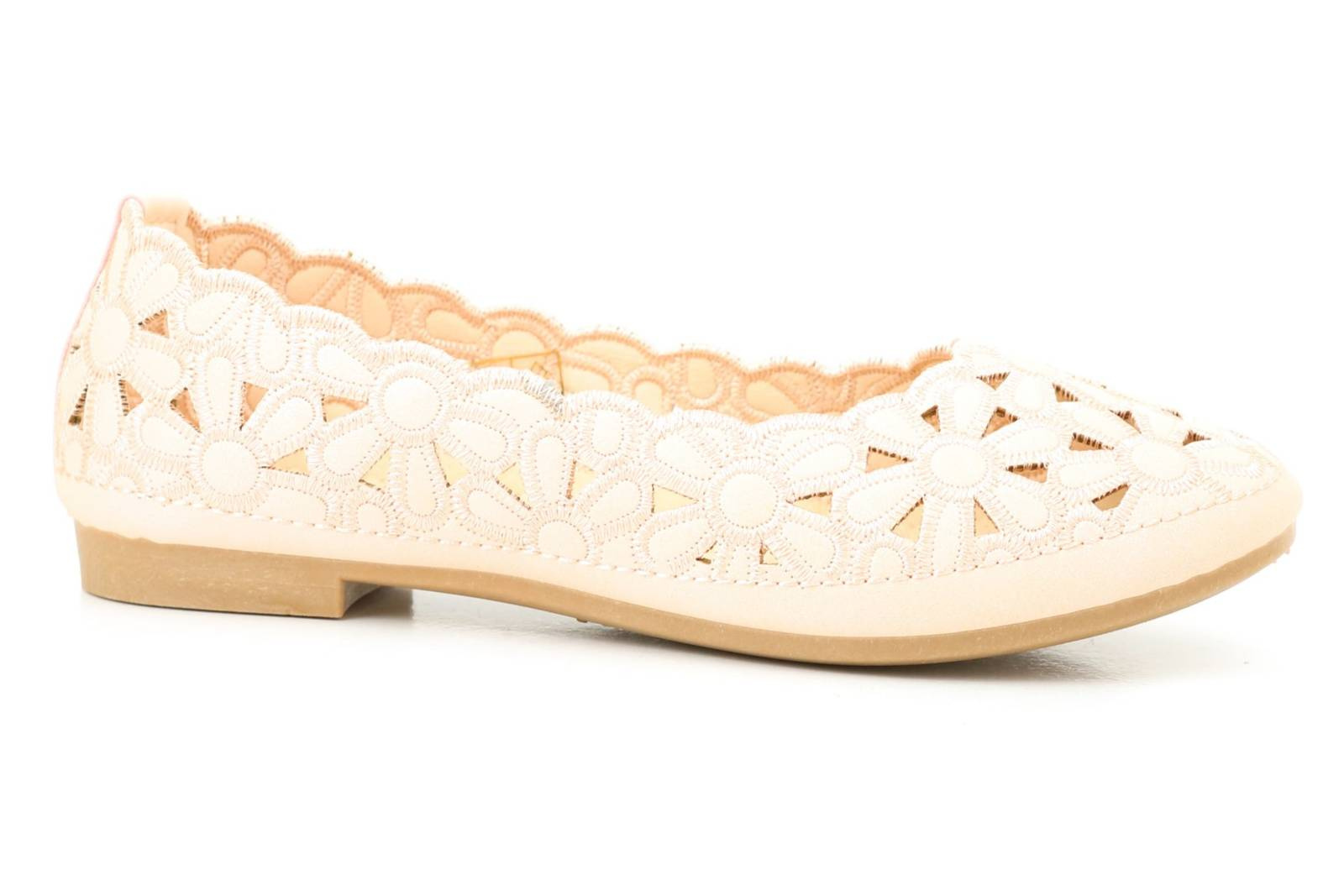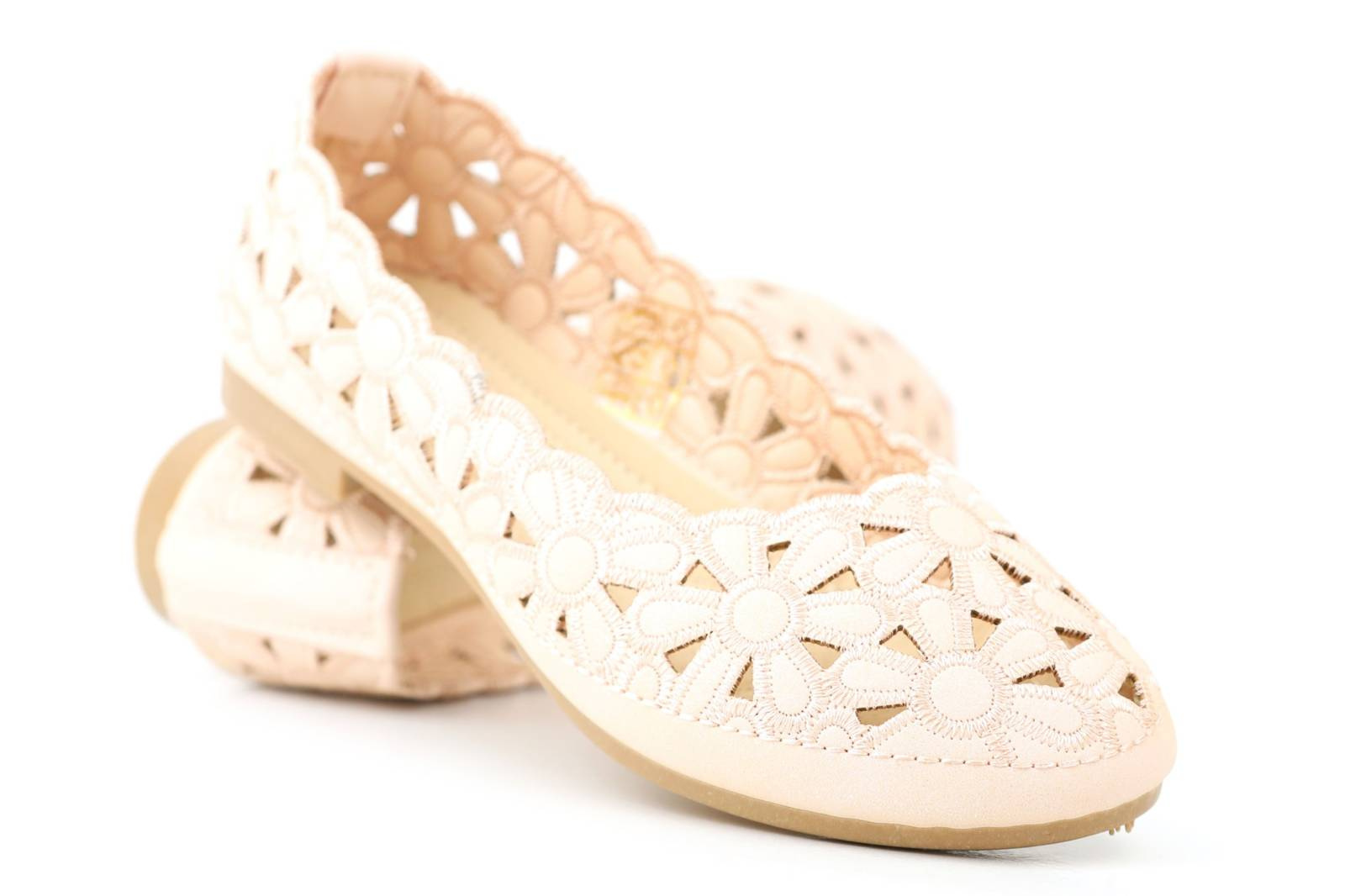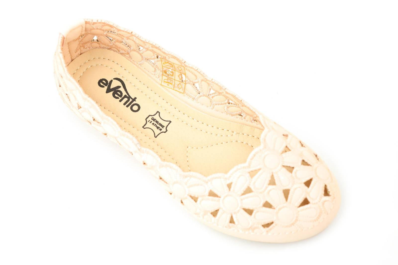 Balerinki marki Evento zostały wykonane z zewnątrz z tkaniny w kolorze różowym w ażurowe kwiaty.
