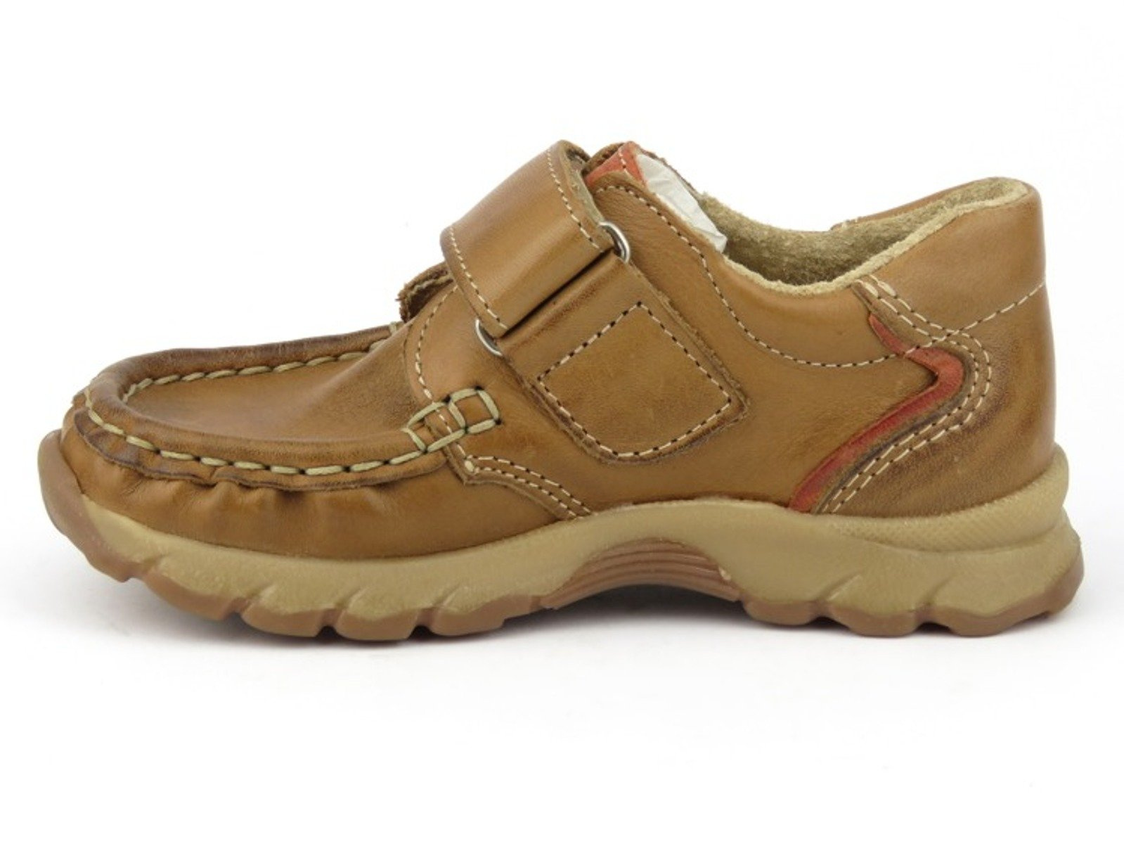 Materiał wierzchni stanowi wysokiej jakości skóra naturalna licowa. Środek buta oraz profilowana wkładka wykonane są z miękkiej skóry naturalnej, co zapewnia odpowiedni komfort dla stóp. Elastyczna podeszwa z termokauczuku ma właściwości antypoślizgowe. Czubek buta jest szeroki i wysoki, dzięki czemu dziecko może swobodnie poruszać palcami. Zapięcie na rzepy pozwala na szybkie i wygodne zakładanie obuwia. Usztywniony zapiętek umożliwia prawidłowe ułożenie stopy.