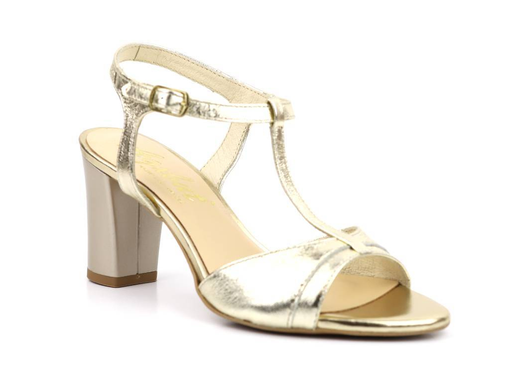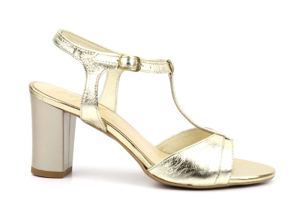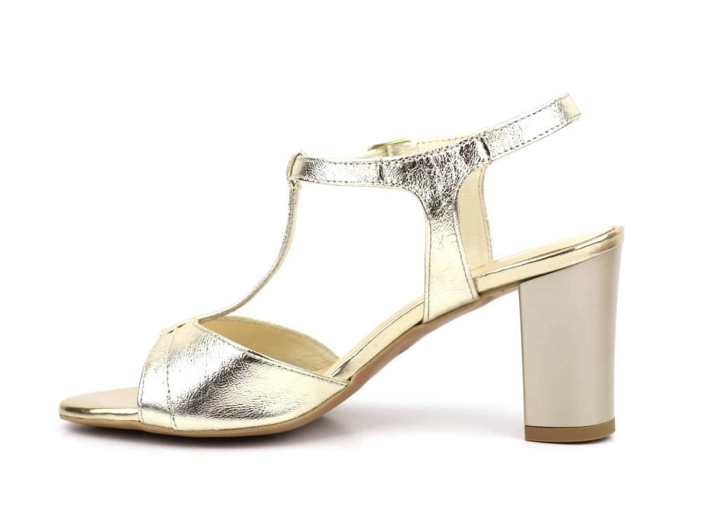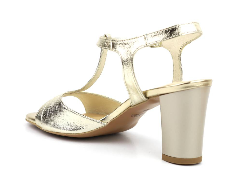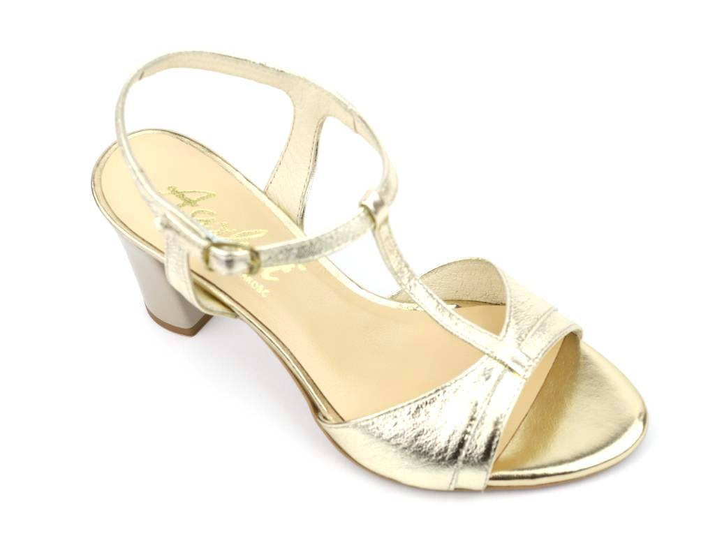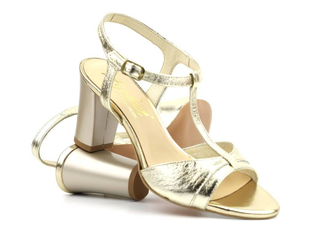 Sandały damskie na słupku marki Agxbut zostały wykonane z wysokogatunkowej skóry naturalnej licowej w metalicznym odcieniu złota.