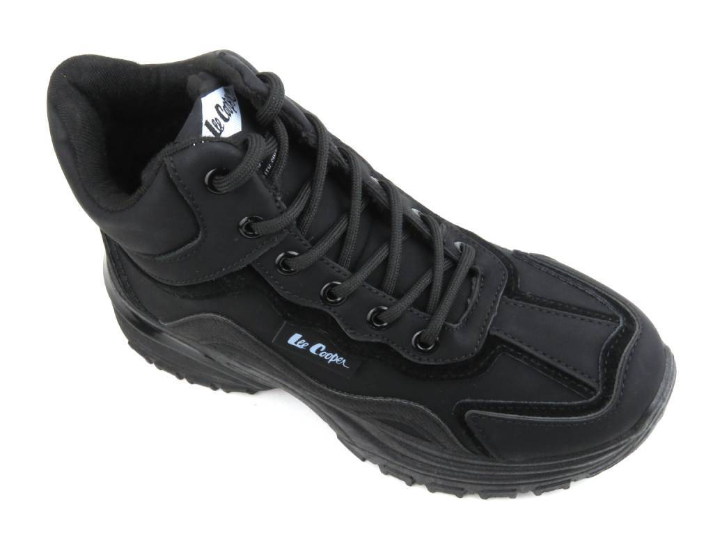 Cholewka traperów damskich brytyjskiej marki Lee Cooper została wykonana ze skóry ekologicznej w kolorze czarnym.