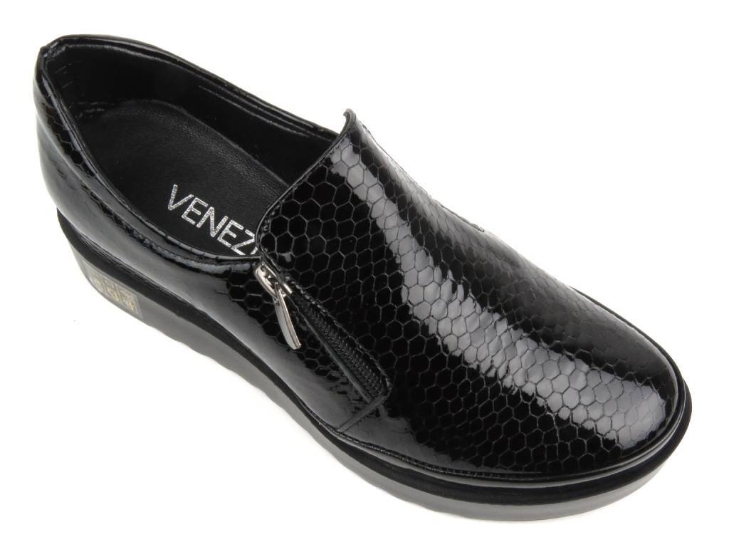 Półbuty damskie renomowanej marki VENEZIA wykonane zostały z wysokiej jakości skóry naturalnej lakierowanej w kolorze czarnym.