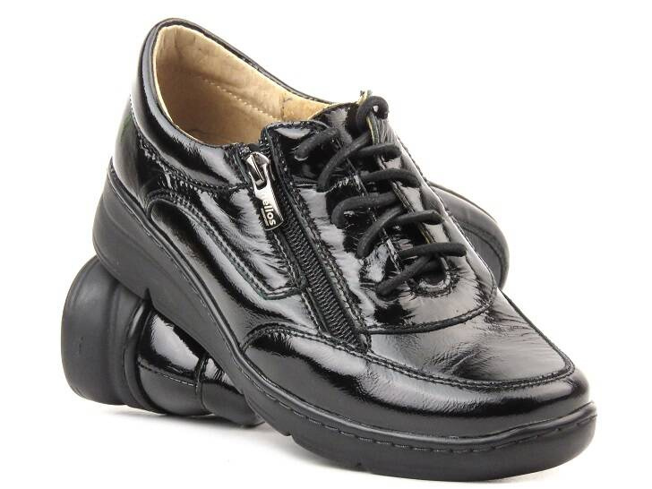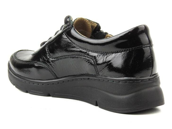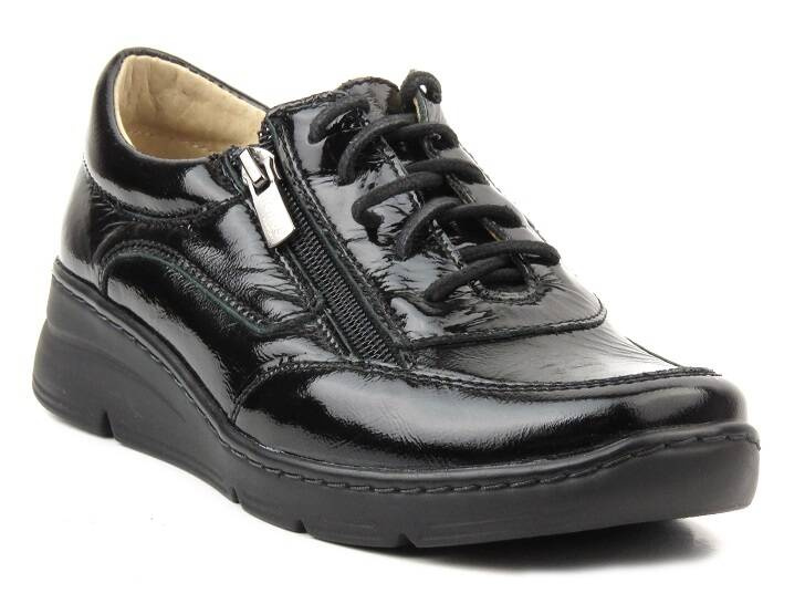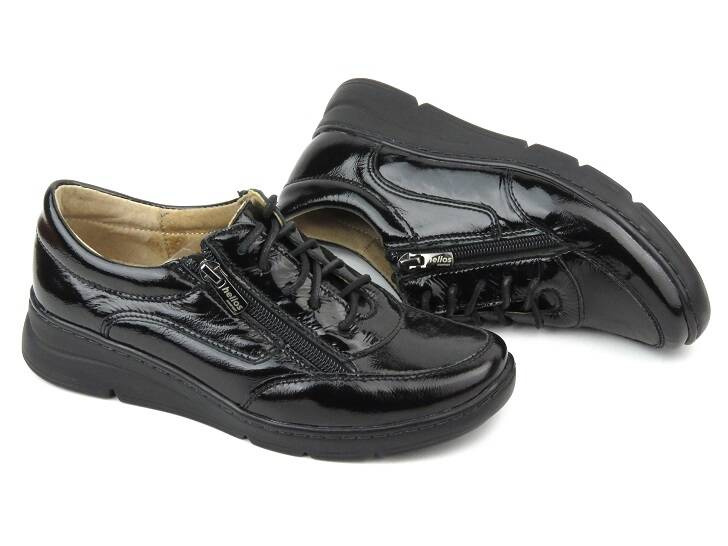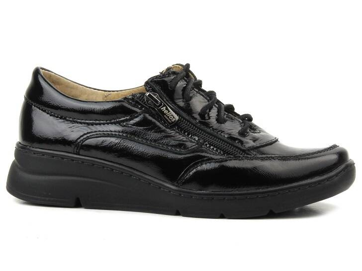Półbuty damskie cenionej polskiej marki Helios Komfort zostały wykonane z wysokiej jakości skóry naturalnej, lakierowanej w czarnym kolorze.