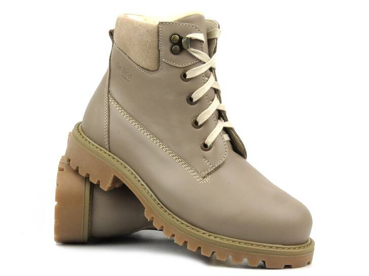 Wnętrze buta jest ocieplone jasną, naturalną wełną owczą, która zapewnia wysoki komfort cieplny i dopasowuje się do zimowego stylu obuwia.