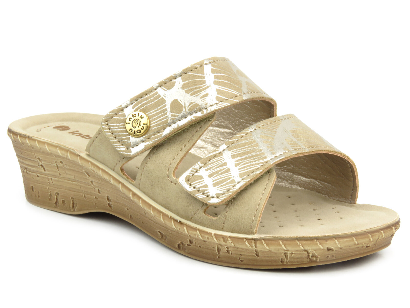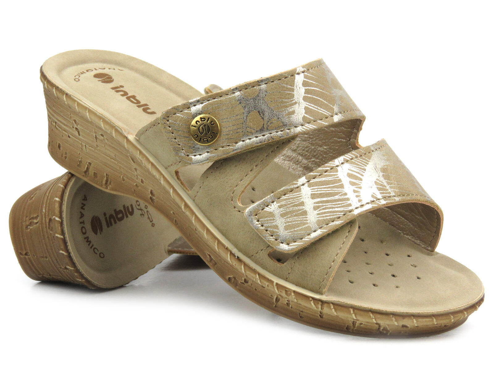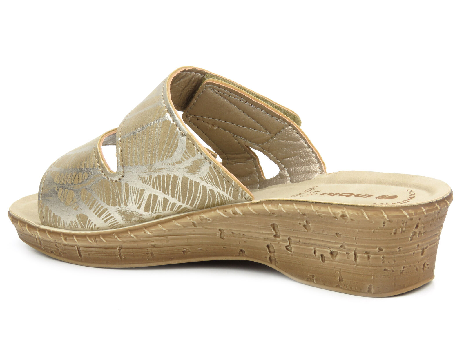 Klapki damskie renomowanej marki Inblu zostały wykonane z zewnątrz ze skóry ekologicznej w złotym odcieniu z połyskującym zdobieniem.