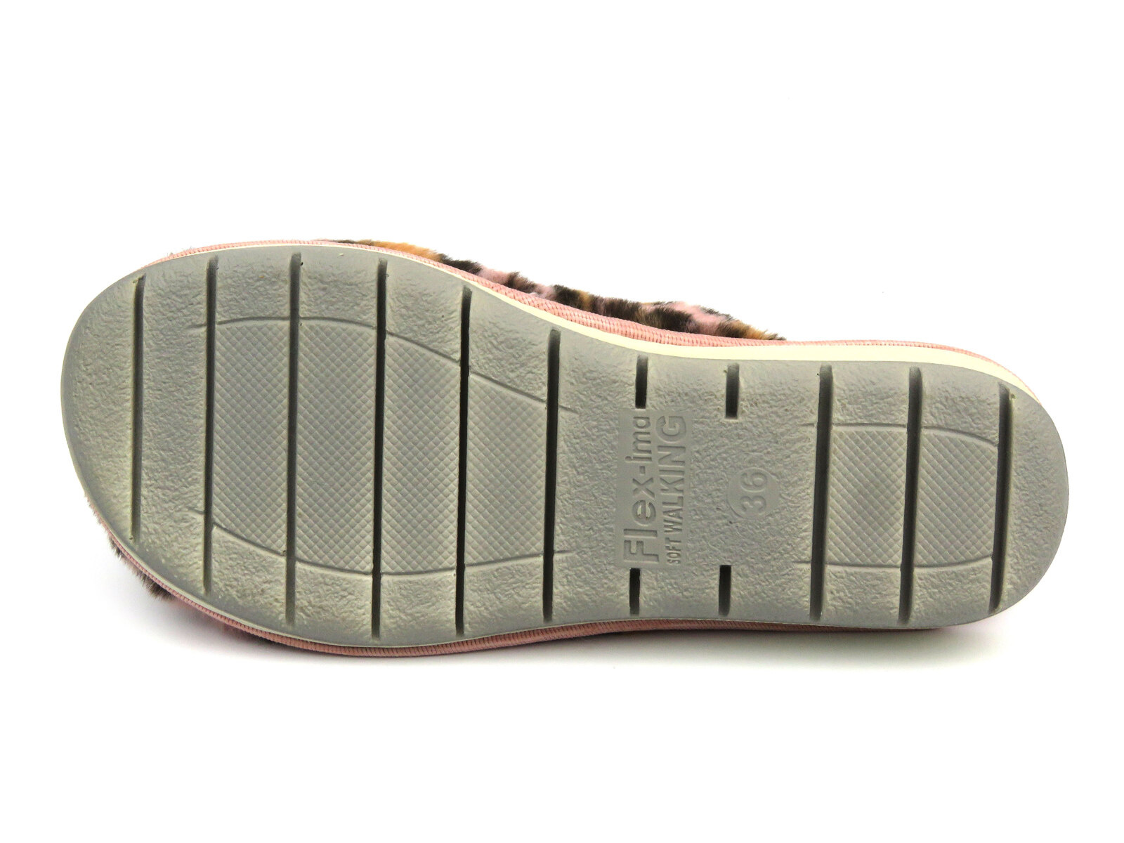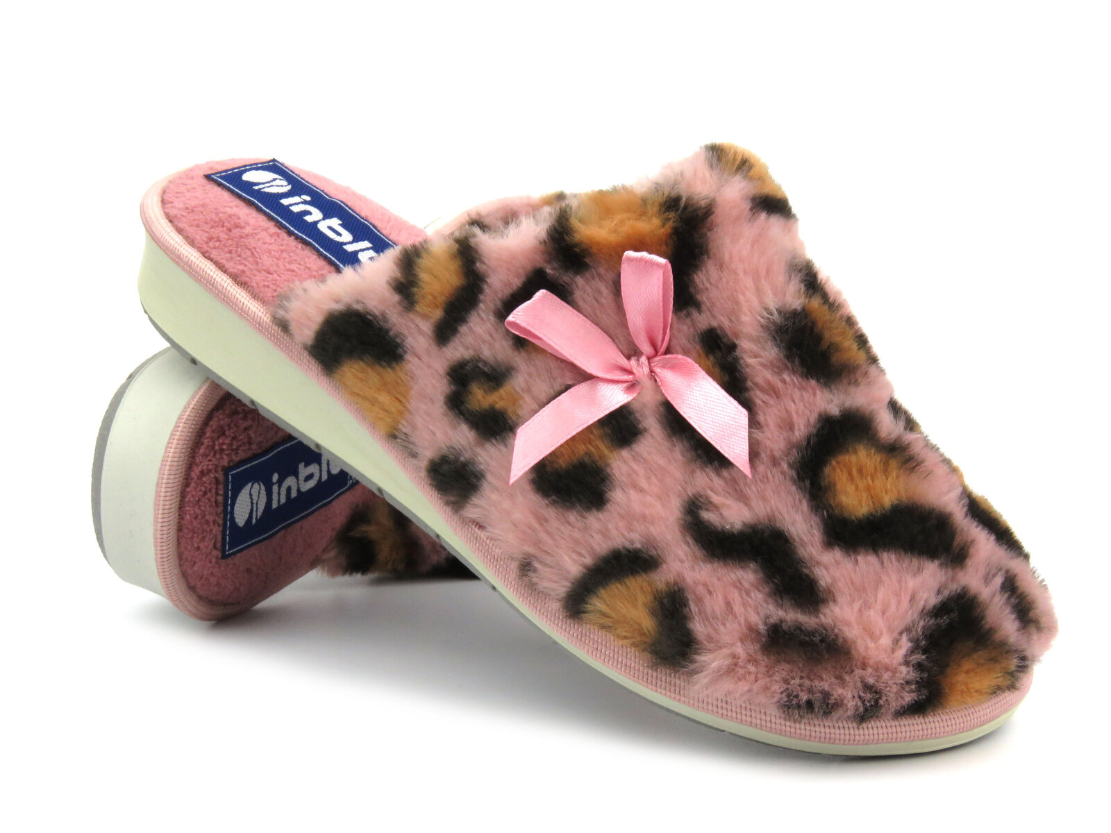 Różowe kapcie Inblu zdobi wzór w panterkę.