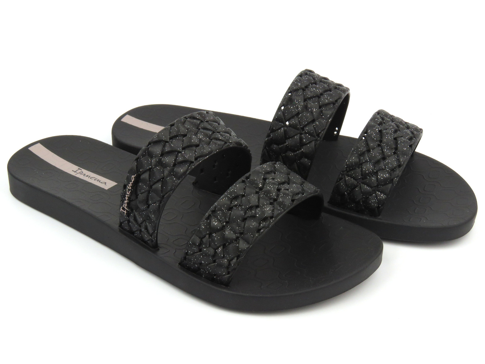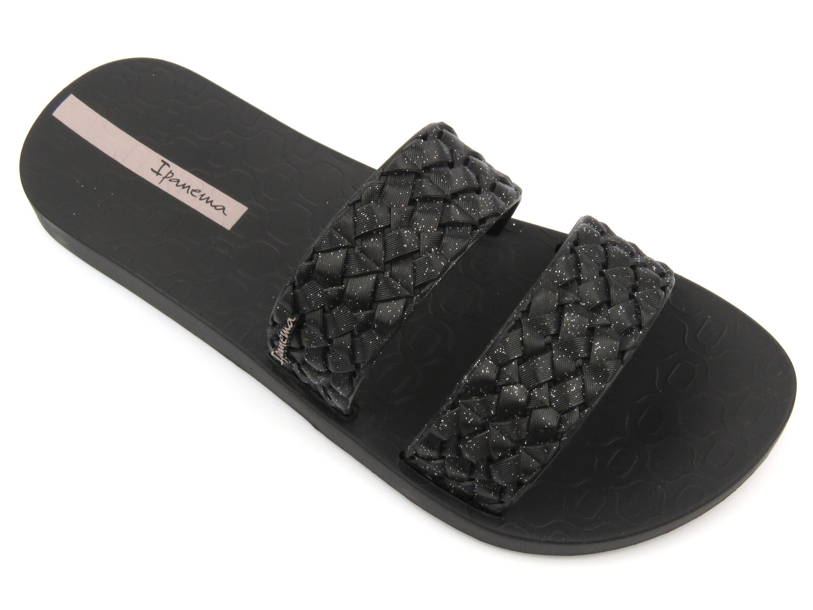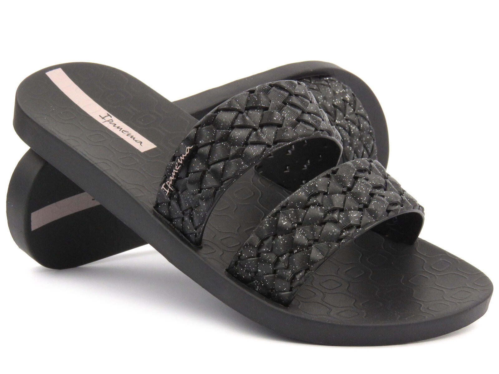 Wygodne klapki damskie z plecionymi paskami - Ipanema 83243, czarne brokatowe