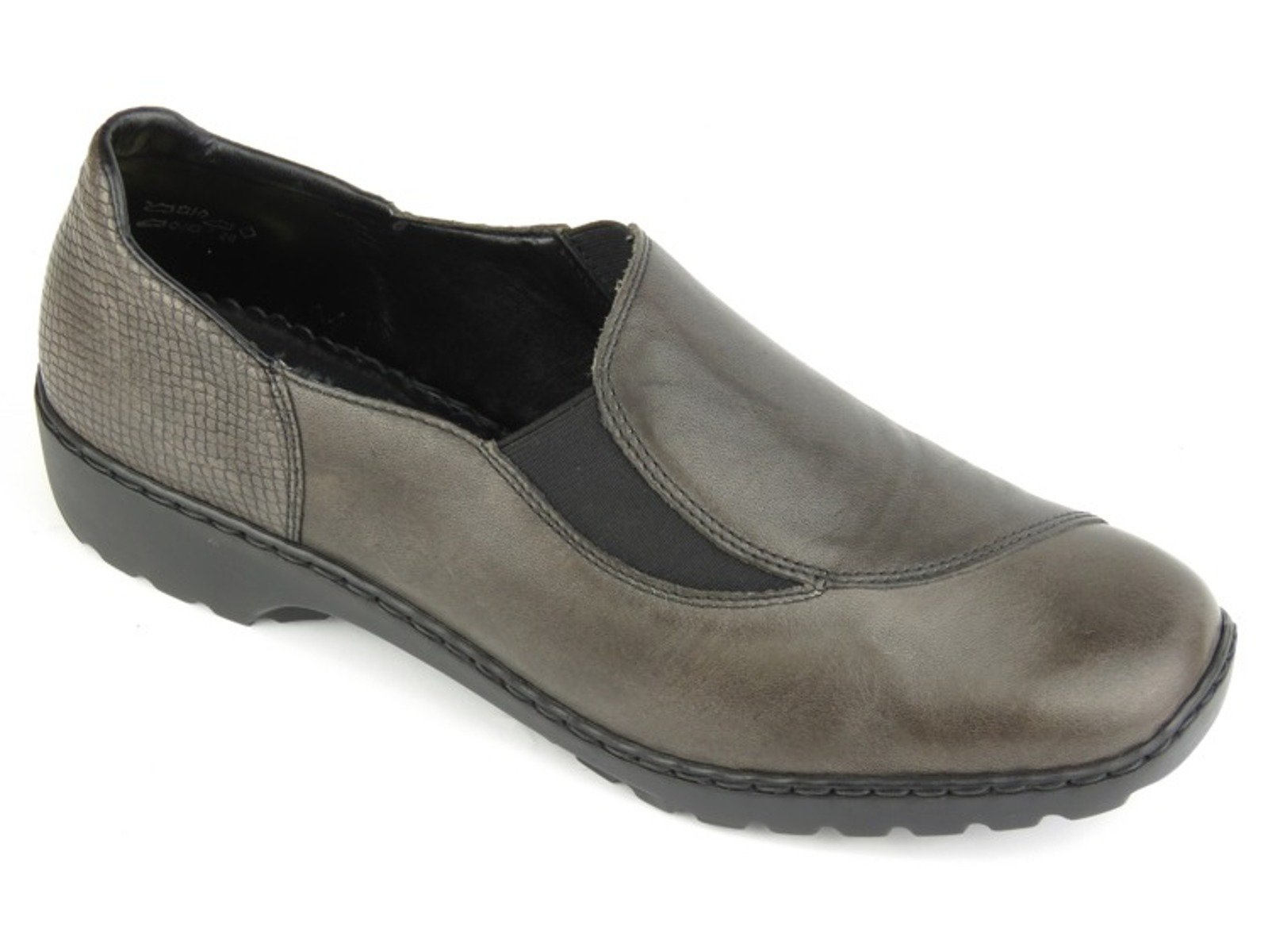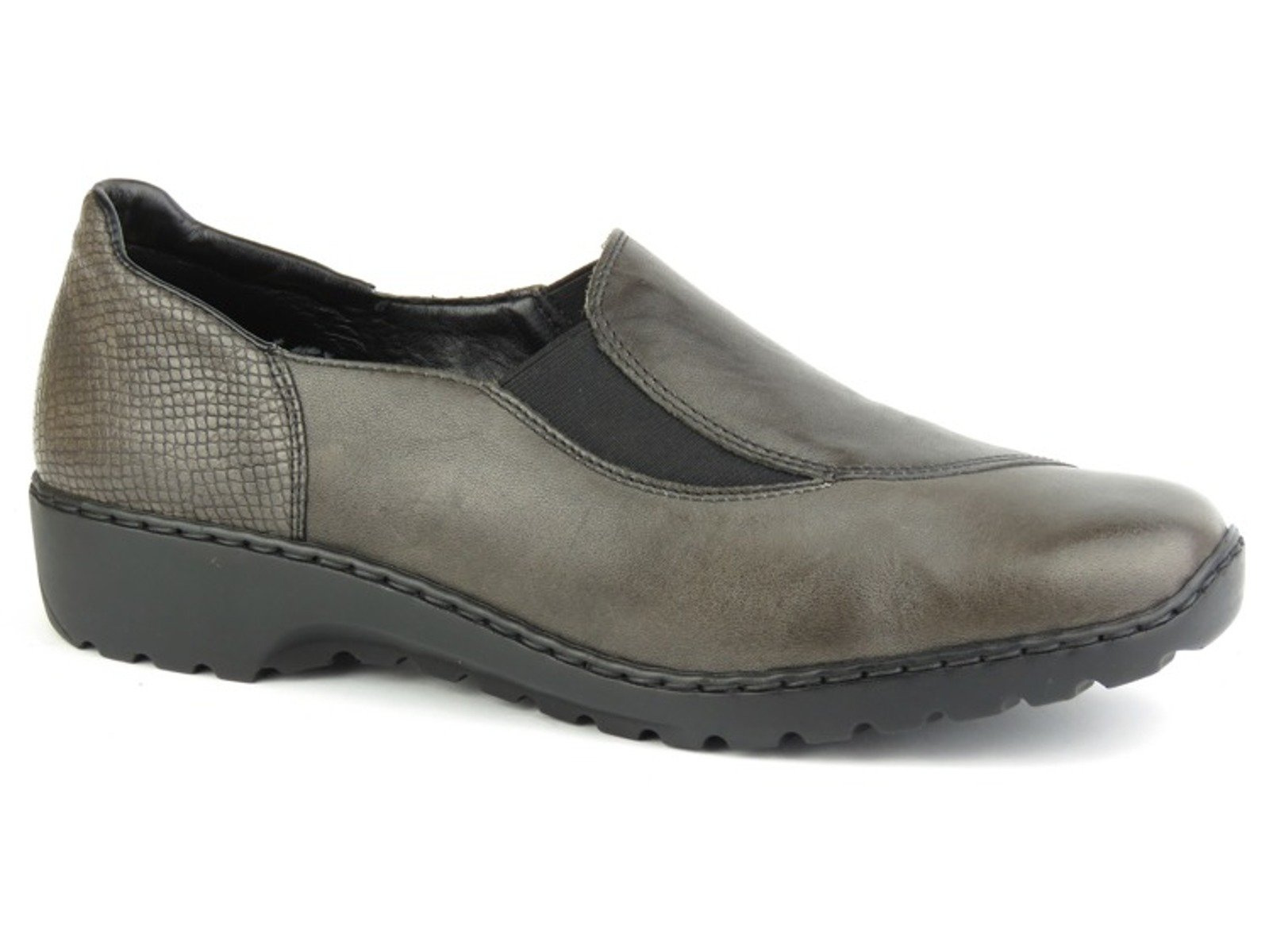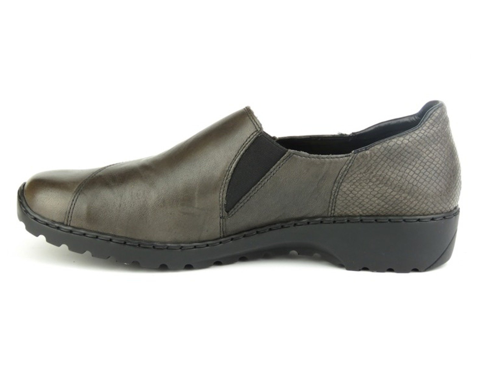 Półbuty damskie renomowanej marki Rieker zostały wykonane z wysokiej jakości skóry naturalnej licowej. Skórzana wkładka zapewnia odpowiedni komfort dla stóp. Lekka i elastyczna podeszwa ma właściwości antypoślizgowe. Dzięki wbudowanym gumom ściągającym, obuwie dopasowuje się do stopy. Model jest wyposażony w technologię Rieker Antistress, która amortyzuje wstrząsy powstałe w trakcie chodzenia.