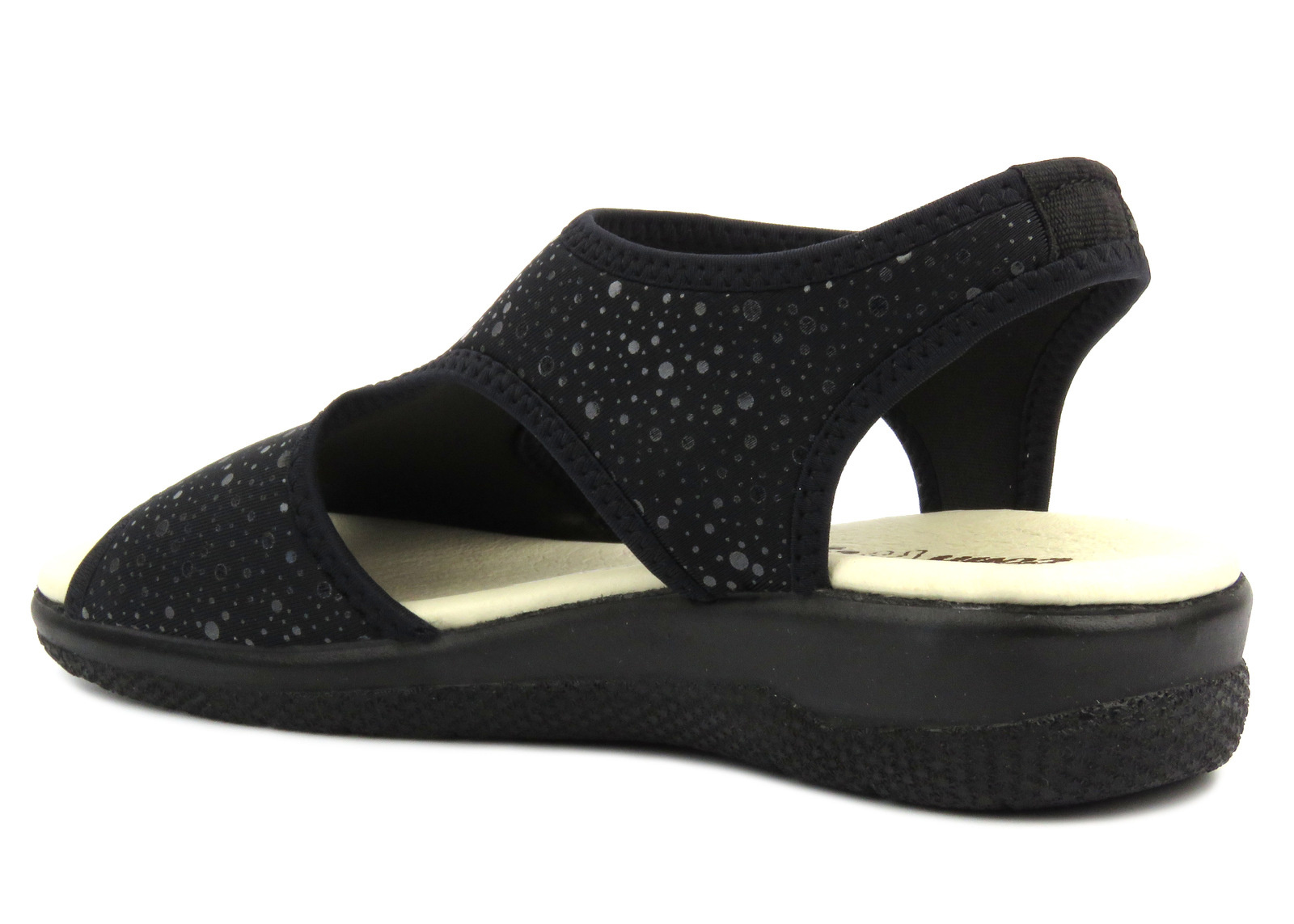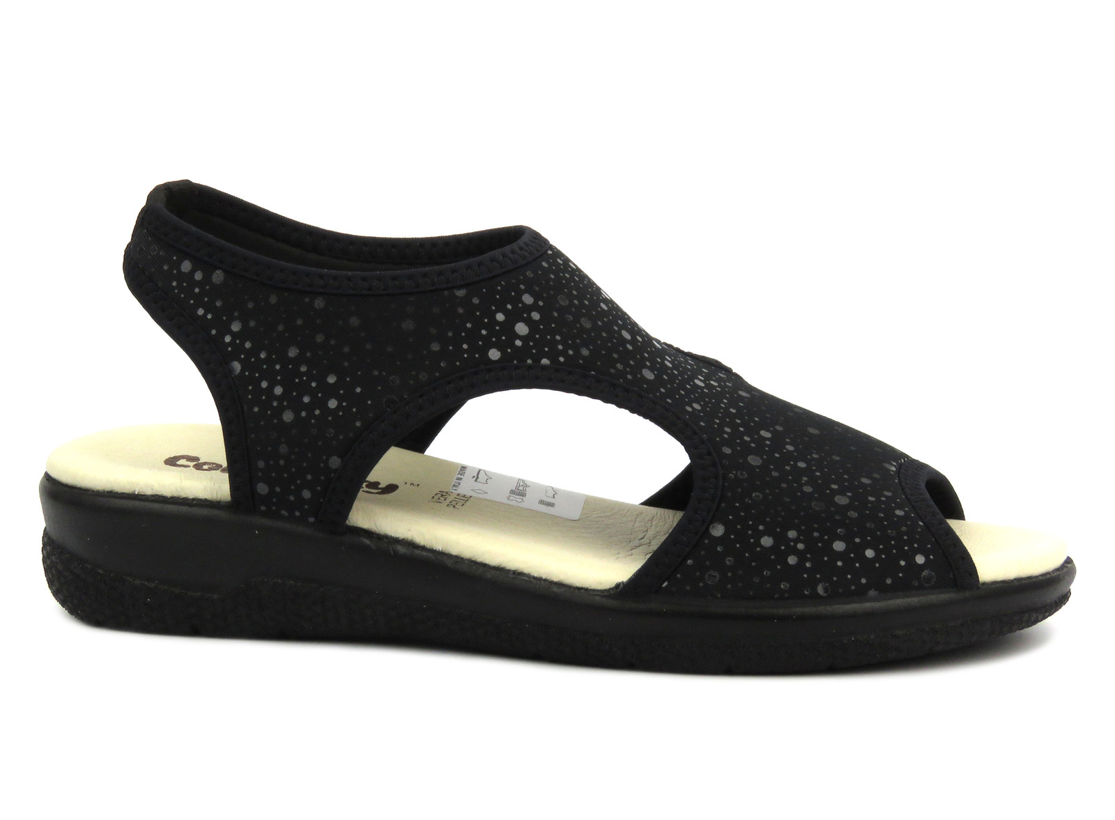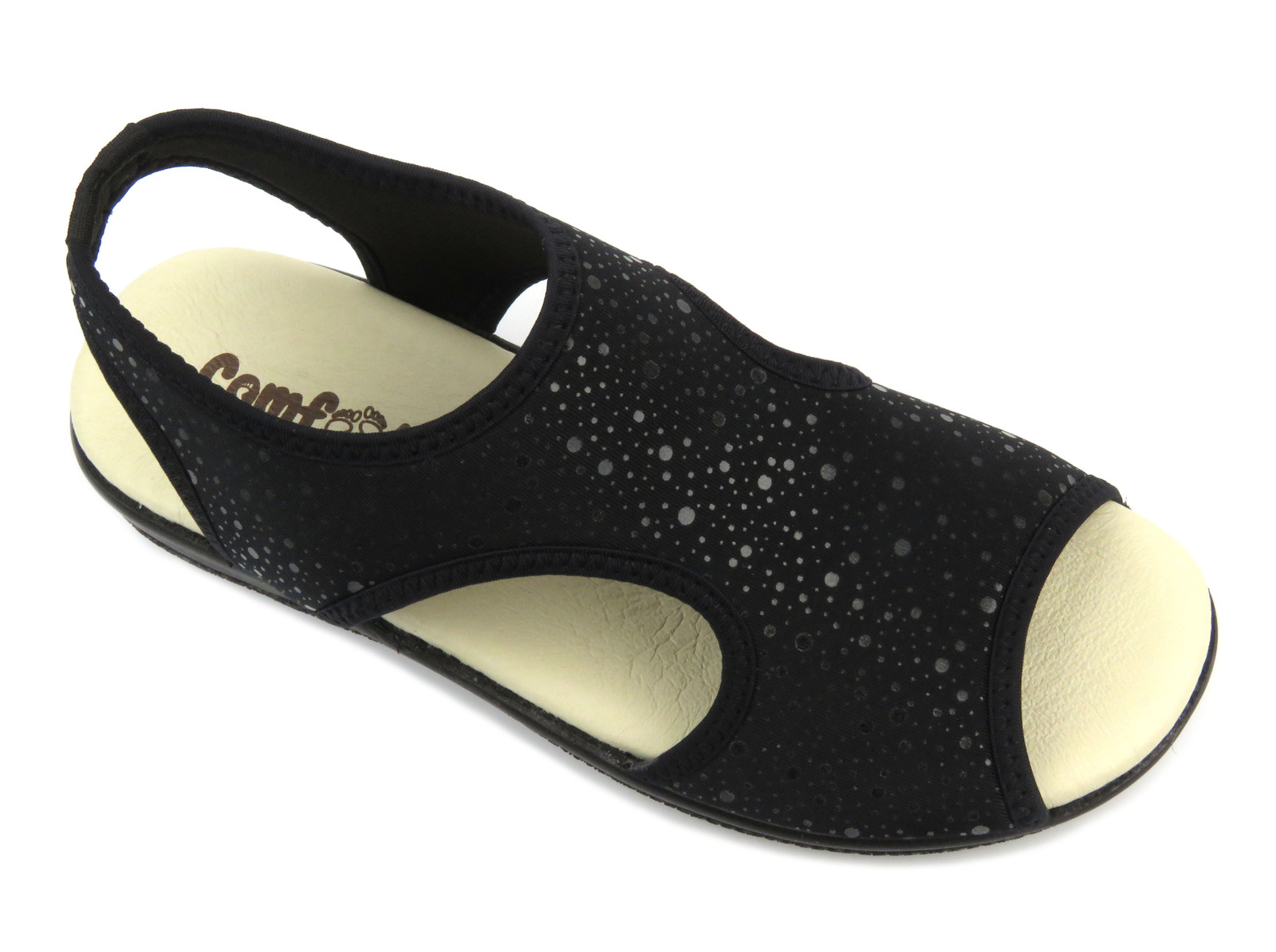 Sandały damskie marki Comfooty zostały wykonane z miękkiej tkaniny w kolorze czarnym.