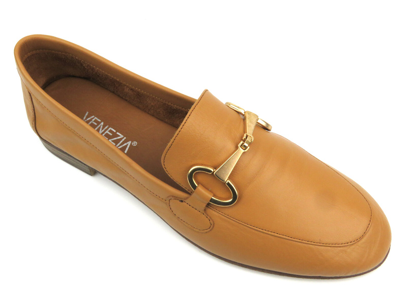 Loafersy damskie ze złotą ozdobą - VENEZIA E246, brązowe