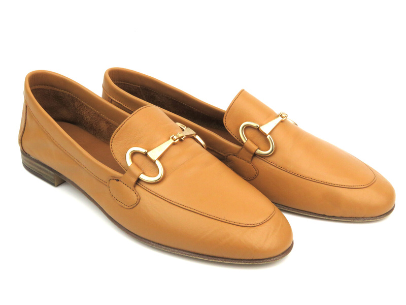Brązową cholewkę z okrągłym noskiem urozmaica złota ozdoba - horsebit loafers.