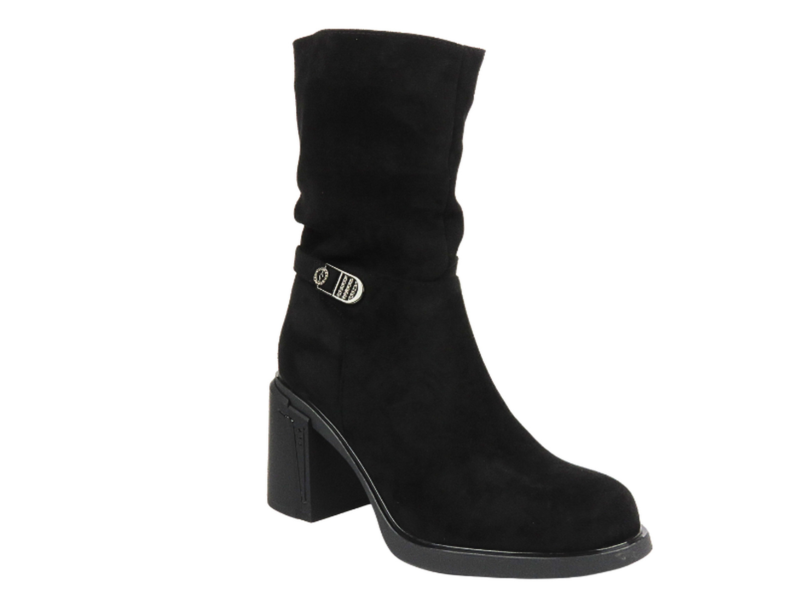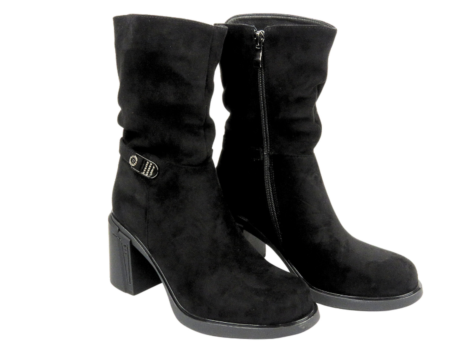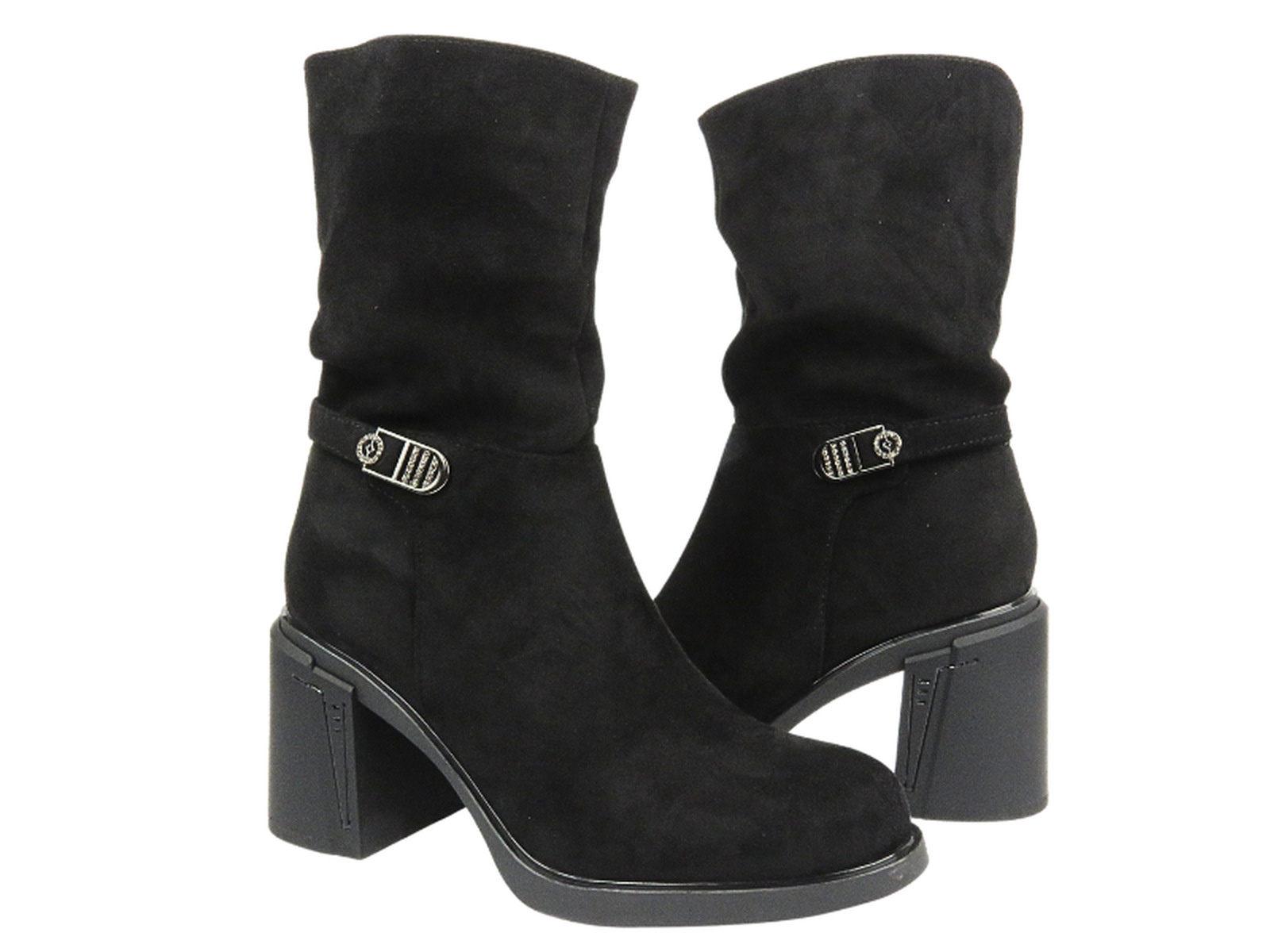 Potocki 24-60310 to eleganckie botki damskie na obcasie, stworzone z myślą o kobietach ceniących połączenie wygody i stylowego wykończenia. Wykonane z czarnej skóry ekologicznej o strukturze zamszu, zachwycają subtelnym wyglądem i wyrazistymi detalami. Uwagę przyciąga ozdobny pasek z cyrkoniami, który dodaje botkom blasku i charakteru.
