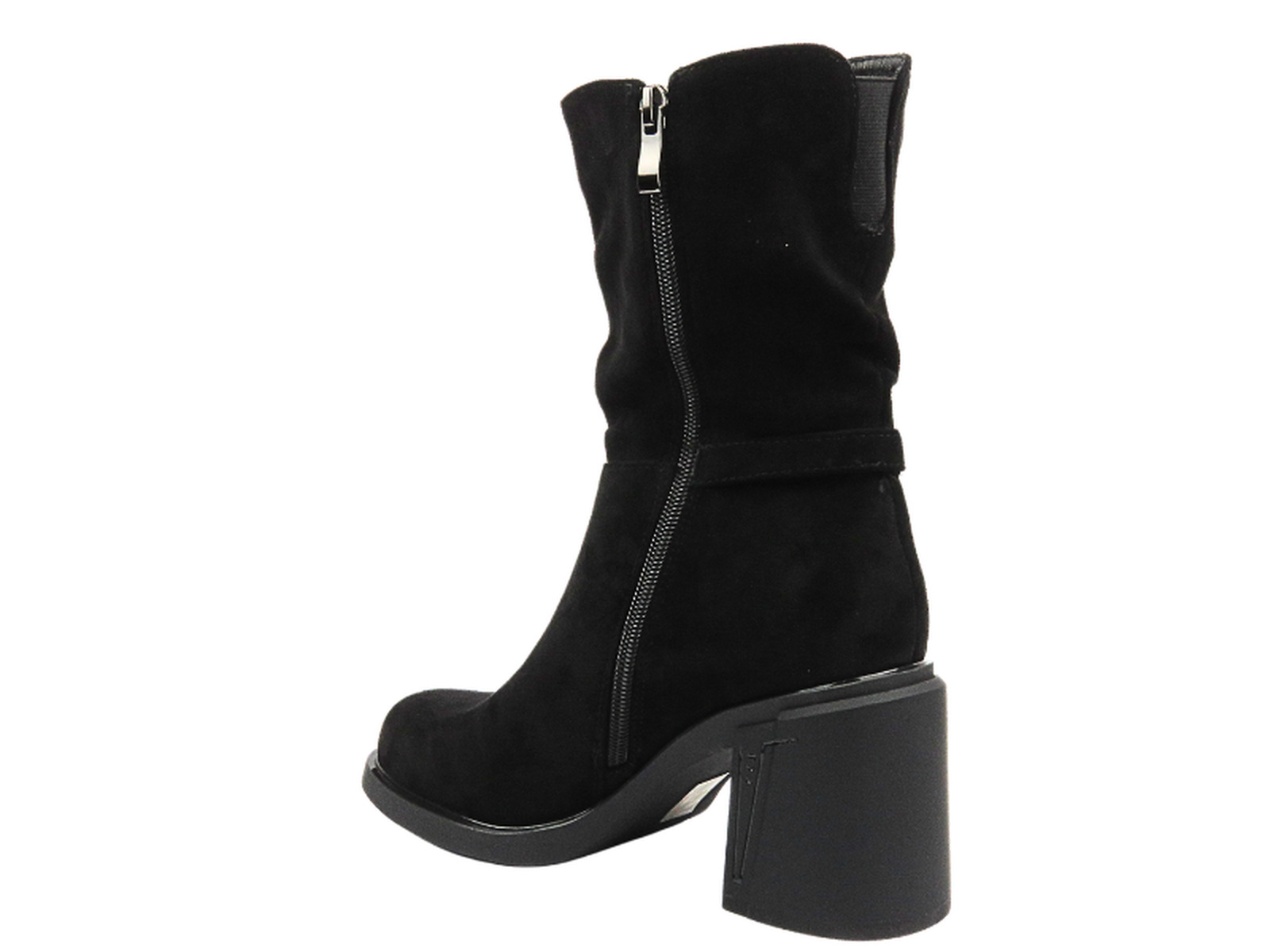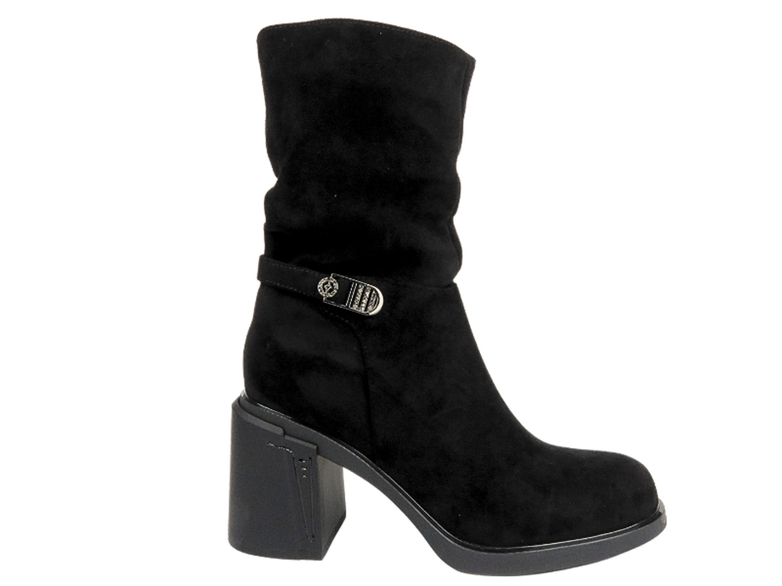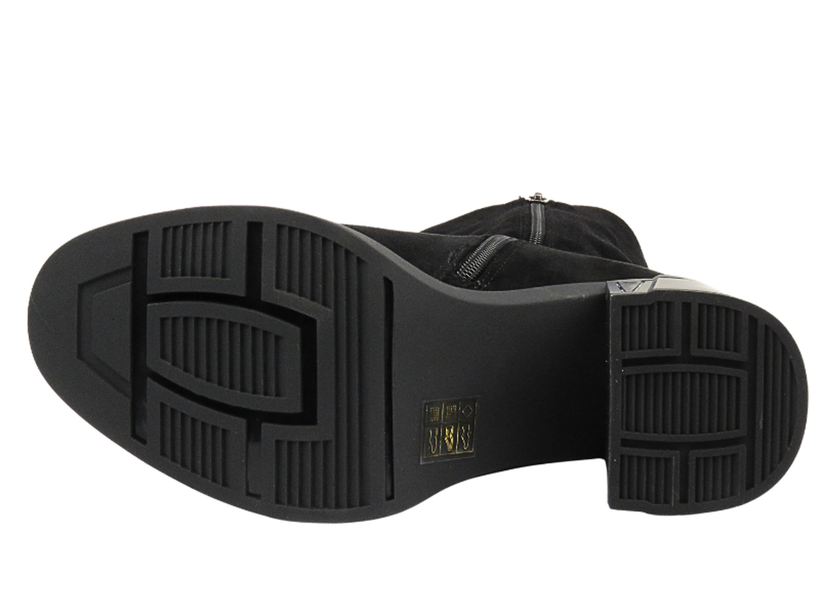 Potocki 24-60310 to eleganckie botki damskie na obcasie, stworzone z myślą o kobietach ceniących połączenie wygody i stylowego wykończenia. Wykonane z czarnej skóry ekologicznej o strukturze zamszu, zachwycają subtelnym wyglądem i wyrazistymi detalami. Uwagę przyciąga ozdobny pasek z cyrkoniami, który dodaje botkom blasku i charakteru.