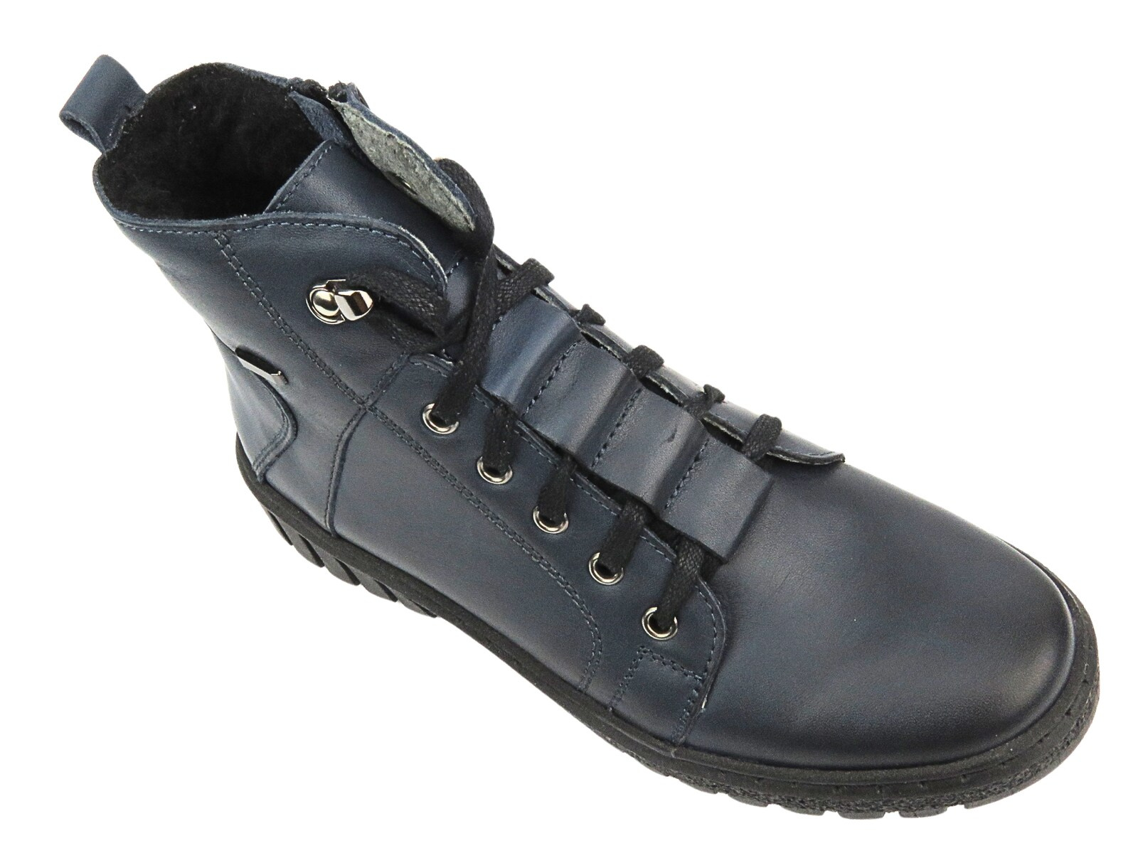 Gładka cholewka traperów Helios w odcieniu granatu będzie pasowała do wielu stylizacji.