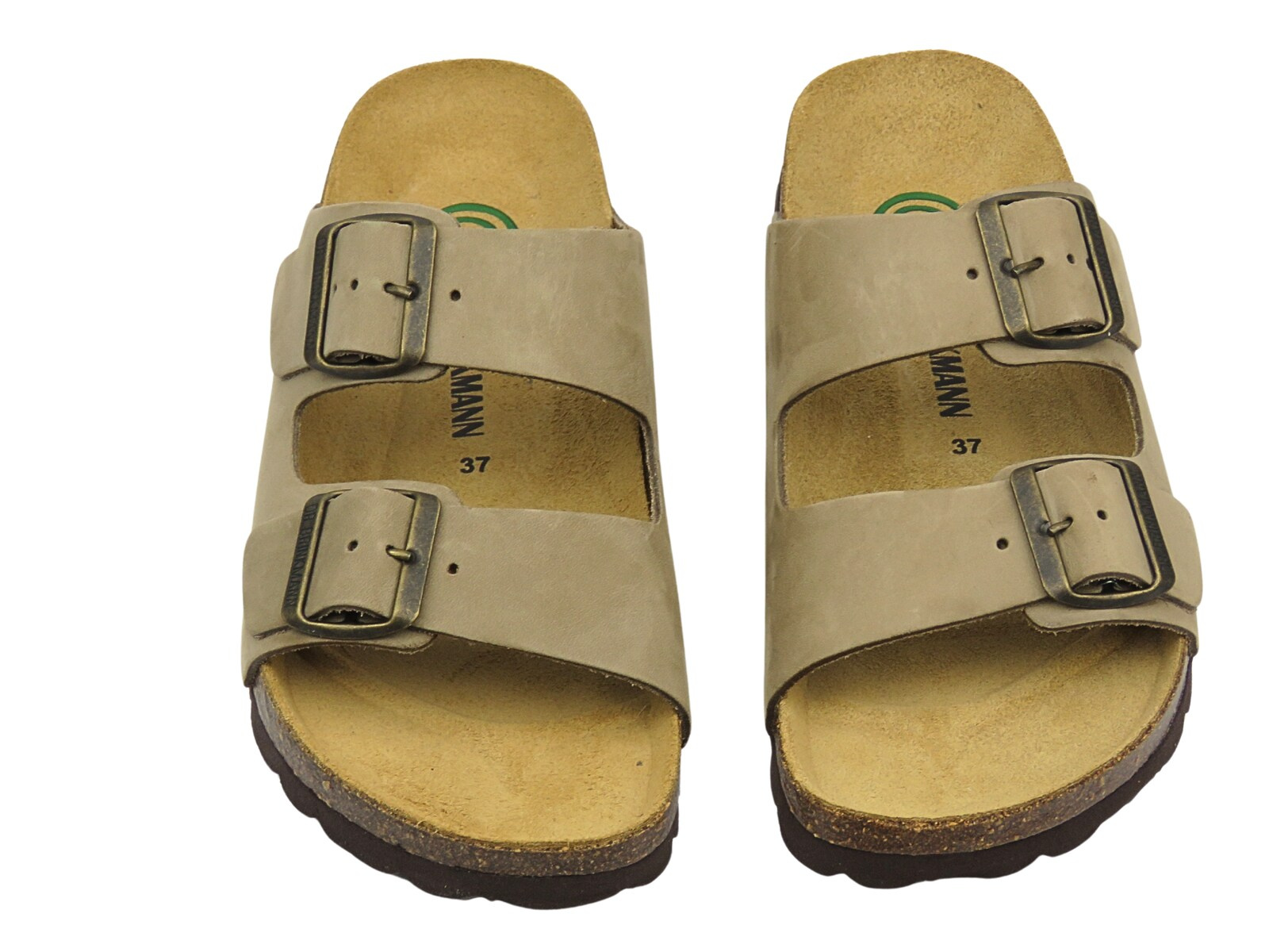 Klapki damskie marki Brinkmann zostały wykonane ze skóry naturalnej w kolorze beżowym.