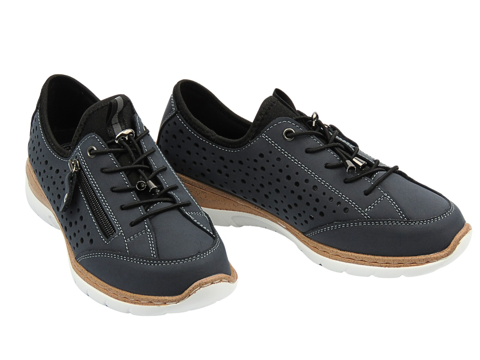 Boczne zapięcie na zamek ułatwia szybkie zakładanie i zdejmowanie obuwia, podczas gdy klasyczne sznurowanie pozwala na precyzyjne dopasowanie do indywidualnego kształtu stopy. Wnętrze wykończone miękką podszewką i wkładką z materiałów przyjaznych dla skóry zwiększa komfort użytkowania. Amortyzująca podeszwa z elastycznego tworzywa o korkowym wykończeniu dodaje butom lekkości i sportowego stylu, jednocześnie zapewniając stabilność i przyczepność. To idealne półbuty na każdy dzień – wygodne, funkcjonalne i stylowe, odpowiednie zarówno do pracy, jak i na spacer.