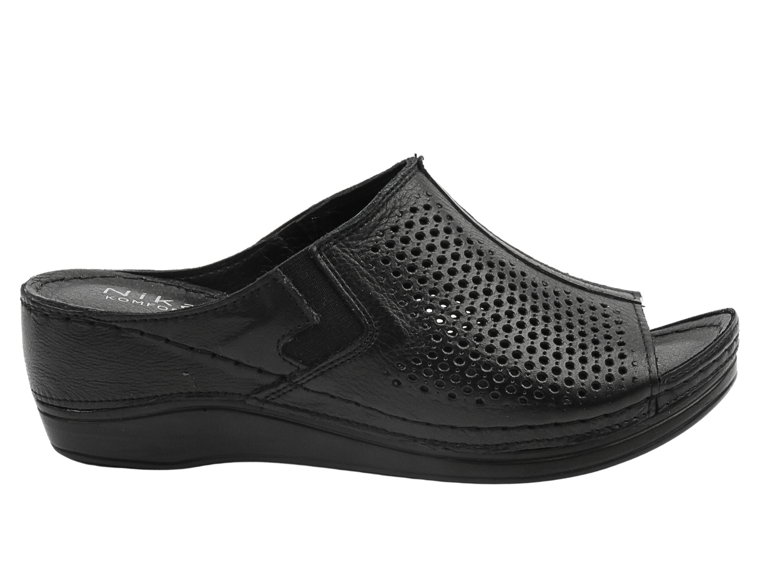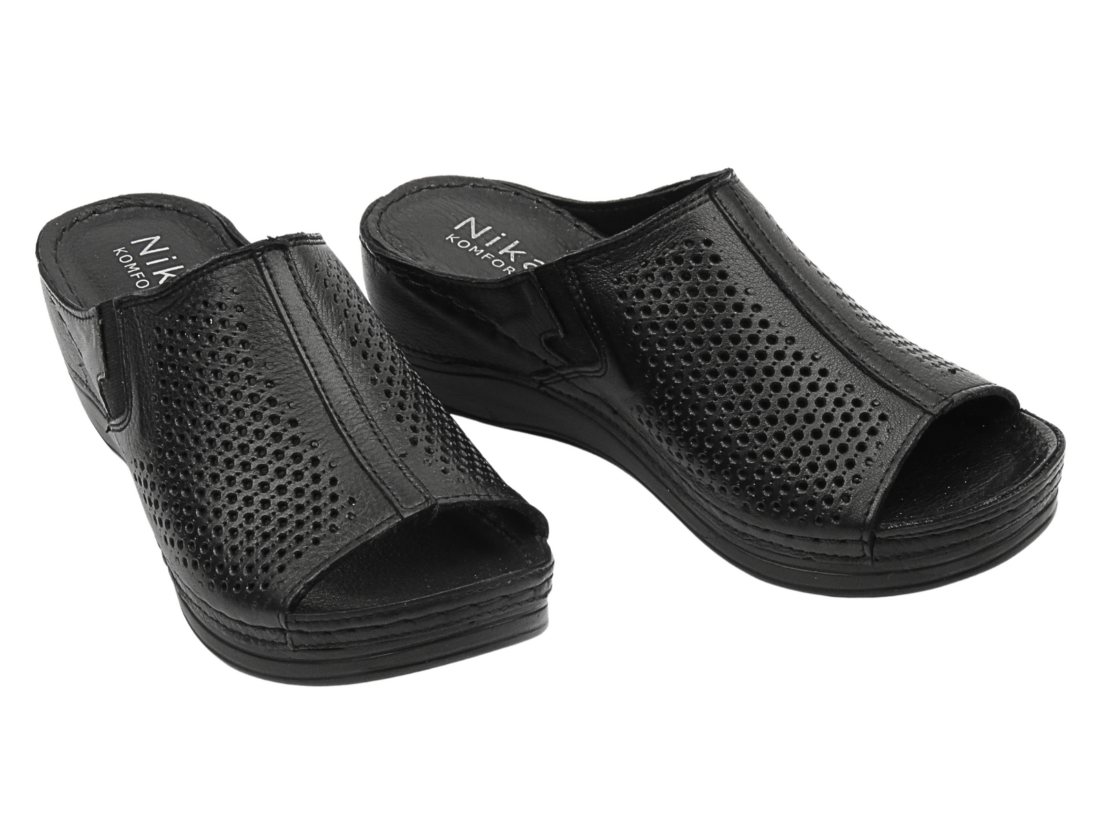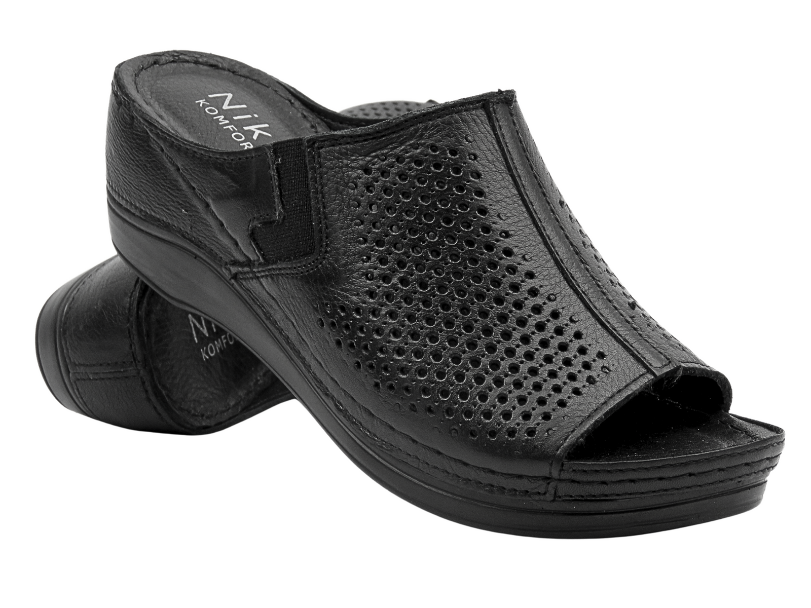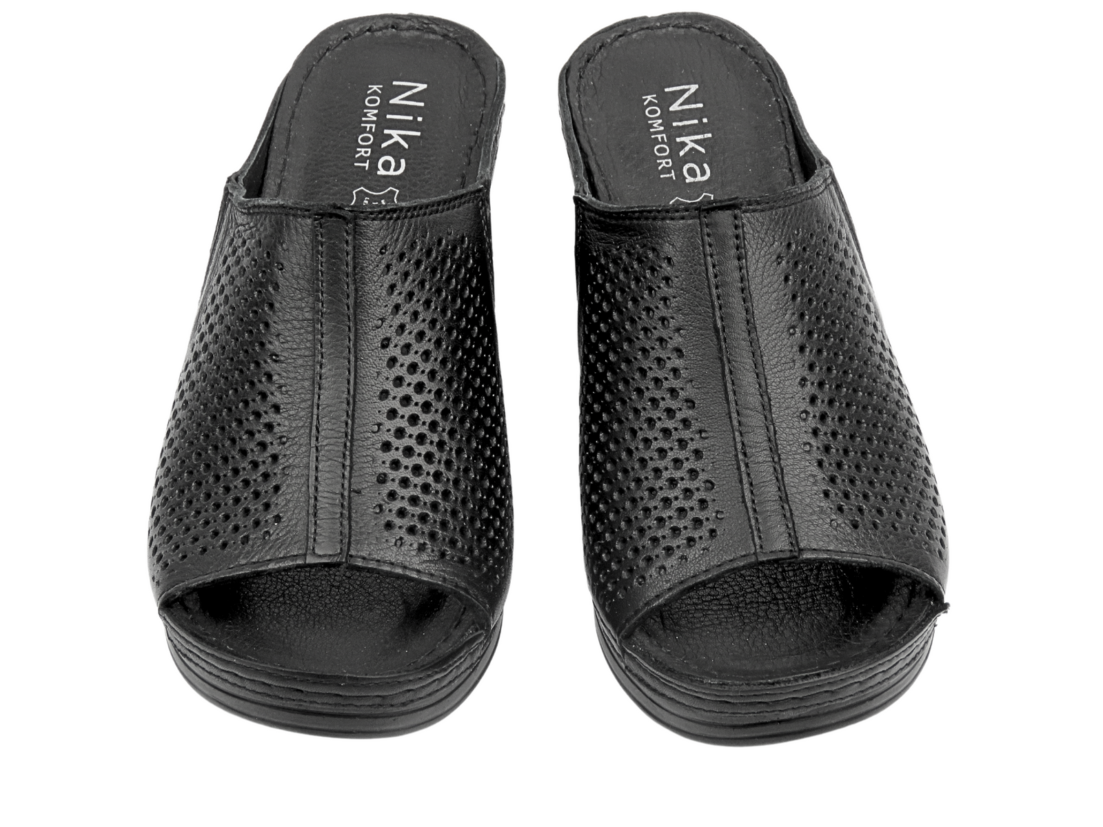Skórzane klapki damskie na koturnie - Nika Komfort H-157, czarne