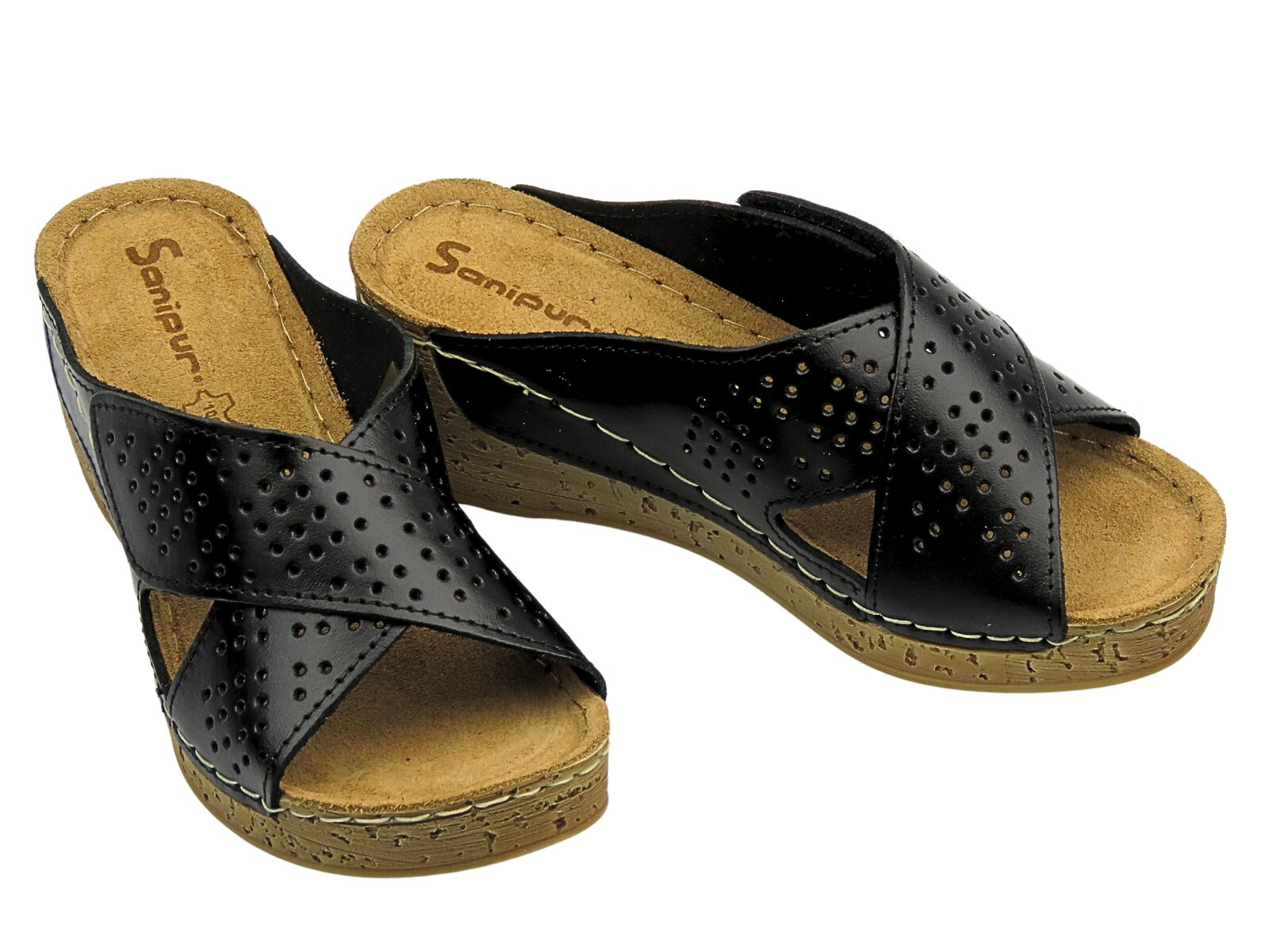 Stylowe i wygodne klapki damskie marki Sanipur, wykonane z wysokiej jakości naturalnej skóry licowej w eleganckim czarnym kolorze.