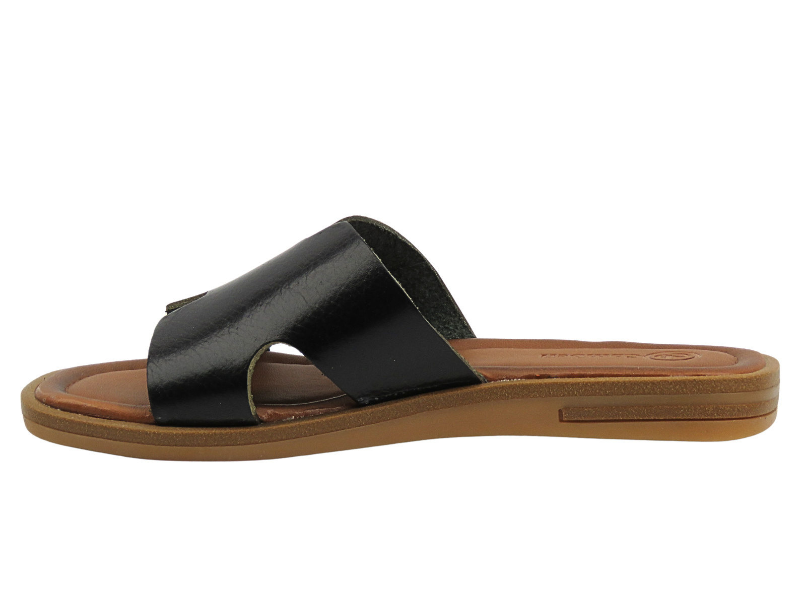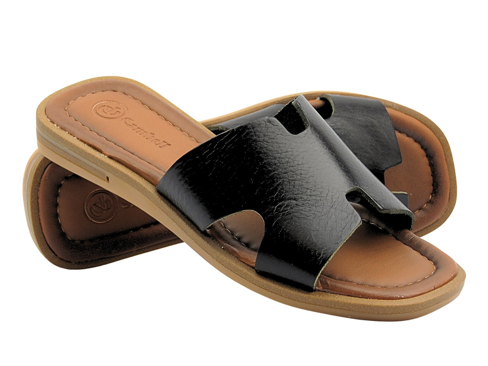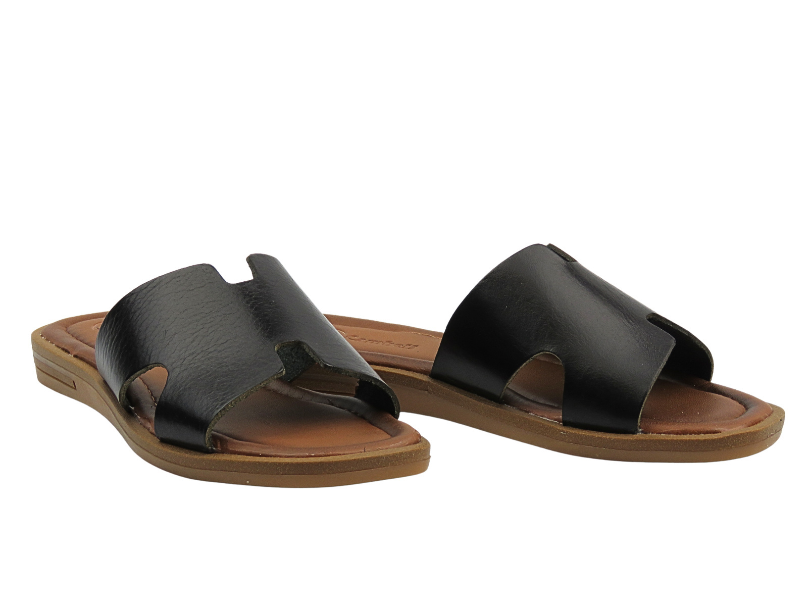 Klapki damskie Cambell, wykonane w całości z naturalnej skóry, zachwycają nie tylko jakością, ale również ponadczasowym designem. Ich szeroka, jednolita cholewka subtelnie okrywa stopę, tworząc harmonijne połączenie elegancji i codziennego komfortu.