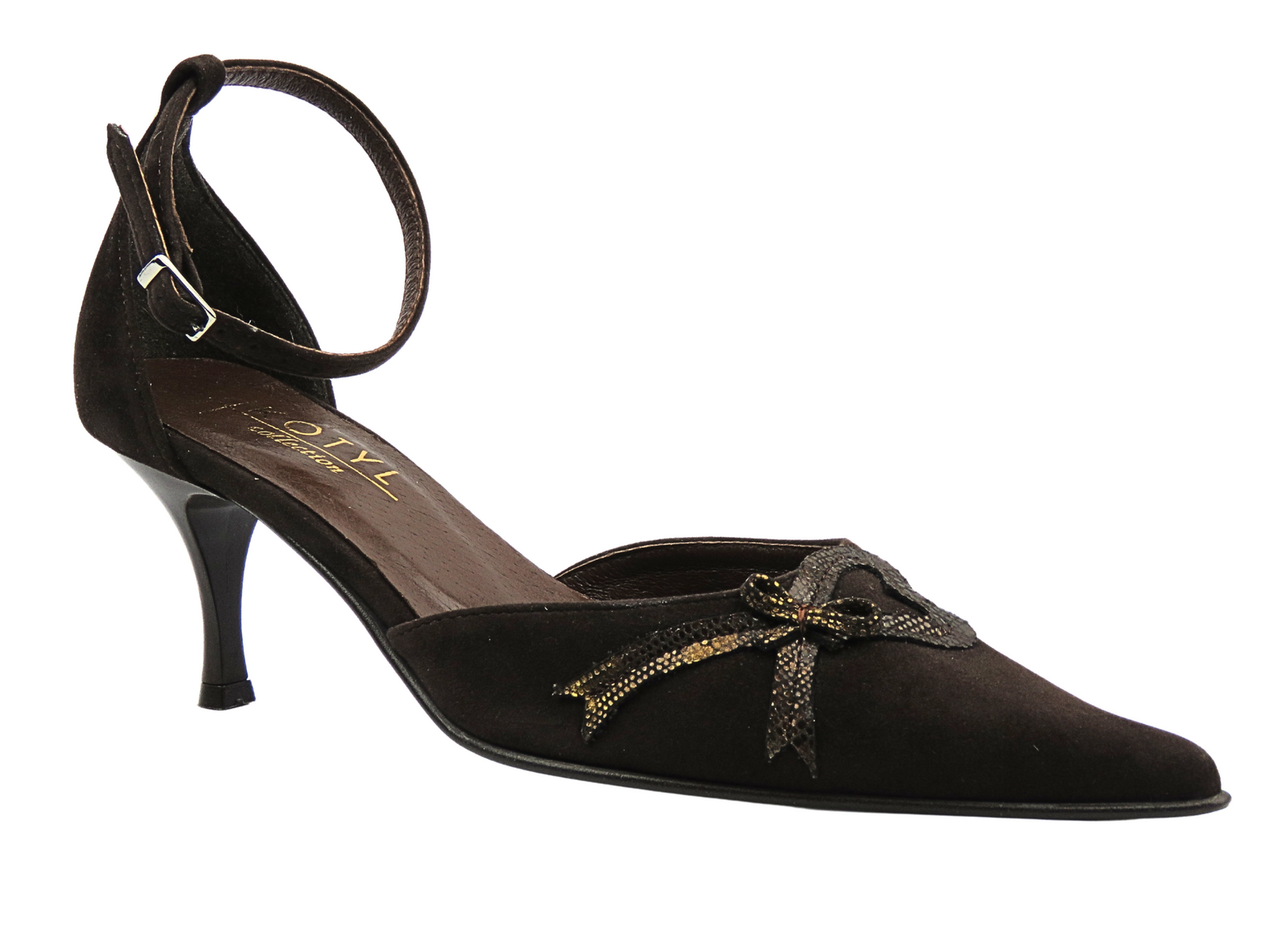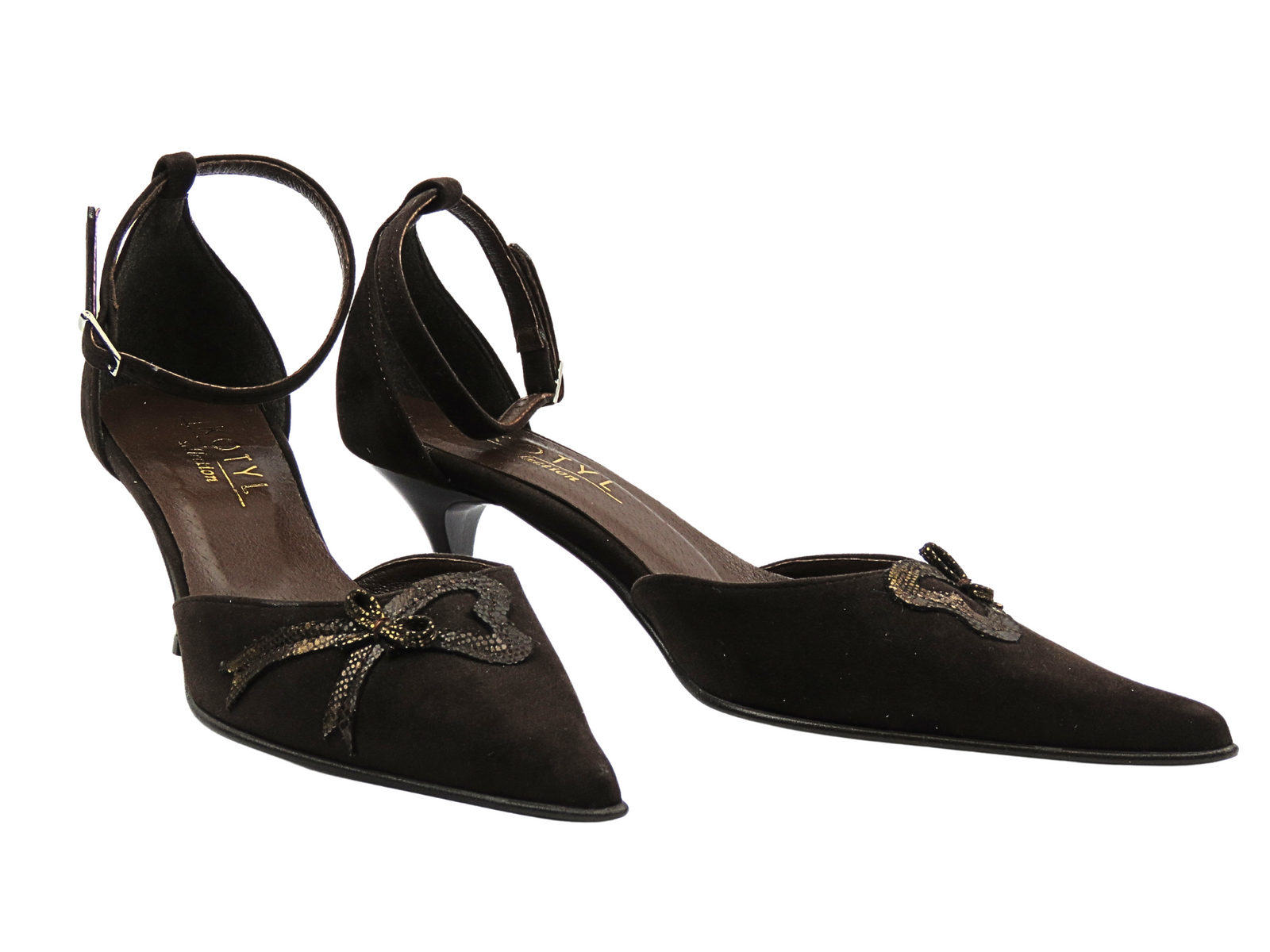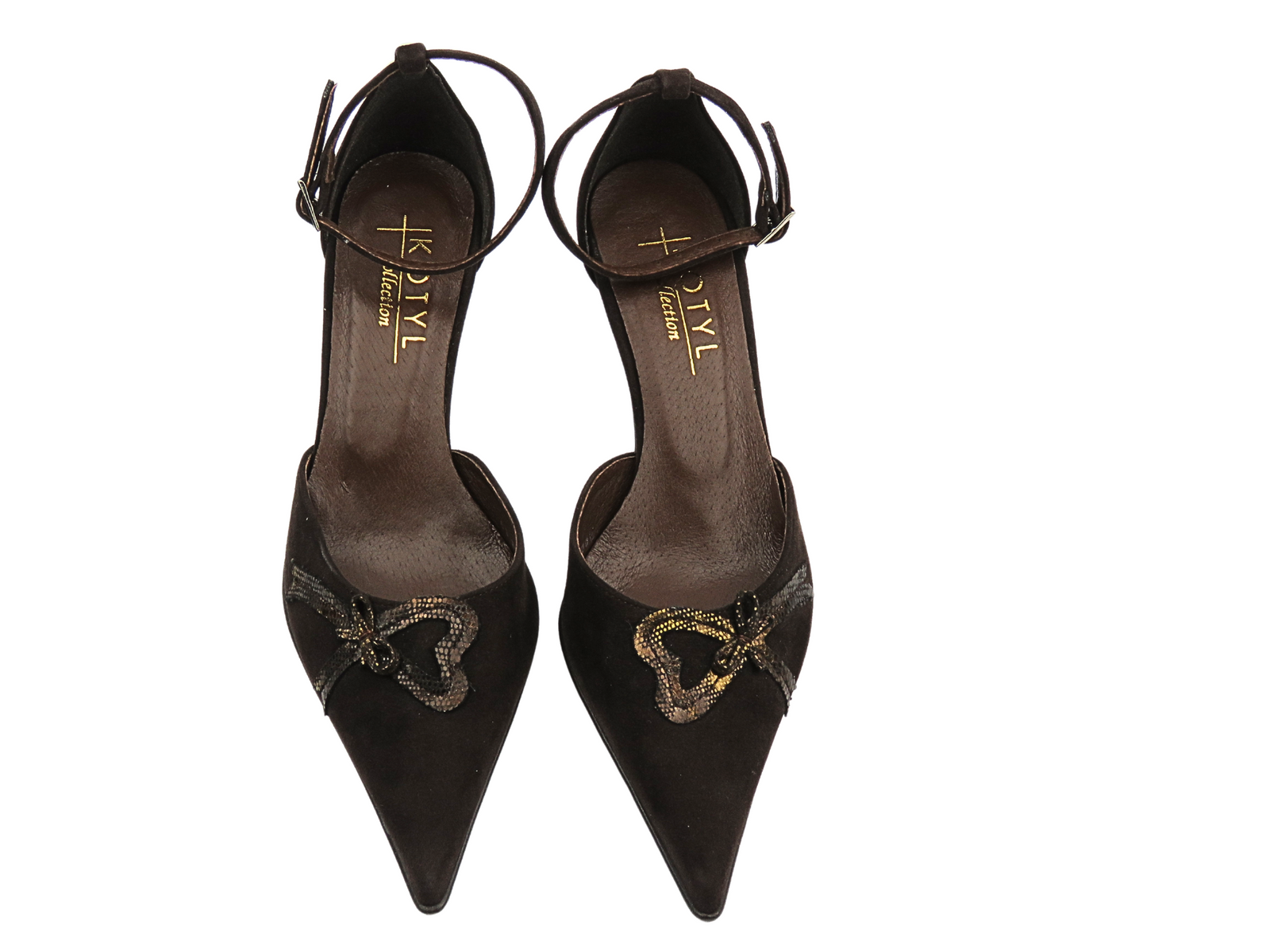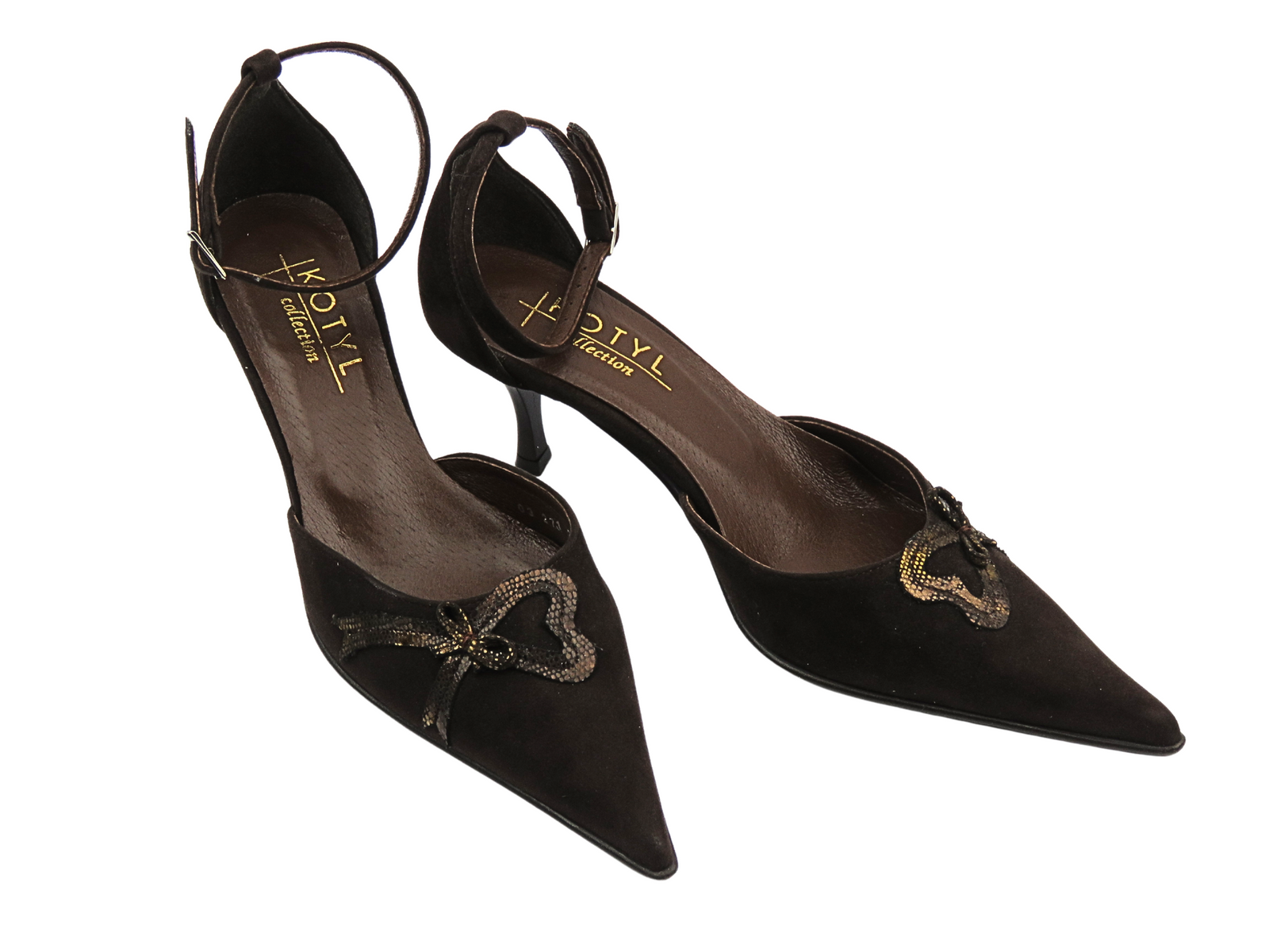 Czółenka na szpilce KOTYL 271 w kolorze brązowym to wyjątkowe połączenie subtelnego szyku z romantycznym detalem. Ich delikatna forma z wydłużonym noskiem pięknie wysmukla stopę, a ozdobna kokardka z błyszczącym serduszkiem dodaje uroku i kobiecej lekkości. Pasek z klamerką otulający kostkę zapewnia nie tylko efektowny wygląd, ale również stabilizację i idealne dopasowanie. To model, który sprawdzi się zarówno podczas eleganckich przyjęć, jak i w stylizacjach na co dzień dla kobiet, które cenią nienachalną elegancję.