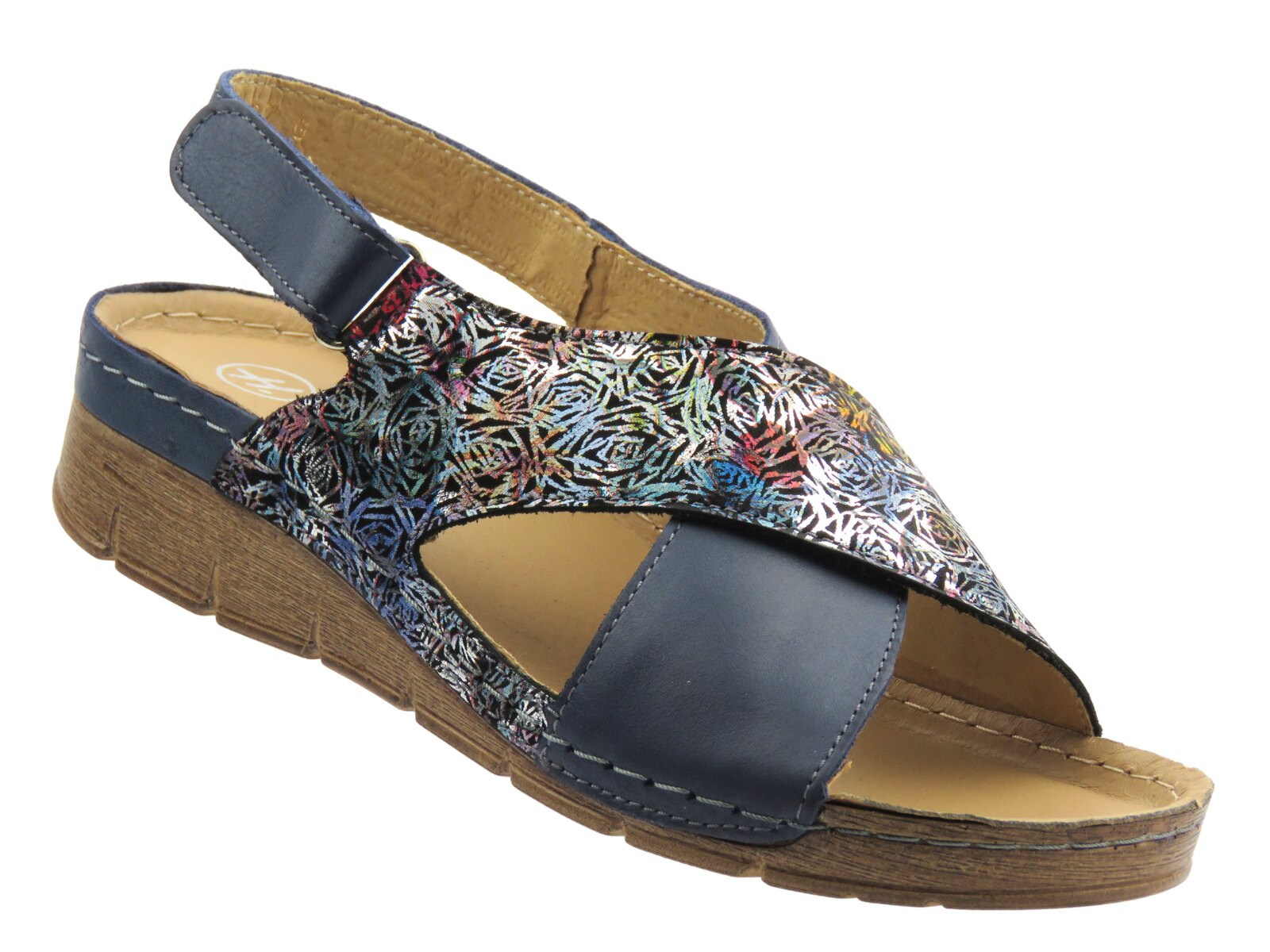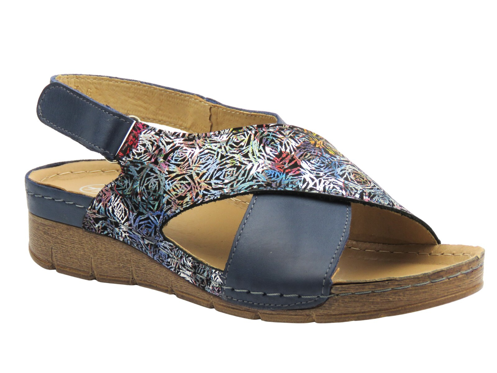 Skórzane sandały damskie Helios Komfort 253, granatowe, ze skrzyżowanymi paskami