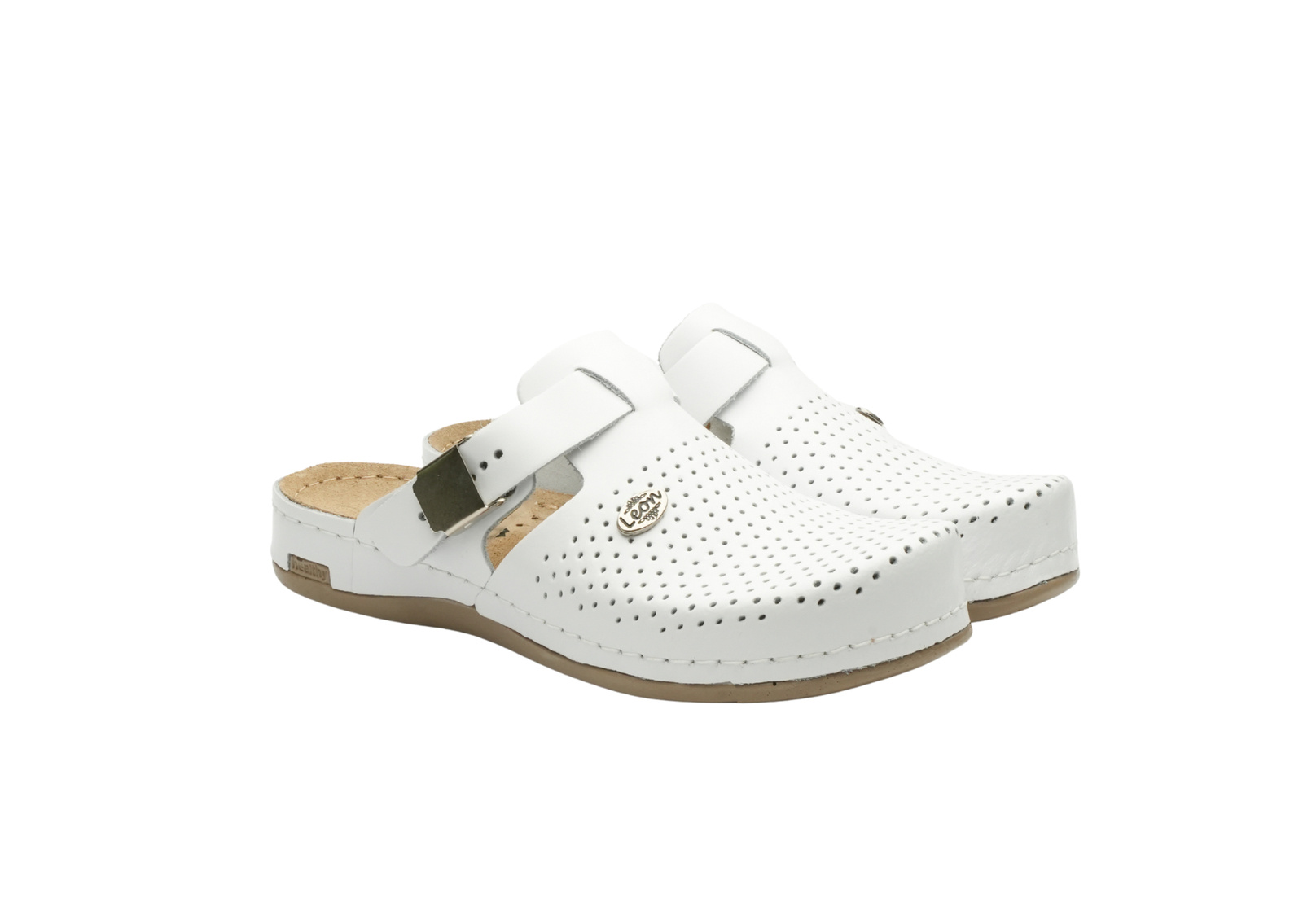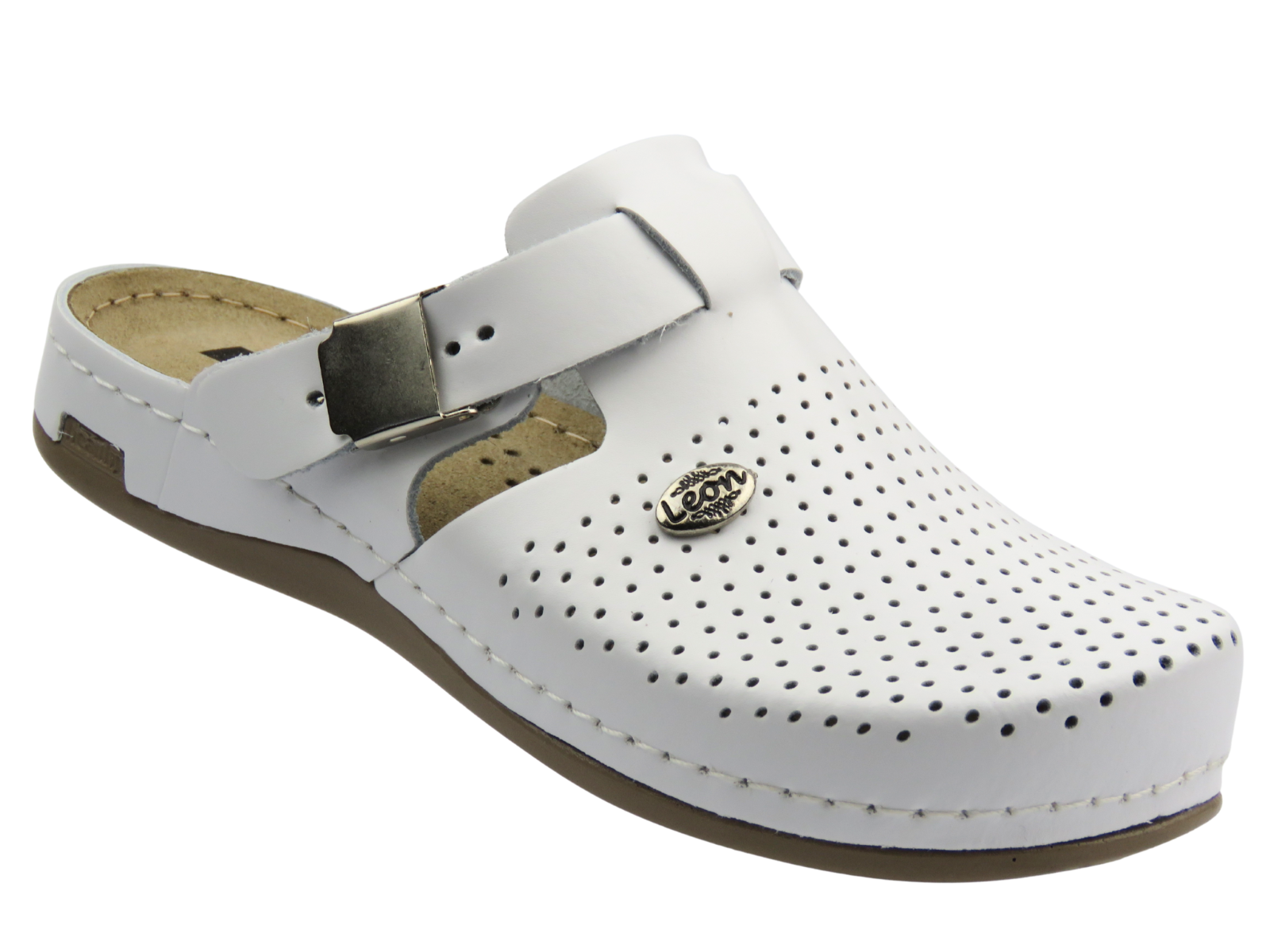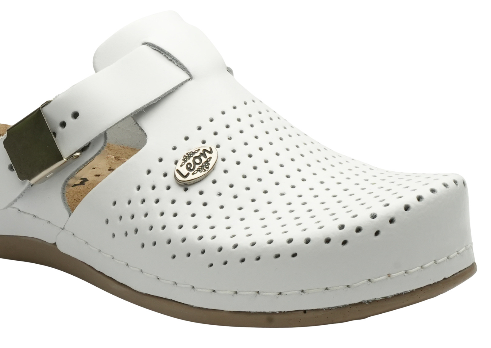 Model Leon 950 to klasyczne zabudowane klapki w ponadczasowym białym kolorze, które doskonale łączą elegancję z codzienną funkcjonalnością.