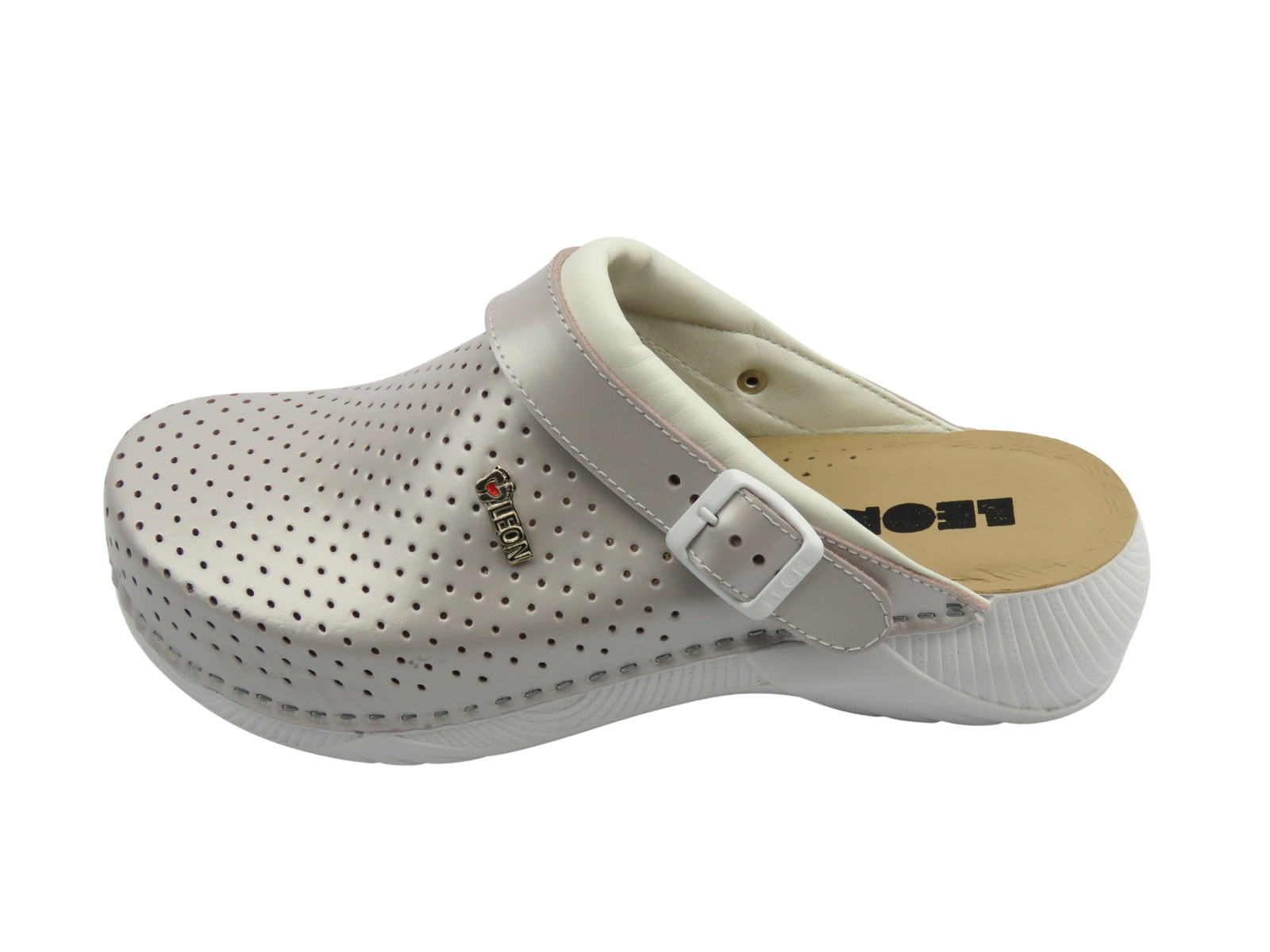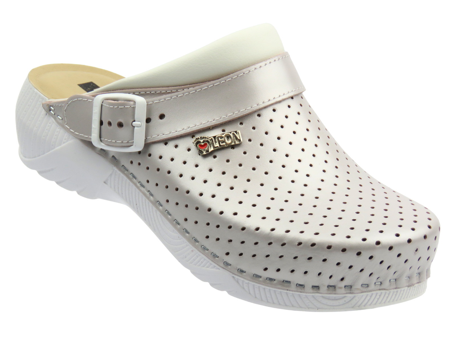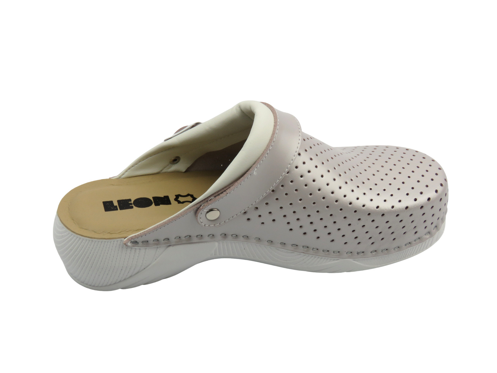 Model Leon 3300 to klasyczne, zabudowane klapki w eleganckim perłowym kolorze, które łączą styl z praktycznością codziennego użytkowania. To doskonały wybór dla kobiet poszukujących wygodnego obuwia o wyjątkowym wyglądzie.