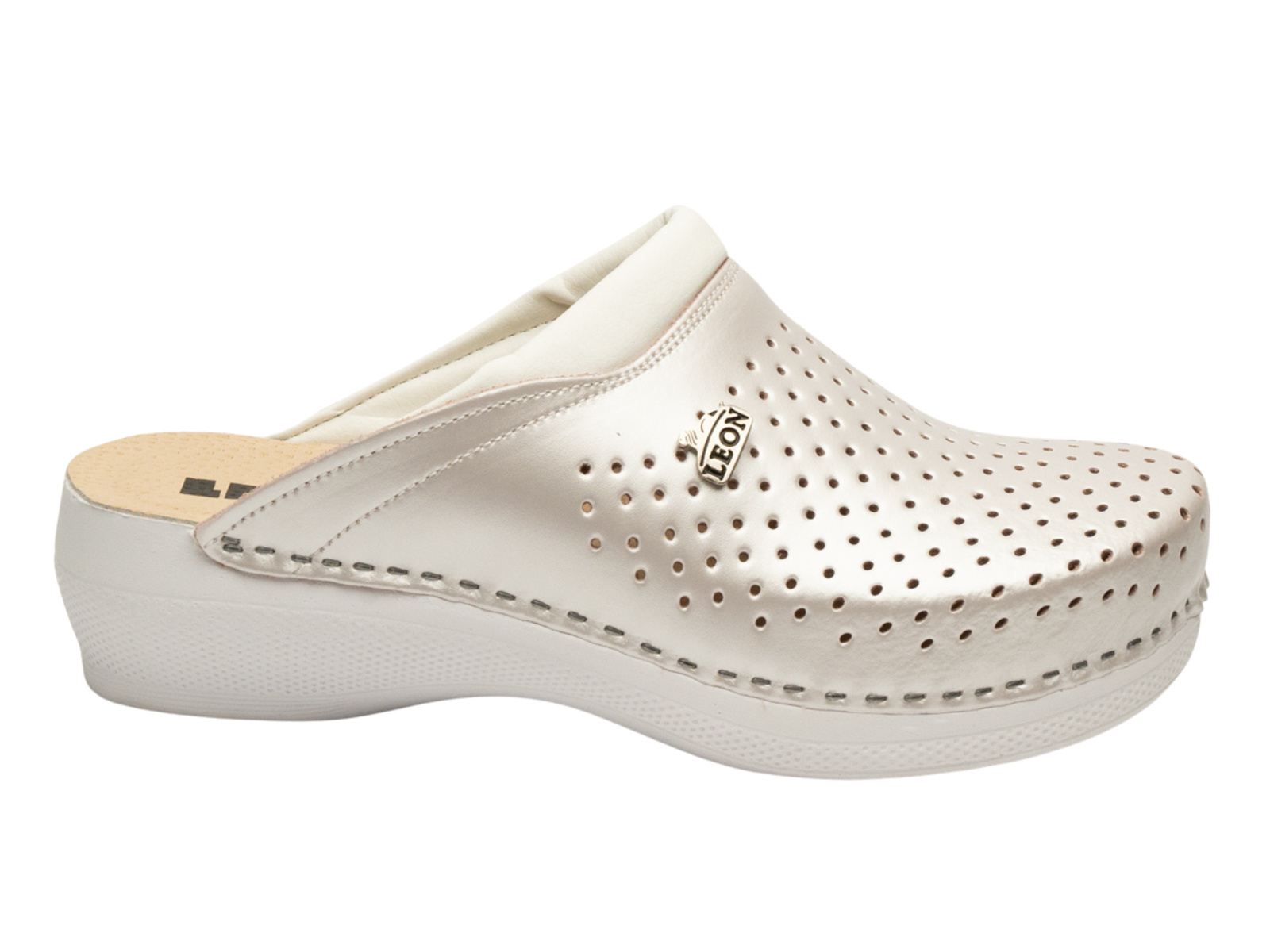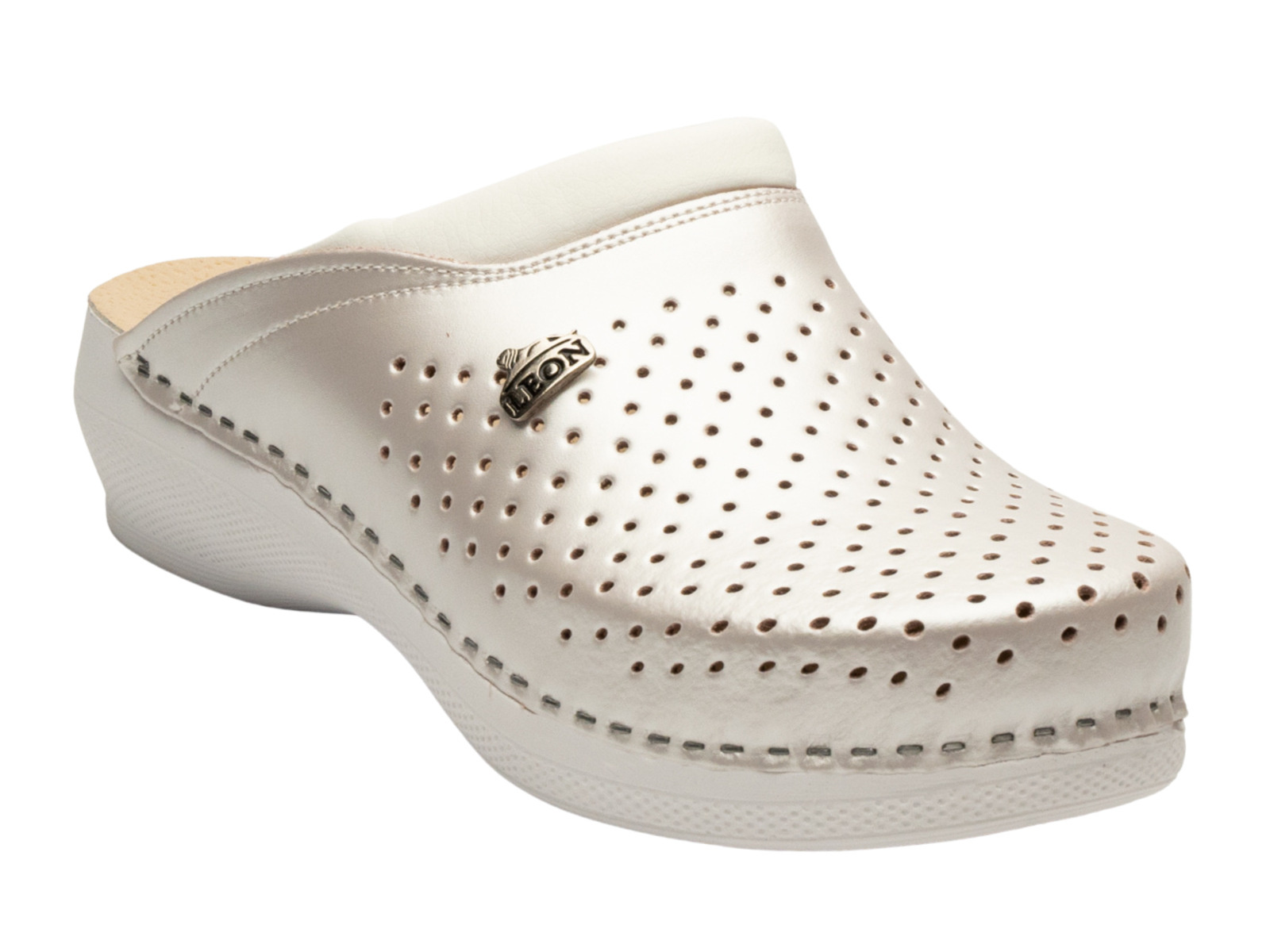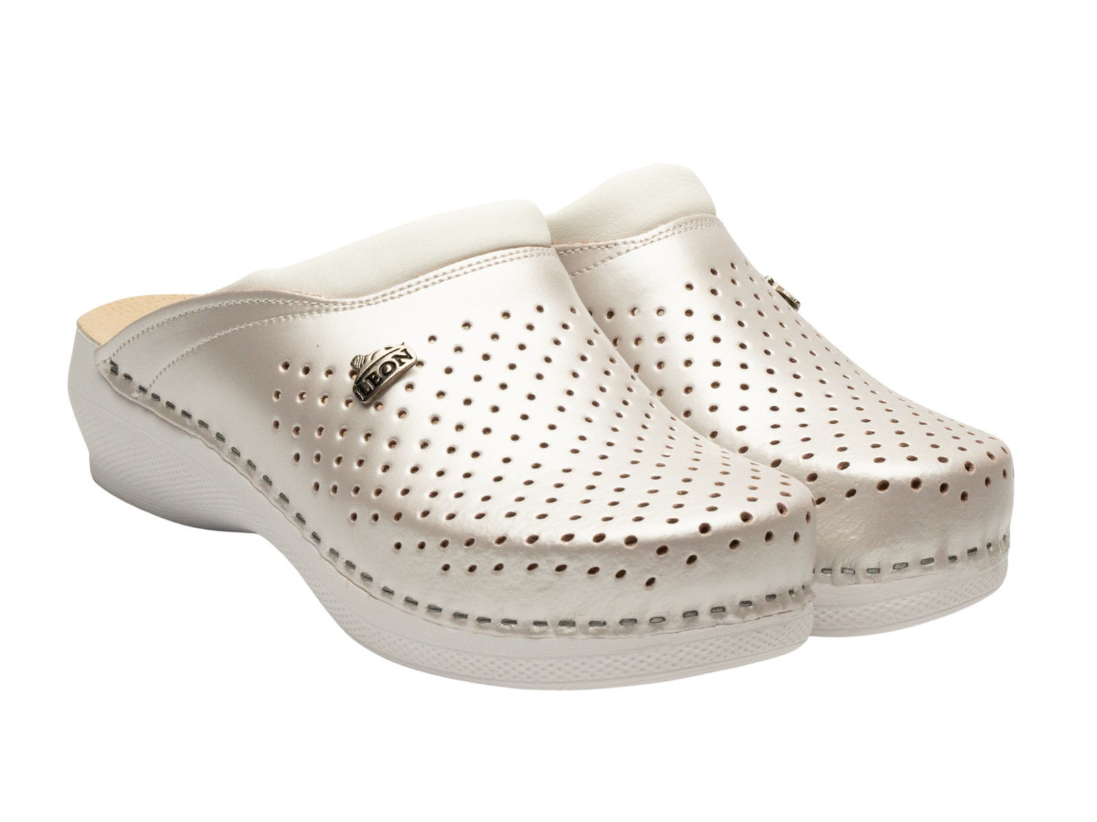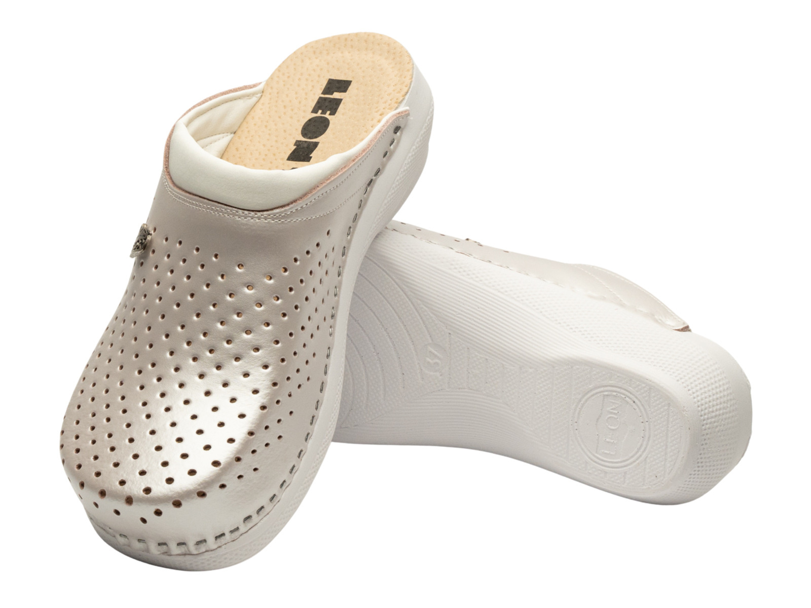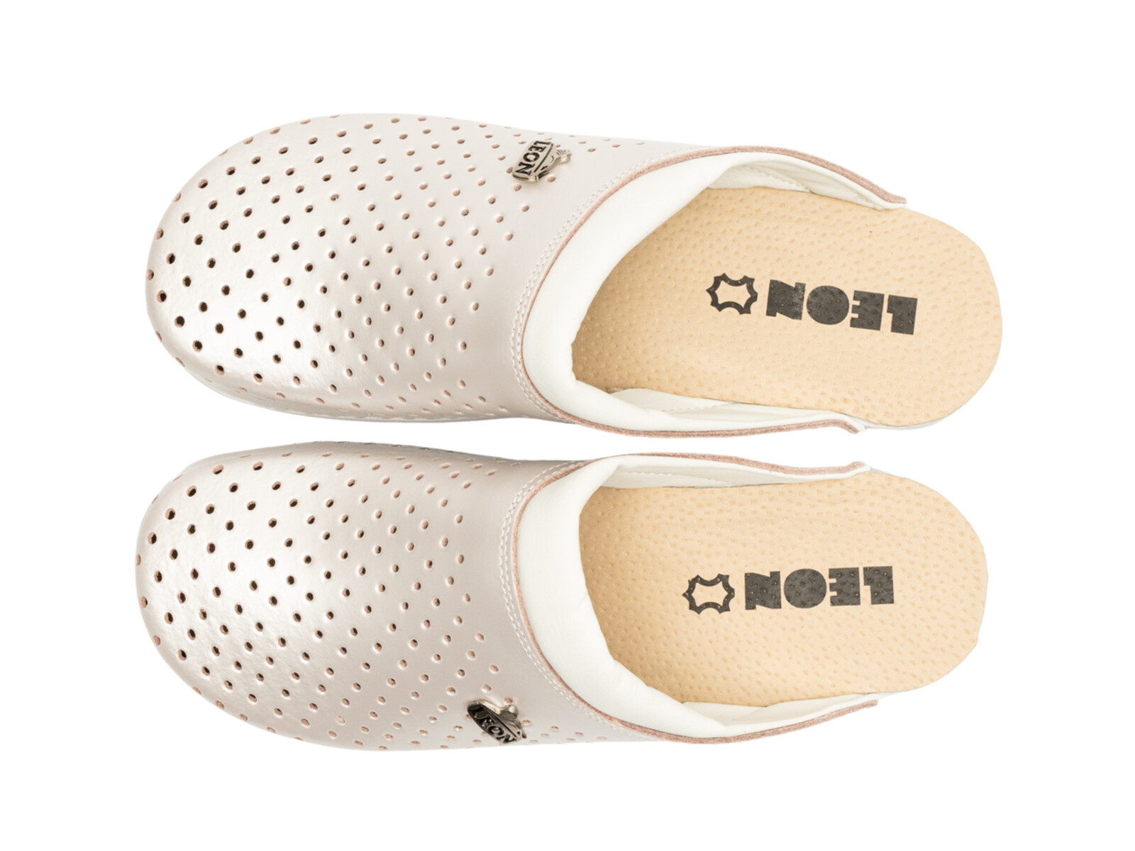 Podkreśl swoją kobiecość i postaw na wyjątkowy komfort dzięki skórzanym klapkom damskim Leon PU100 w subtelnym, perłowym odcieniu. To obuwie, które zachwyca delikatnym połyskiem i klasyczną formą, idealną na letnie dni oraz eleganckie wyjścia.