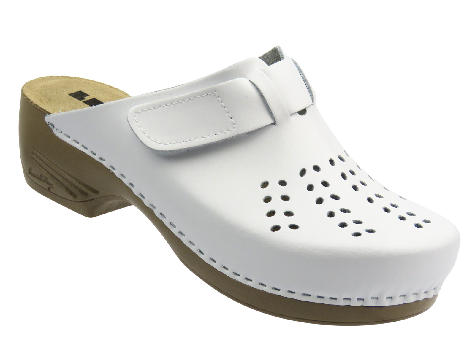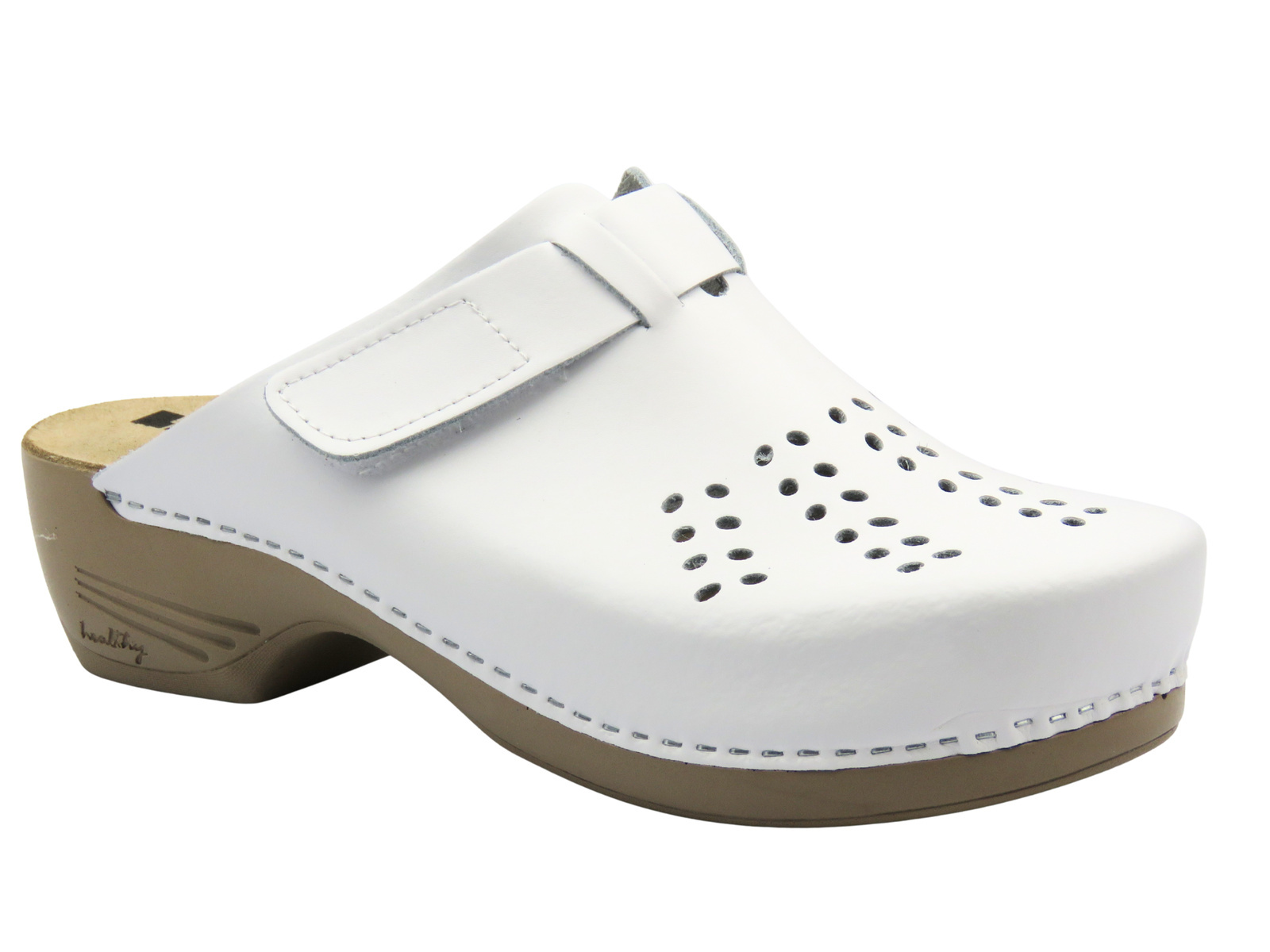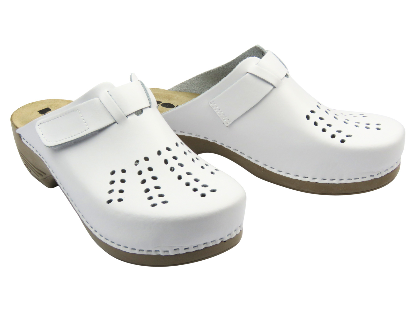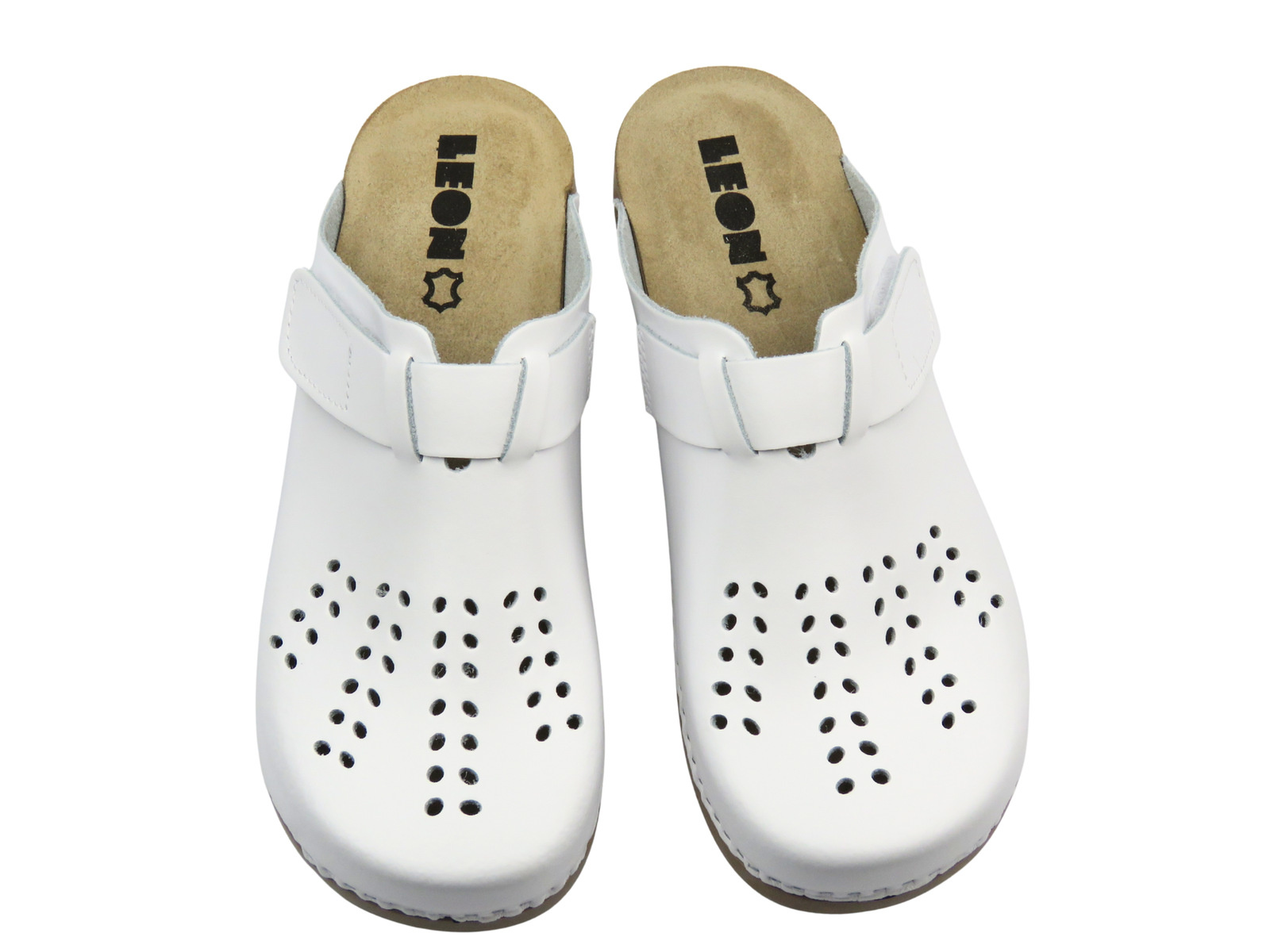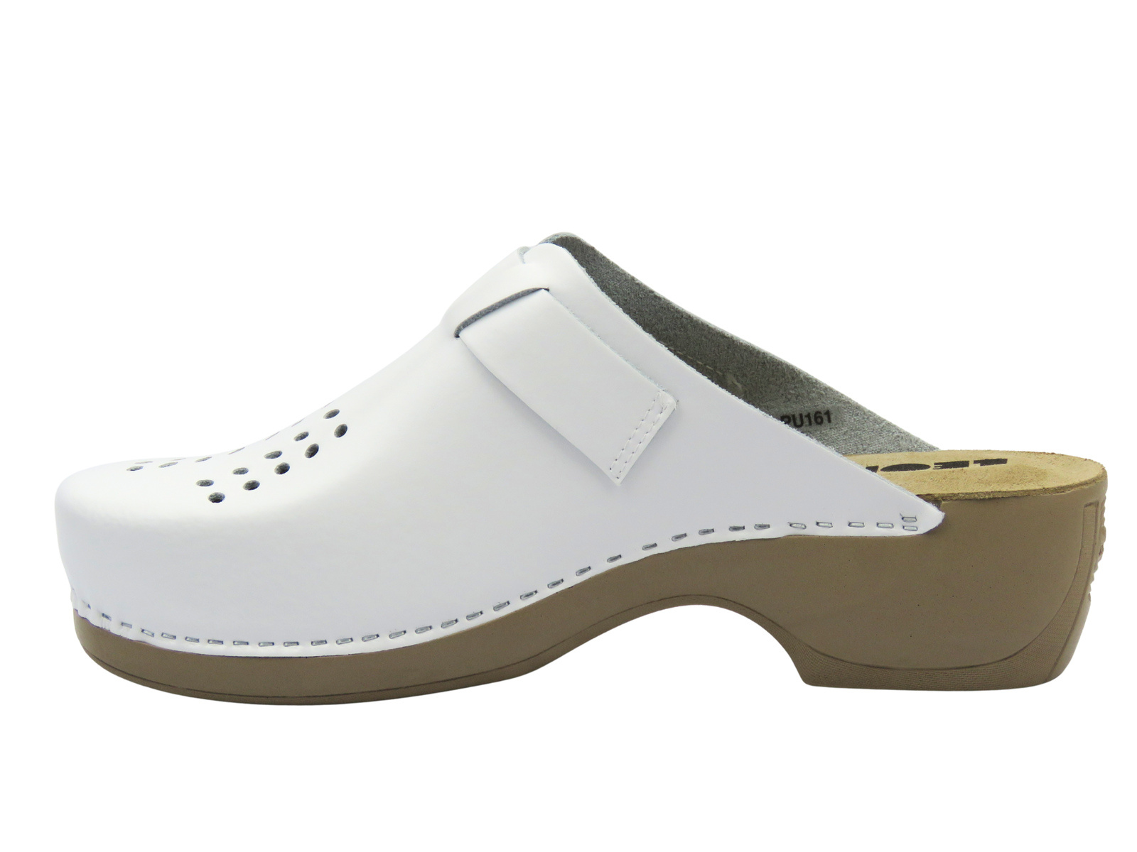 Białe klapki Leon 161 wyróżniają się uniwersalnym fasonem, który doskonale sprawdzi się w branży medycznej, gastronomicznej czy kosmetycznej, a także do codziennego użytku.