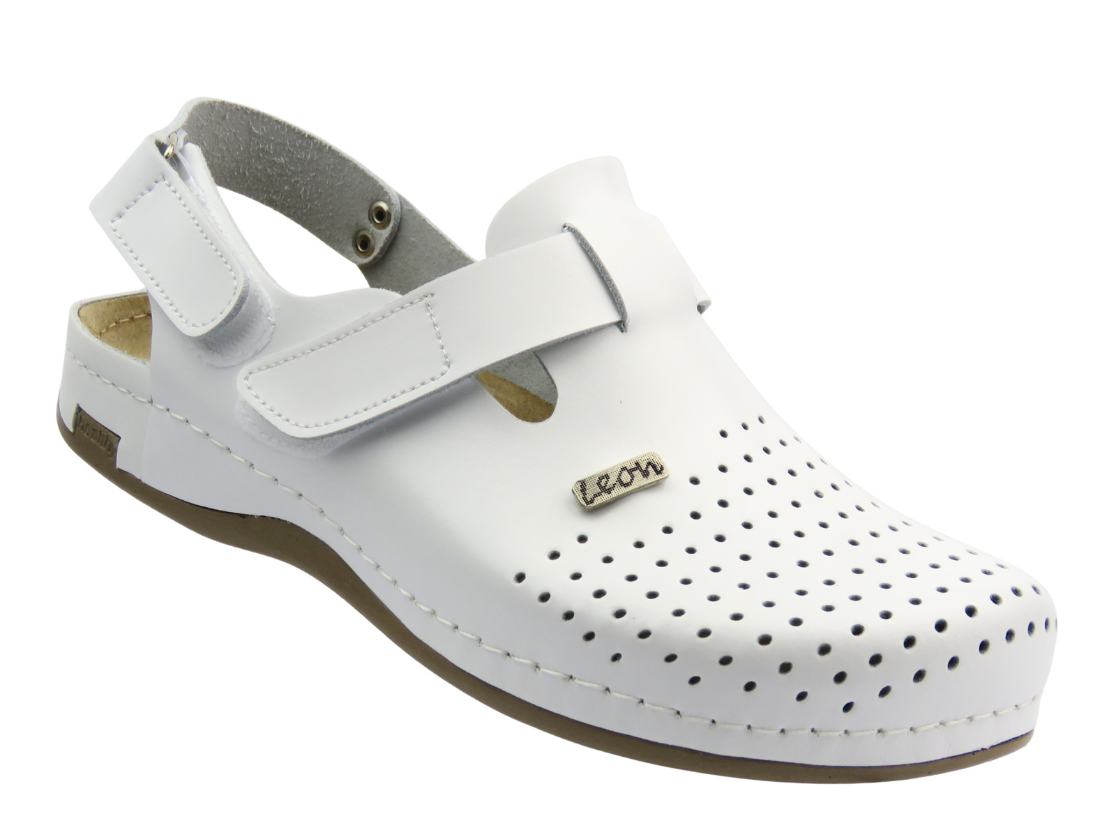 Białe klapki Leon 951 wyróżniają się klasycznym i uniwersalnym designem, dzięki czemu świetnie sprawdzą się w branży medycznej, gastronomicznej czy kosmetycznej, a także podczas codziennych spacerów i zajęć w domu.