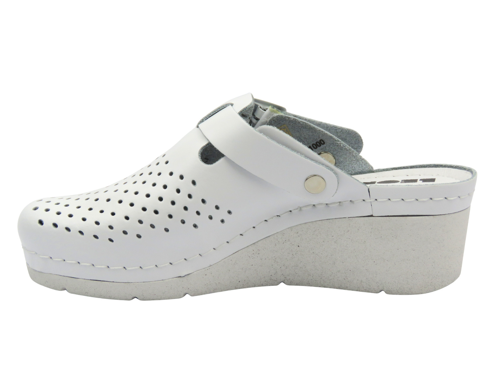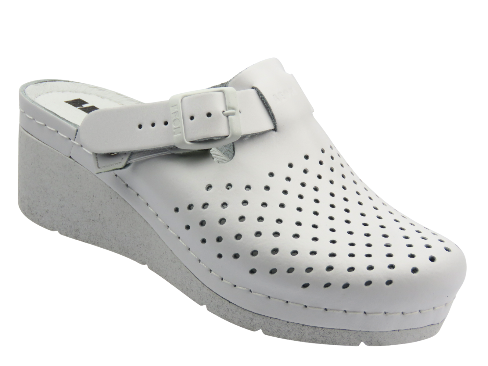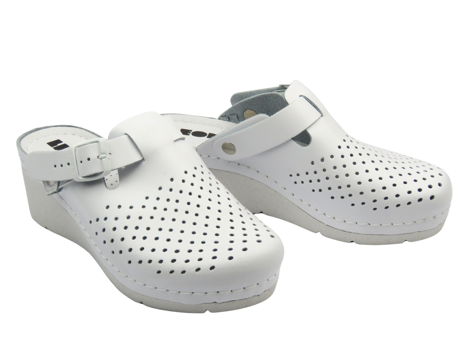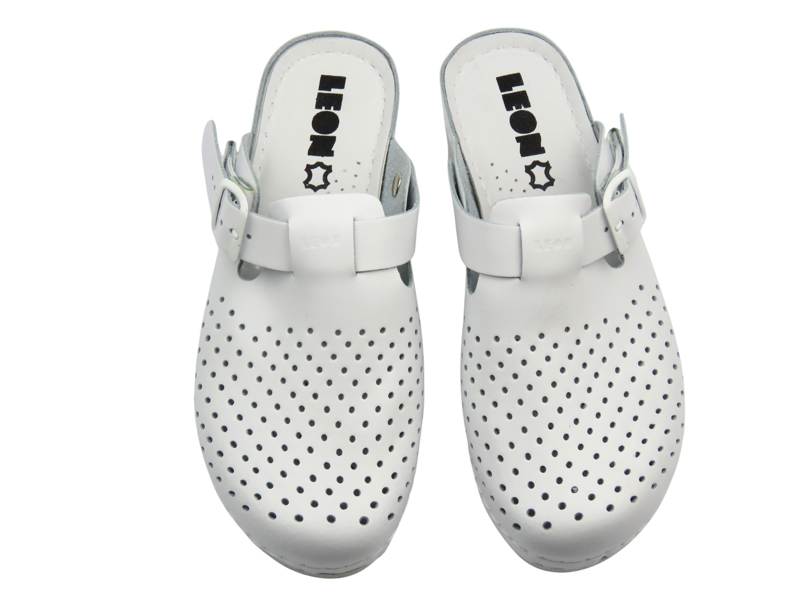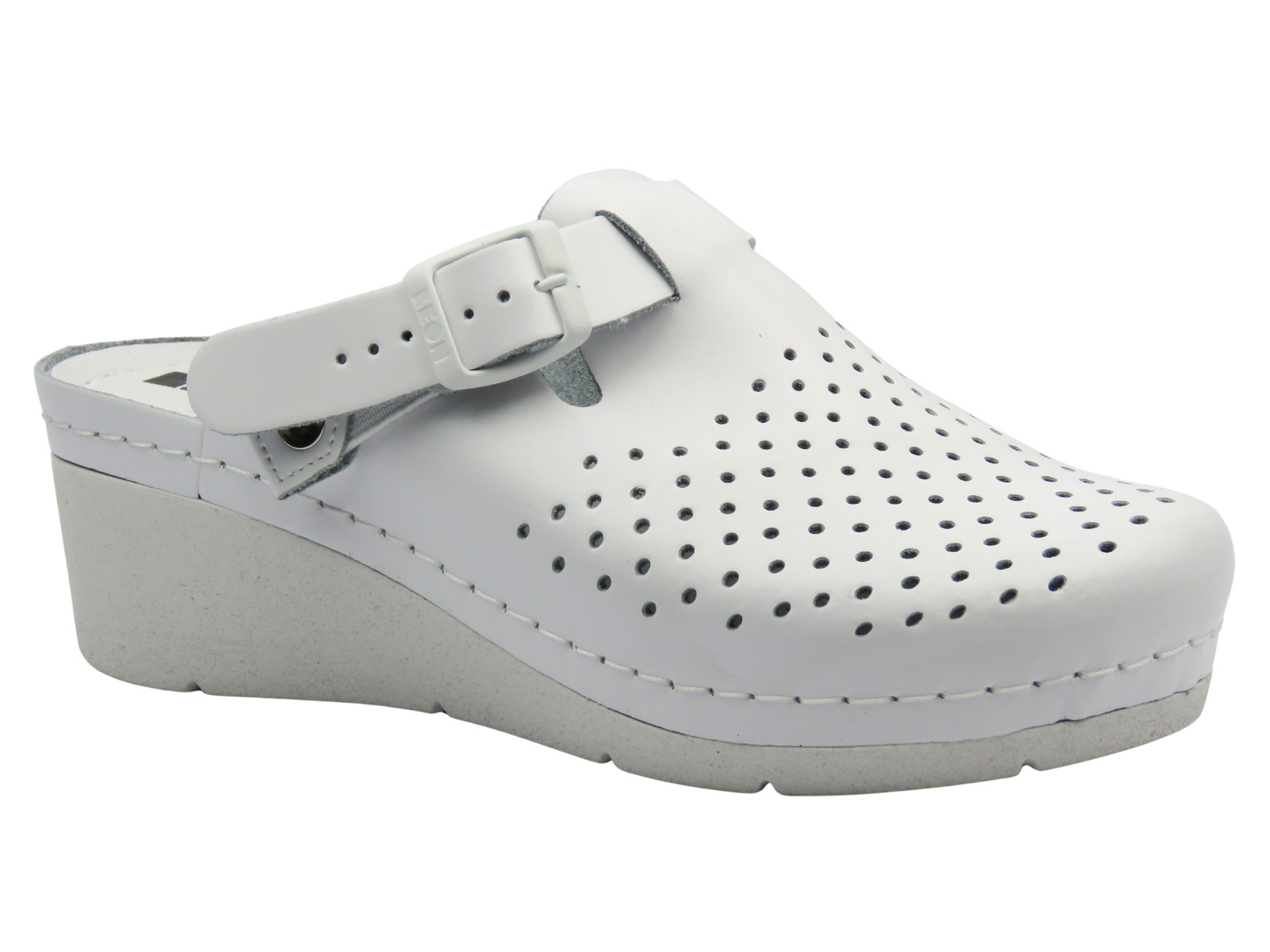 Białe klapki Leon 1000 wyróżniają się uniwersalnym fasonem, dzięki czemu sprawdzą się zarówno w domu, jak i na spacerze czy w pracy, np. w branży medycznej lub kosmetycznej.