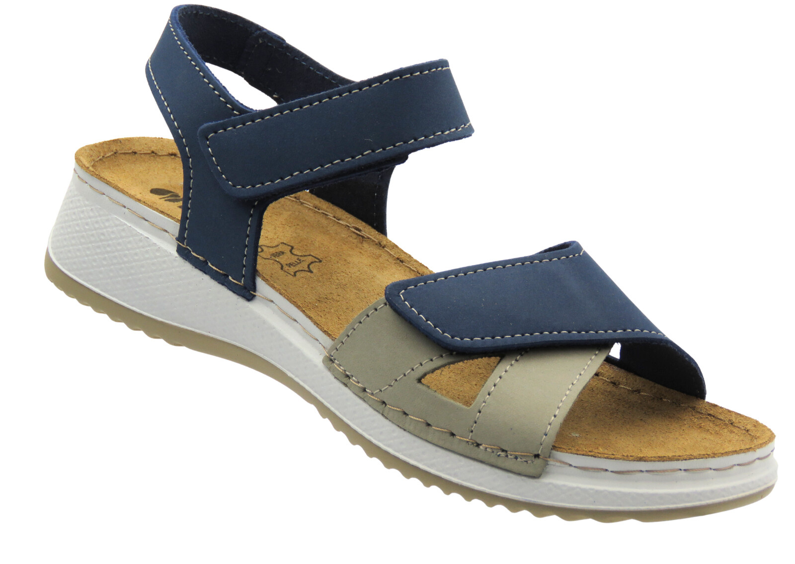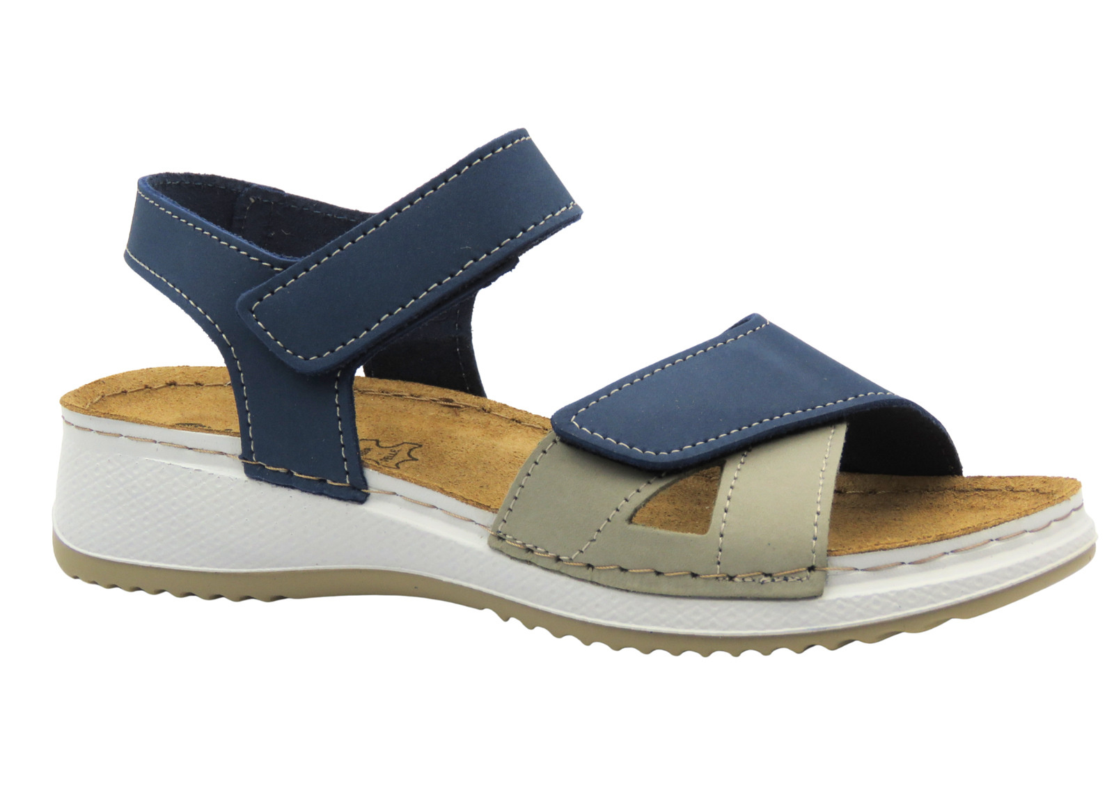 Cholewka wykonana została z wysokiej jakości naturalnej skóry w stonowanym odcieniu granatu i beżu, tworząc modną i uniwersalną kompozycję. Szerokie paski zapinane na rzep umożliwiają indywidualne dopasowanie do stopy, zwiększając komfort noszenia i stabilność kroku.