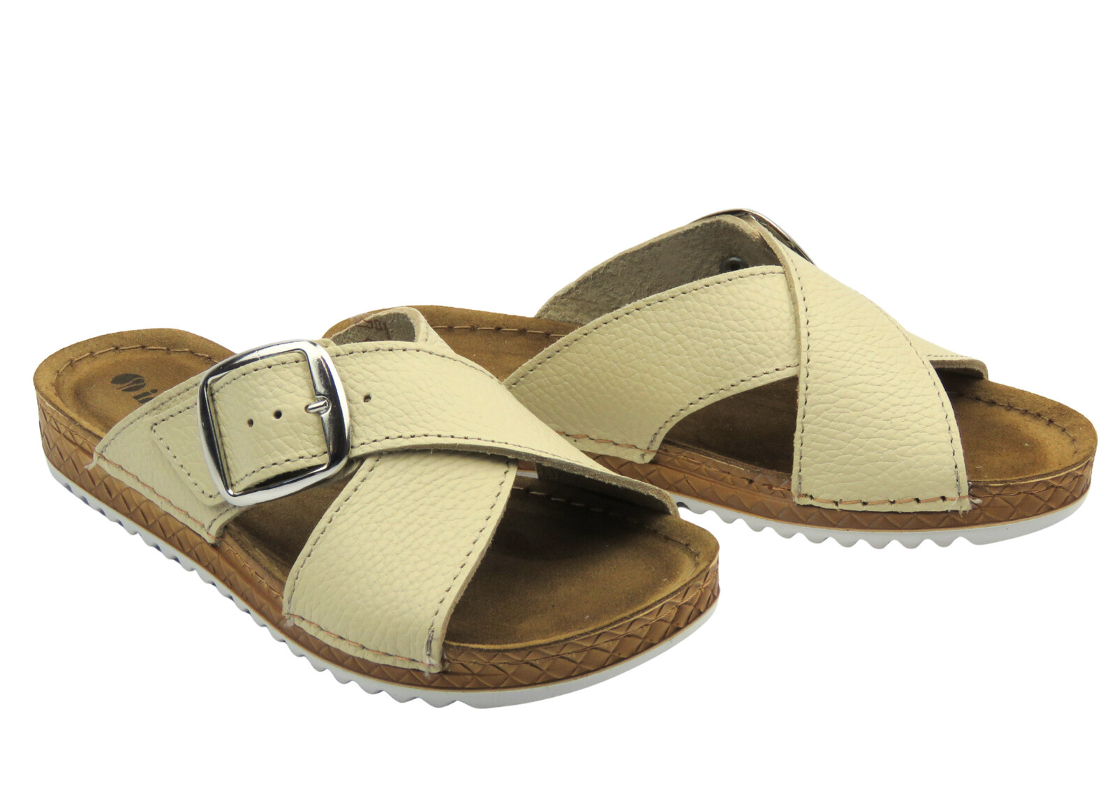 Wkładka ze skóry naturalnej zapewnia miękkość i oddychalność, co sprawia, że klapki są wygodne nawet podczas dłuższego noszenia w cieplejsze dni.