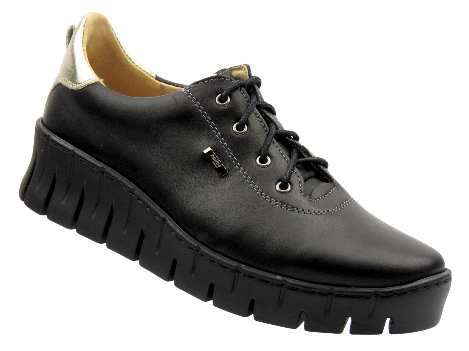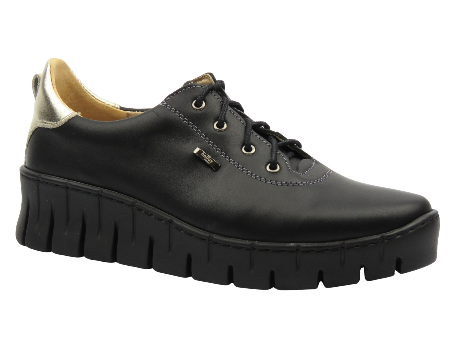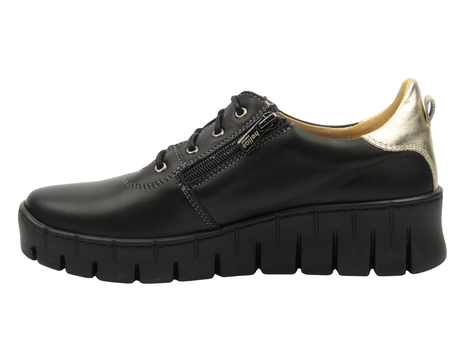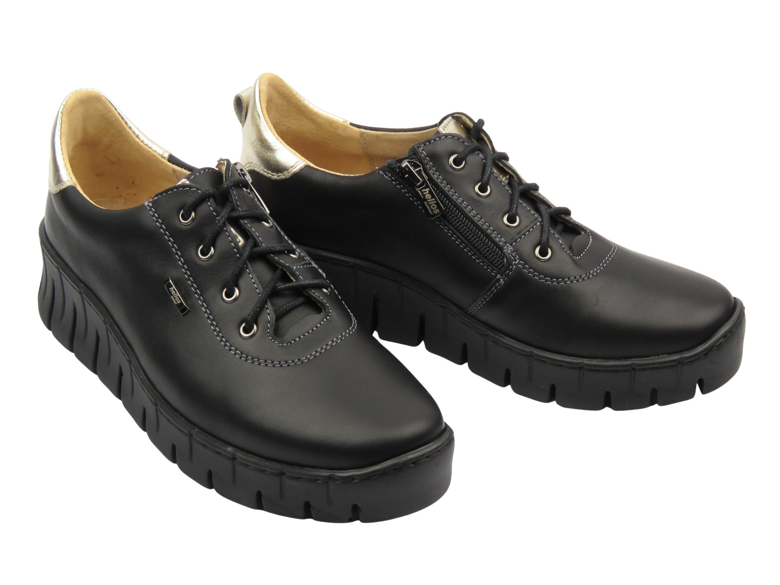 Półbuty damskie cenionej polskiej marki Helios Komfort zostały wykonane z wysokiej jakości skóry naturalnej w kolorze czarnym.