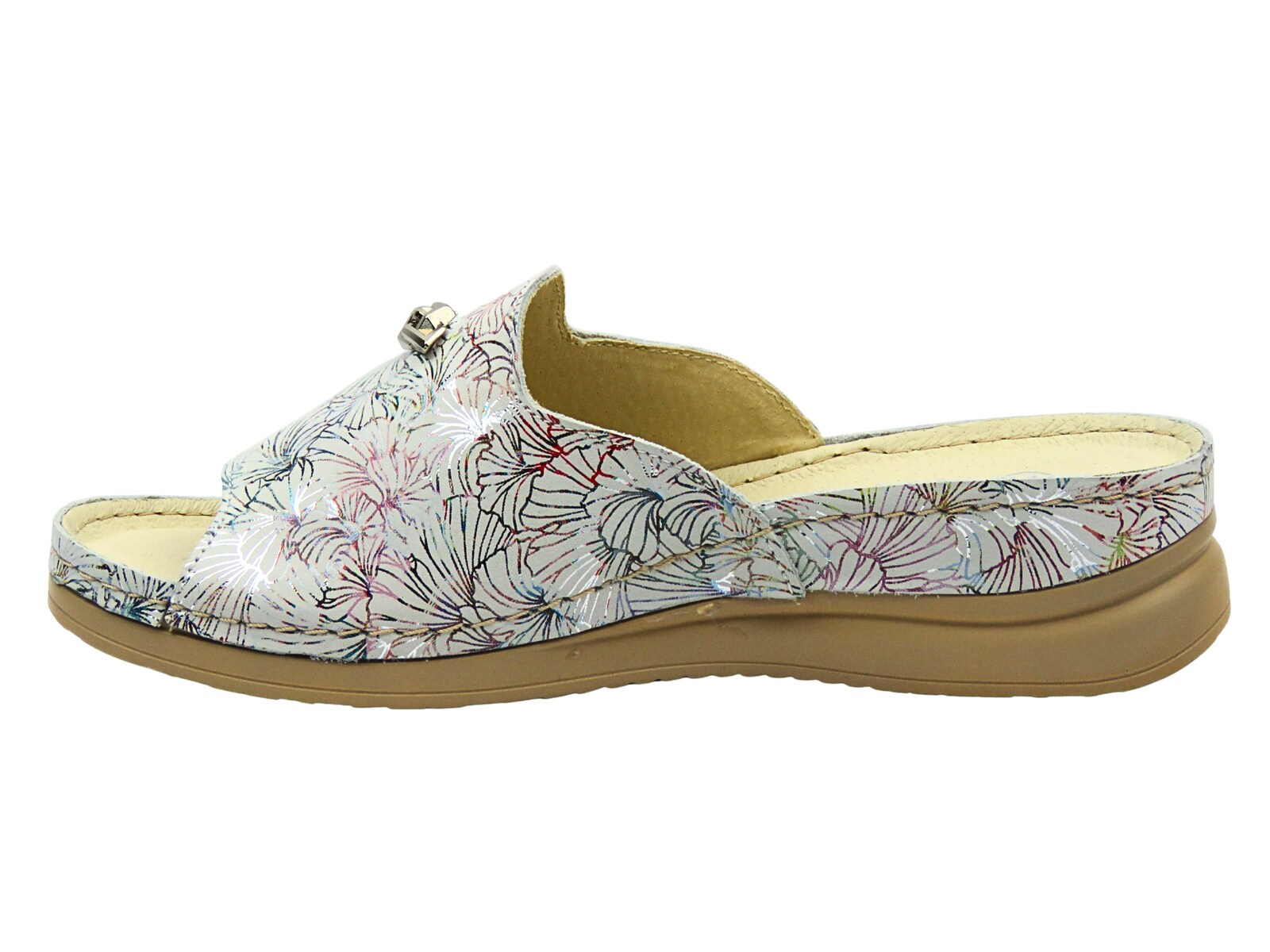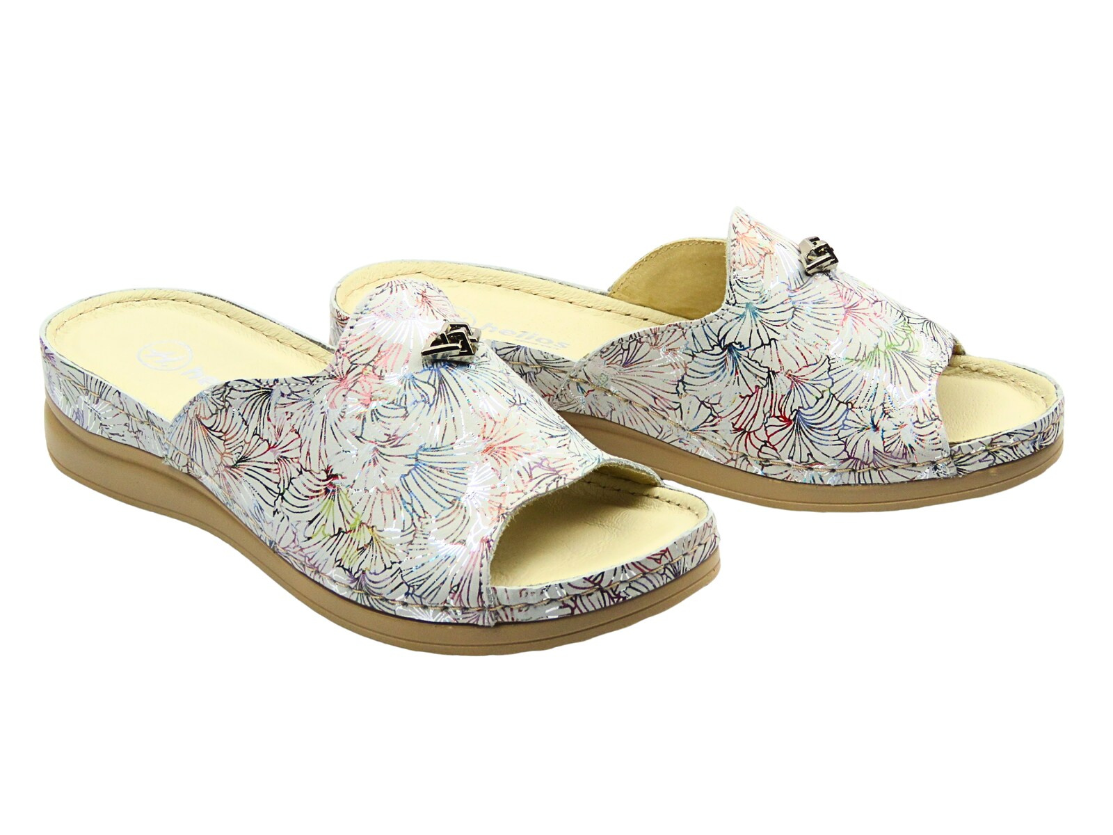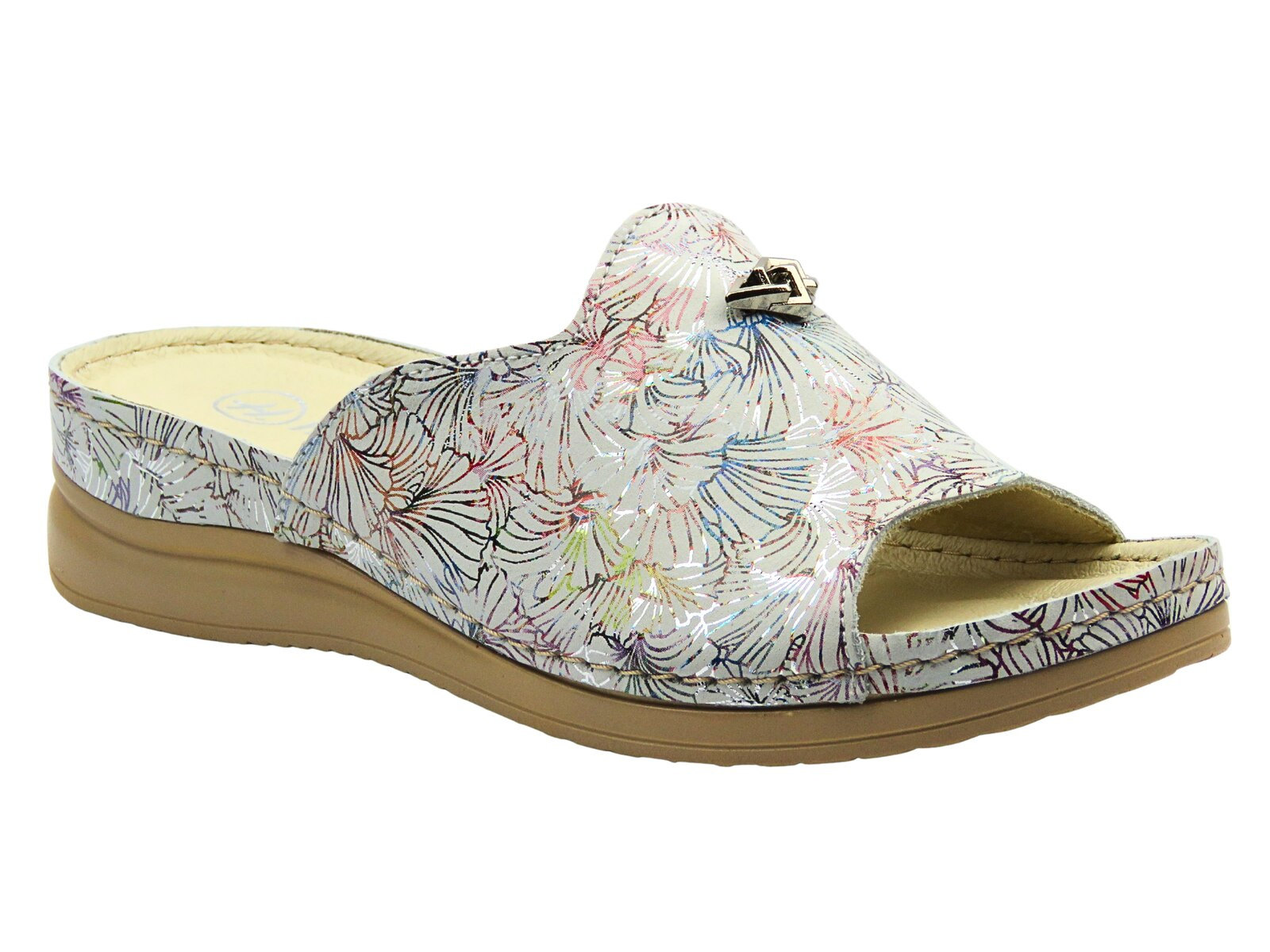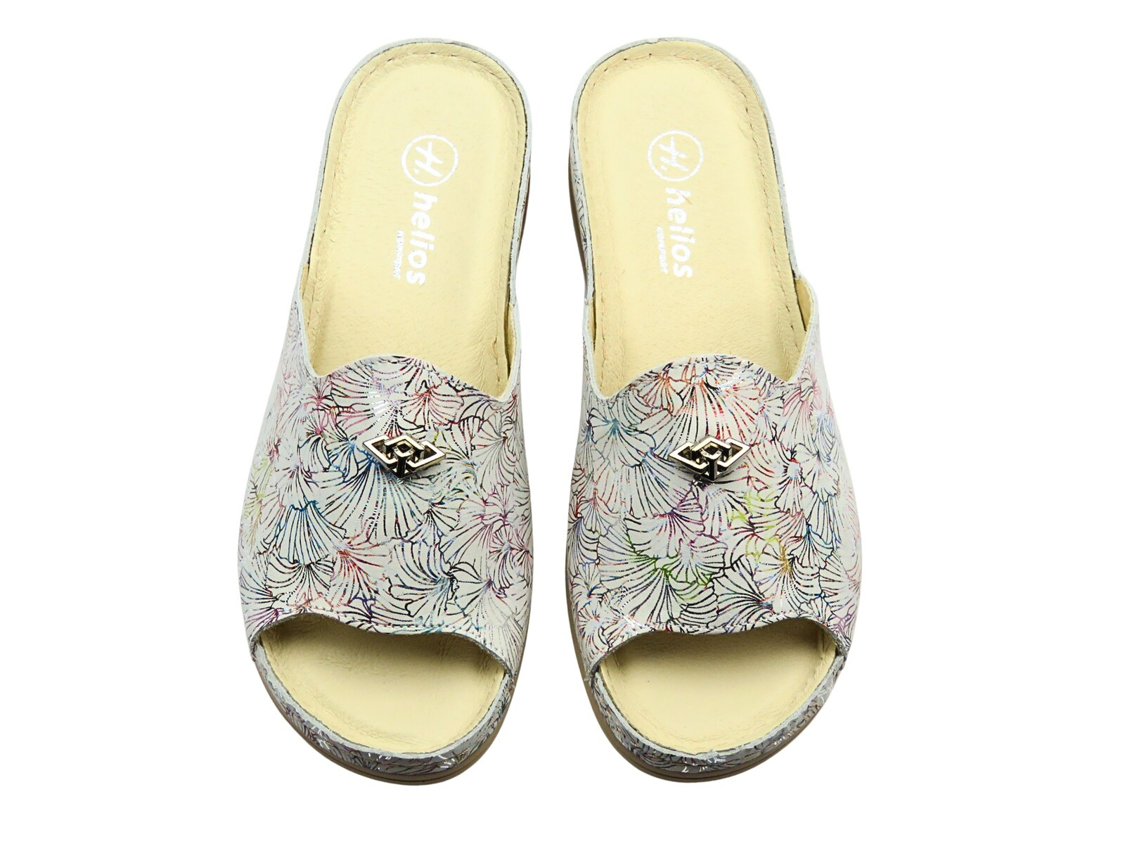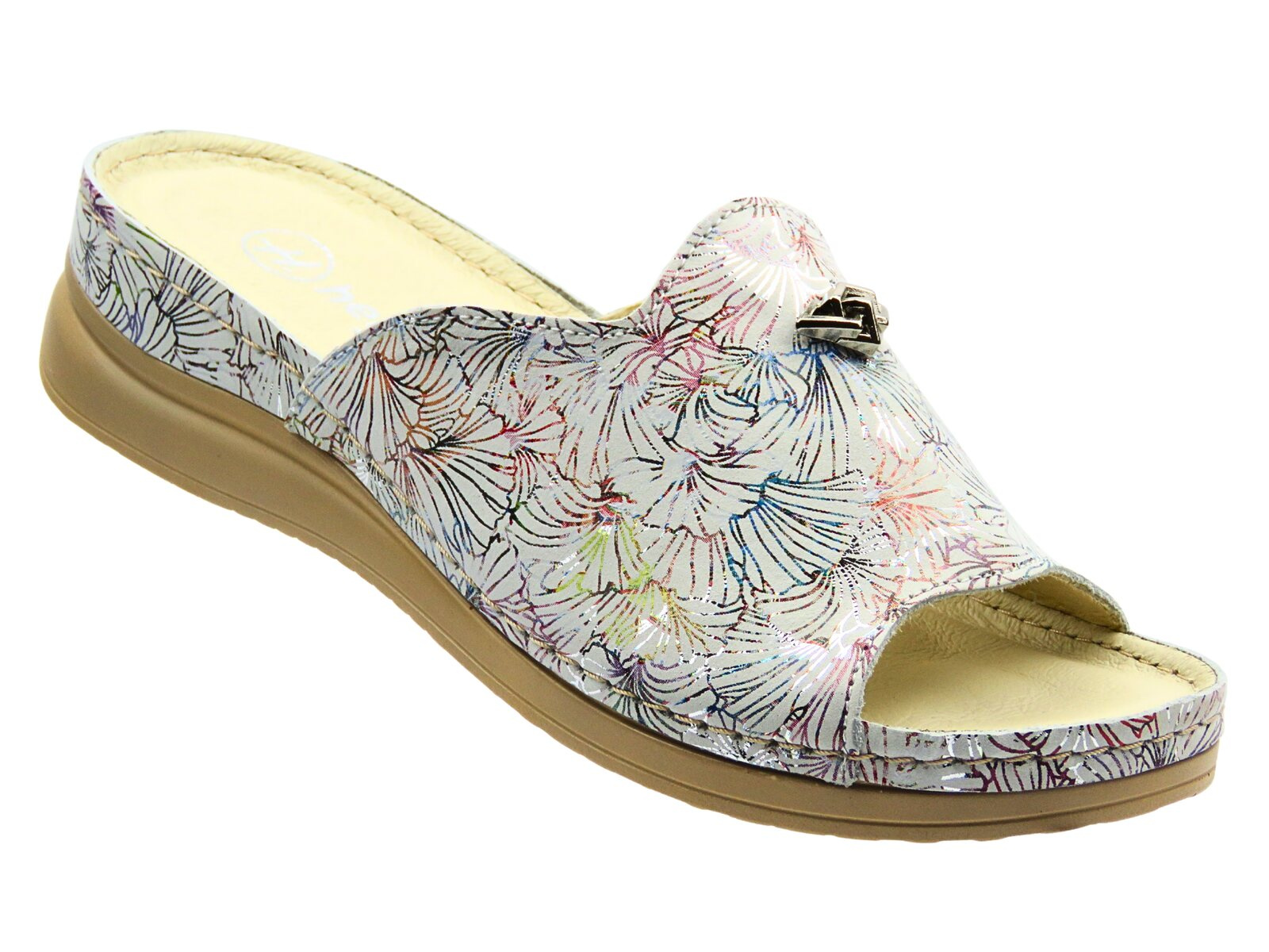 Styl i komfort w codziennym wydaniu – klapki damskie Helios Komfort 141 w kolorze białym z wielobarwnym, kwiatowym wzorem to idealne rozwiązanie dla kobiet, które szukają wygodnego i estetycznego obuwia na lato. Wykonane z naturalnej skóry, zachwycają miękkością i elastycznością, dopasowując się do kształtu stopy i zapewniając uczucie lekkości przez cały dzień.