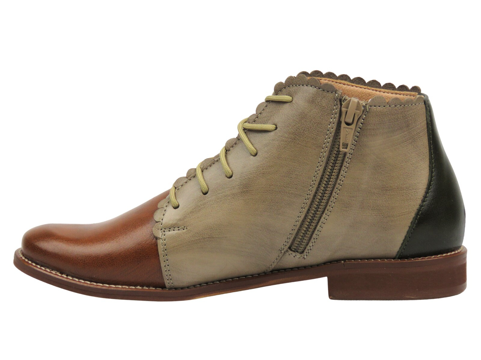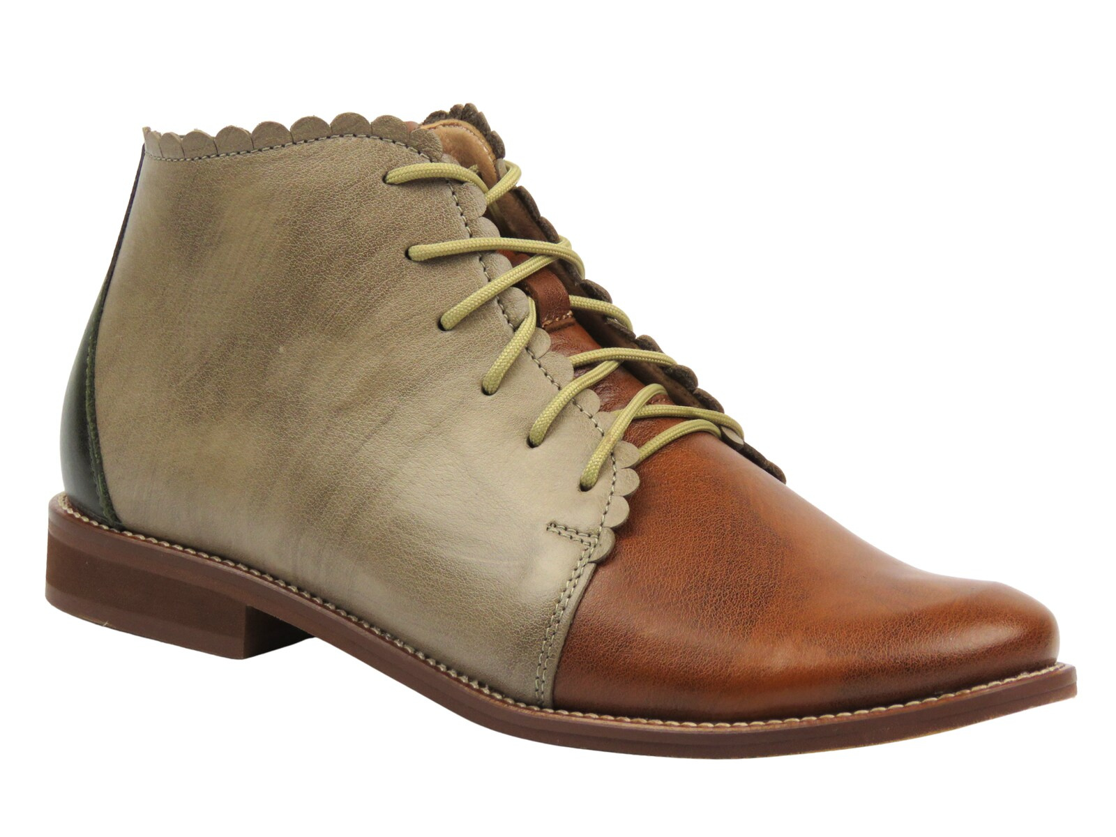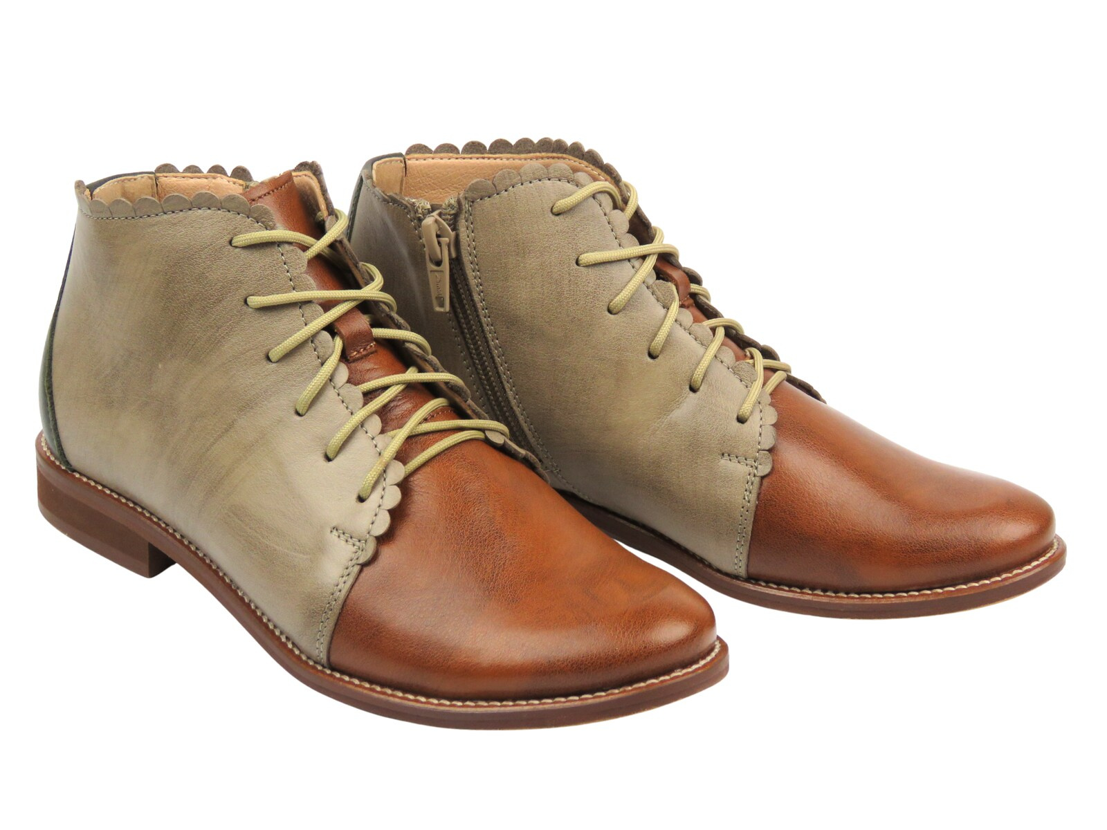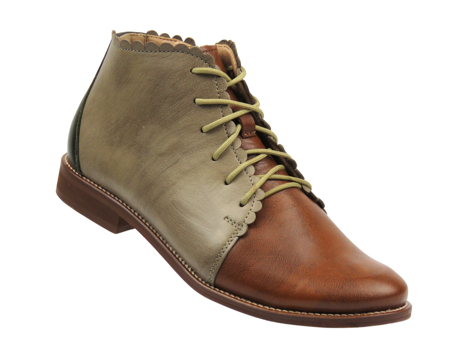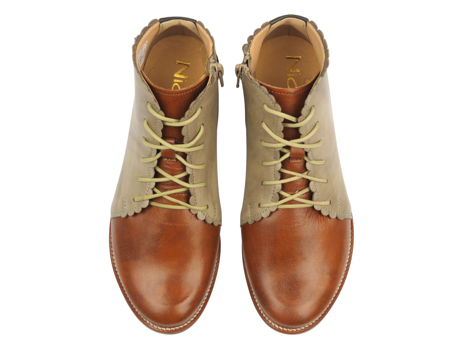 Nicoll 4078 to unikatowe, sznurowane trzewiki damskie wykonane w całości z naturalnej skóry – zarówno na zewnątrz, jak i wewnątrz. Ich oryginalne połączenie brązowych tonów z oliwkową cholewką przyciąga spojrzenia i dodaje stylizacjom wyrazistego charakteru.