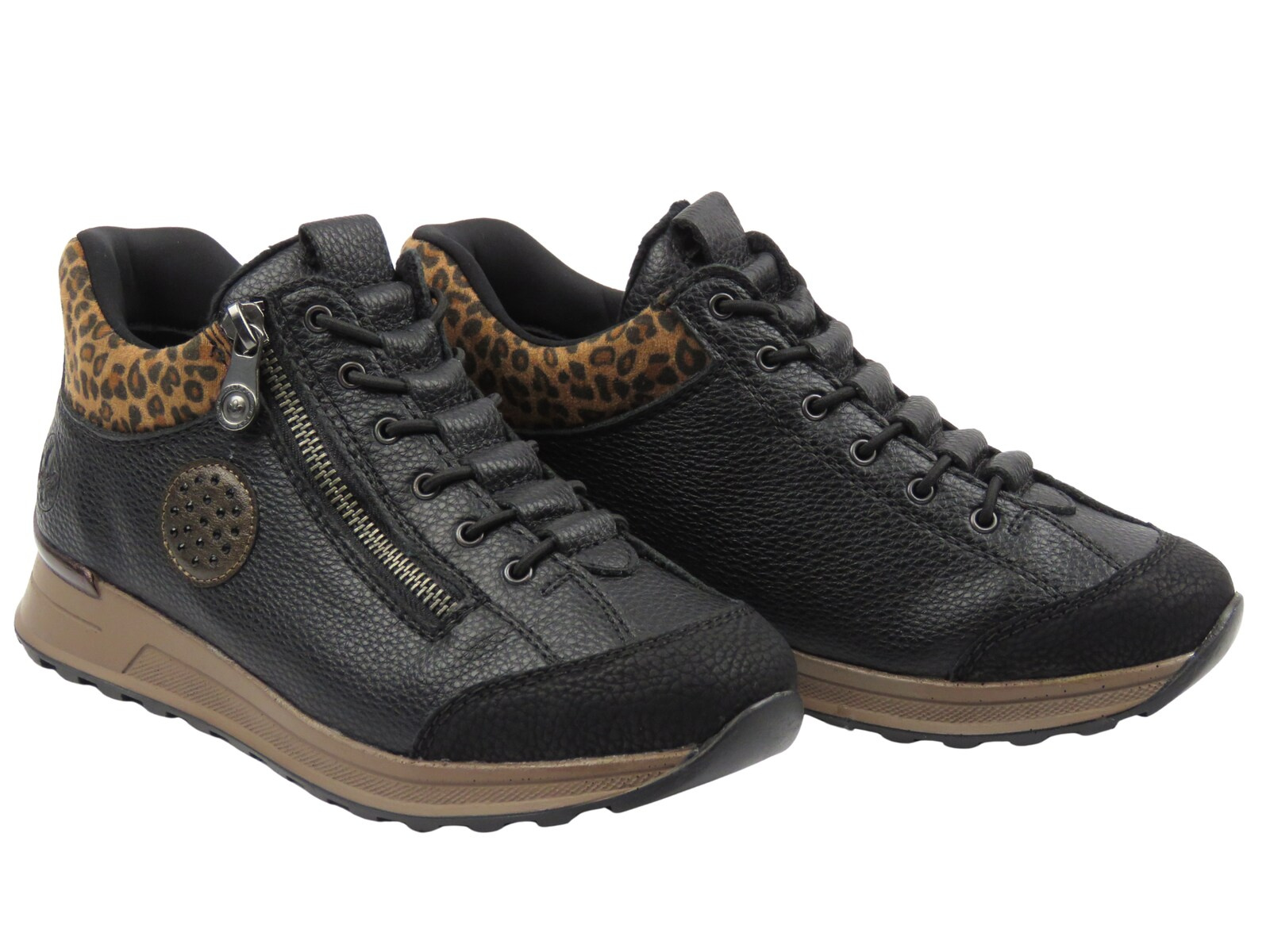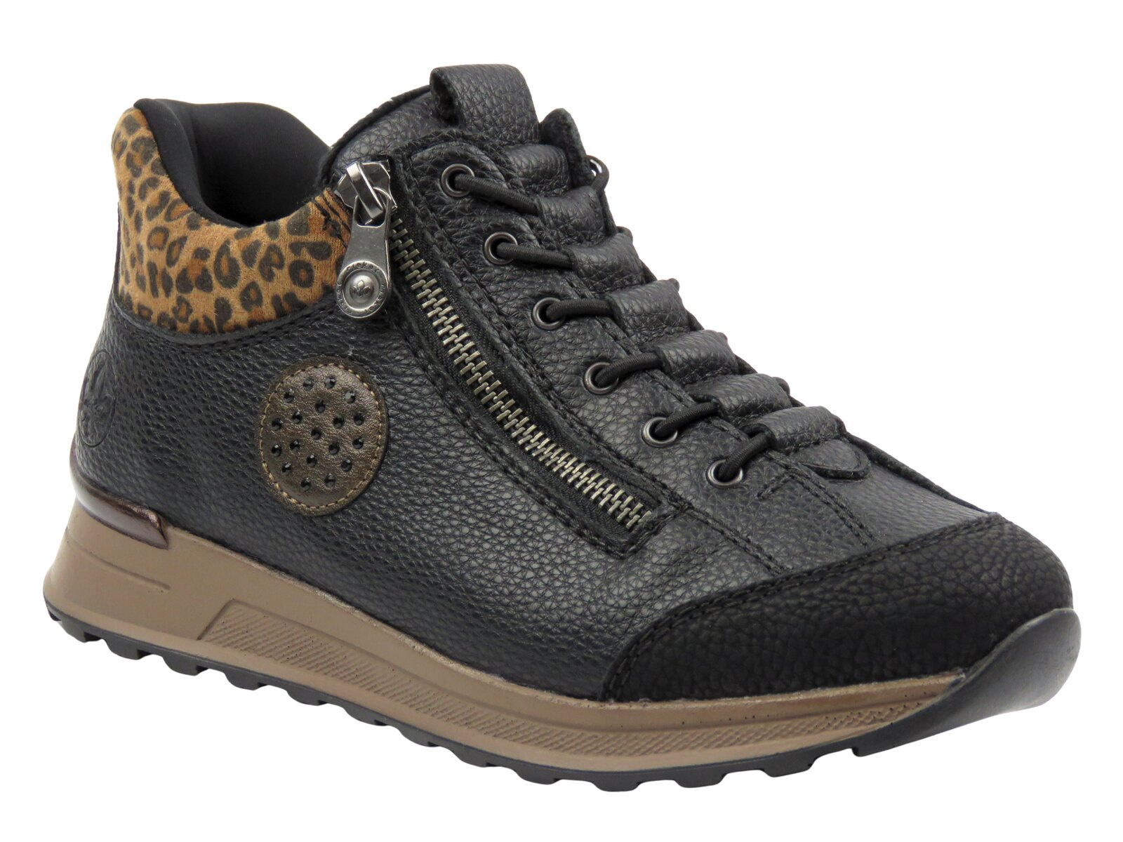 Rieker N1457-00 to nowoczesne, czarne botki damskie stworzone z myślą o kobietach, które pragną połączyć wygodę, styl i niezawodność w codziennym obuwiu. Cholewka wykonana z trwałej skóry ekologicznej przyciąga uwagę dzięki subtelnemu połyskowi oraz modnym akcentom – efektownemu zamkowi błyskawicznemu i wstawce z motywem panterki wokół kostki. Ta dynamiczna kompozycja przełamuje klasykę czerni i dodaje charakteru każdej stylizacji. Klasyczne sznurowanie wspomagane jest przez zamek, co znacznie ułatwia zakładanie obuwia i dopasowanie go do indywidualnego kształtu stopy.
