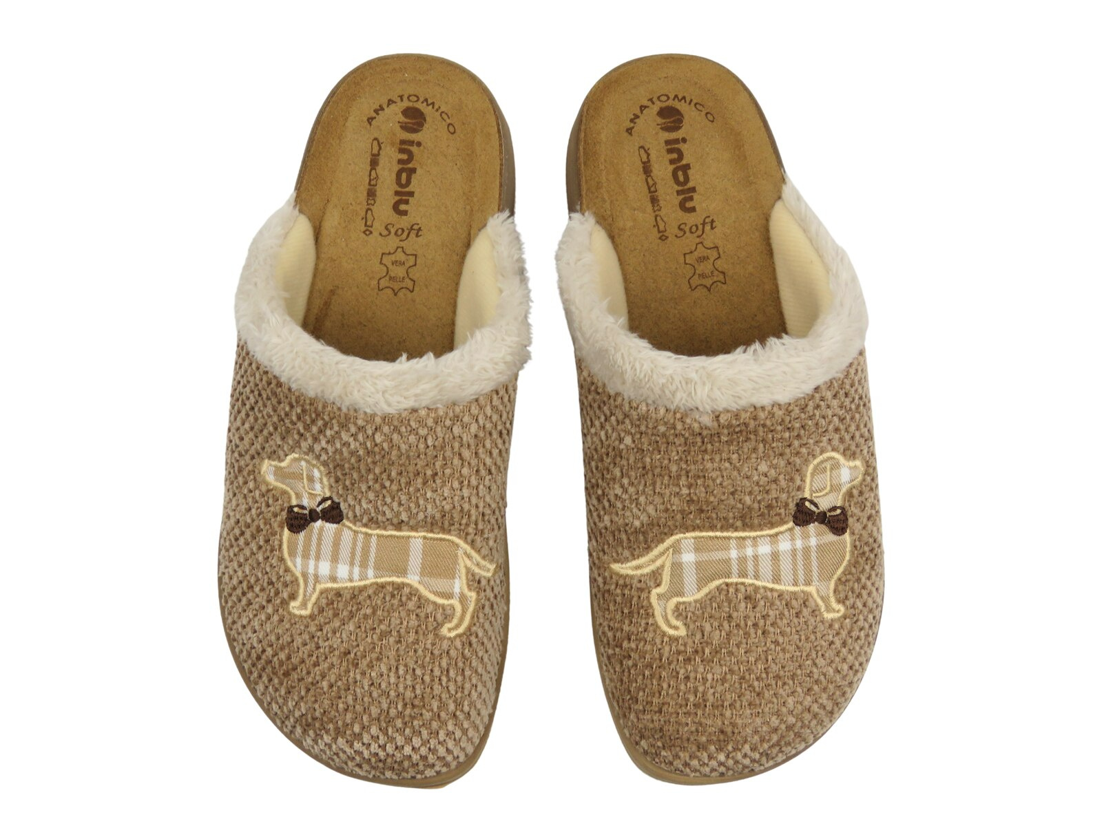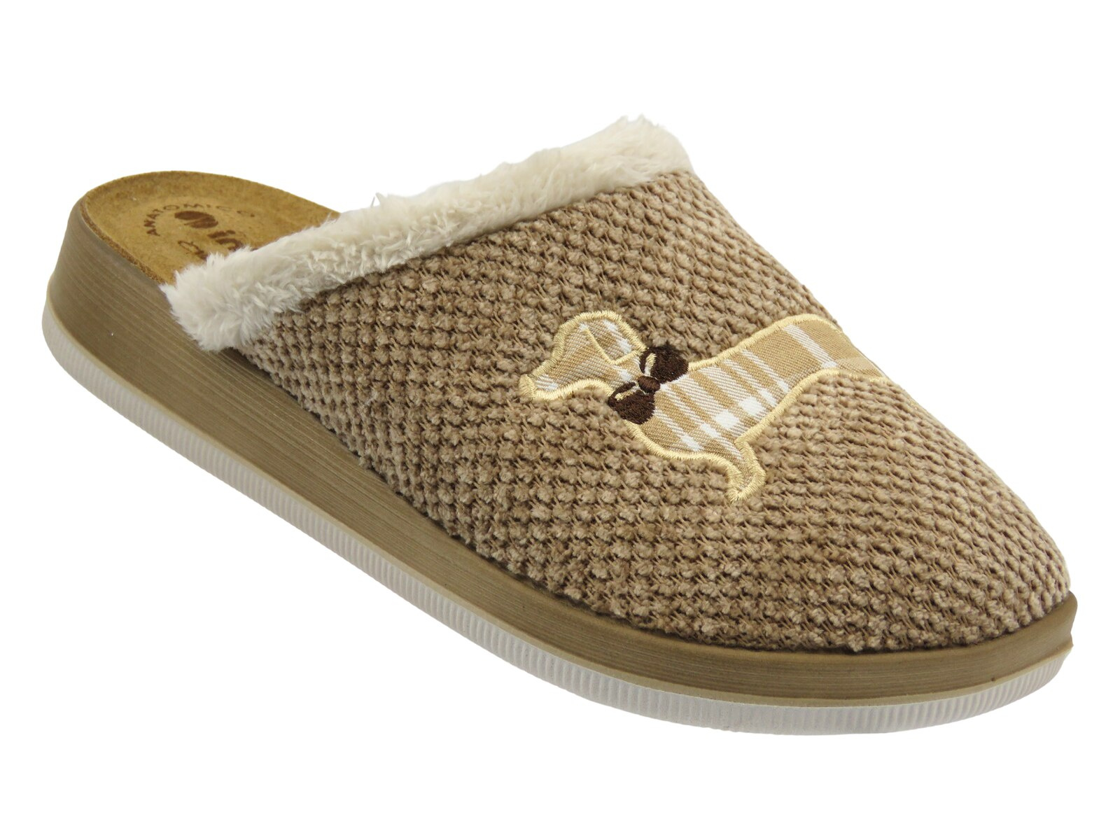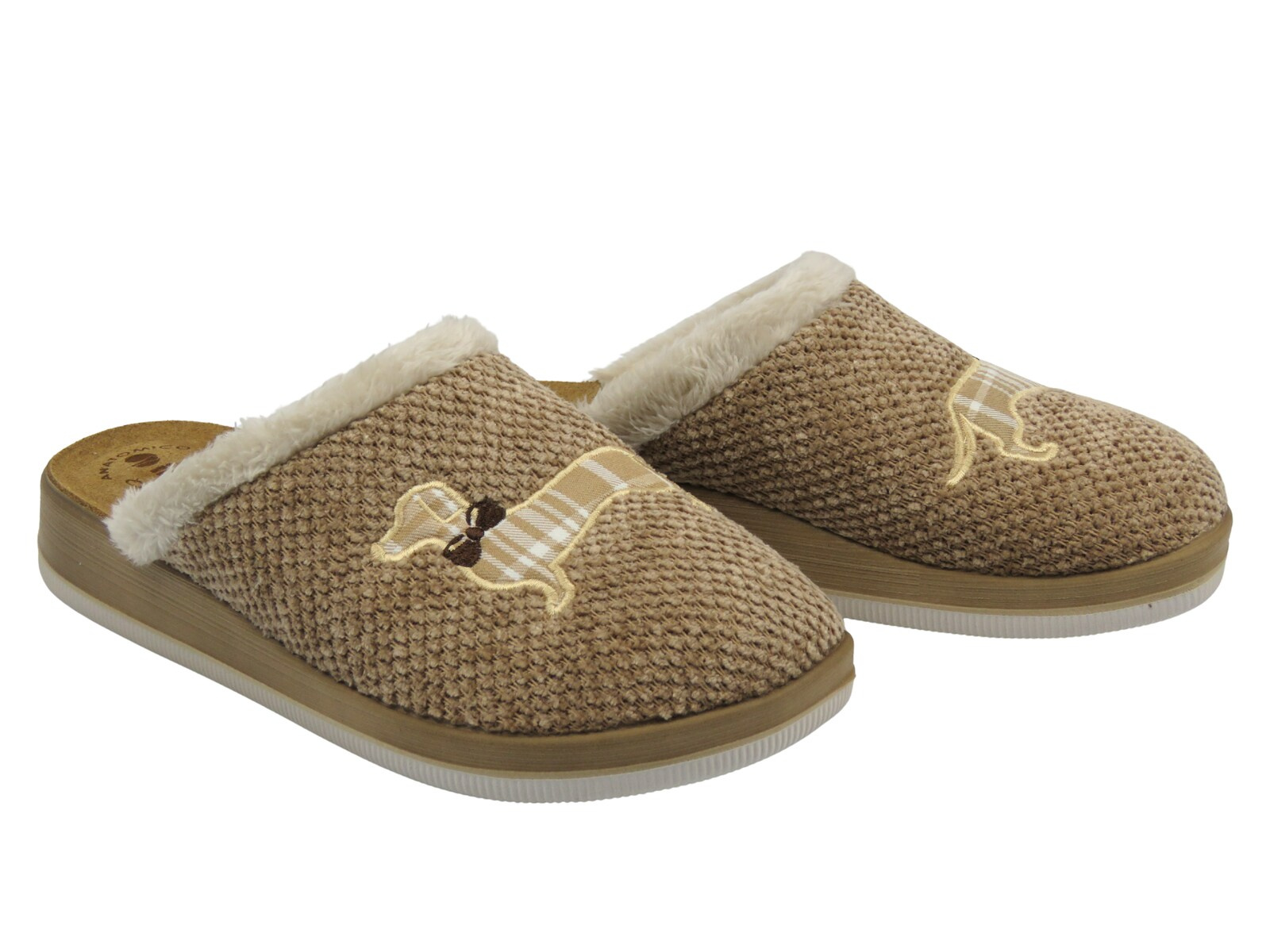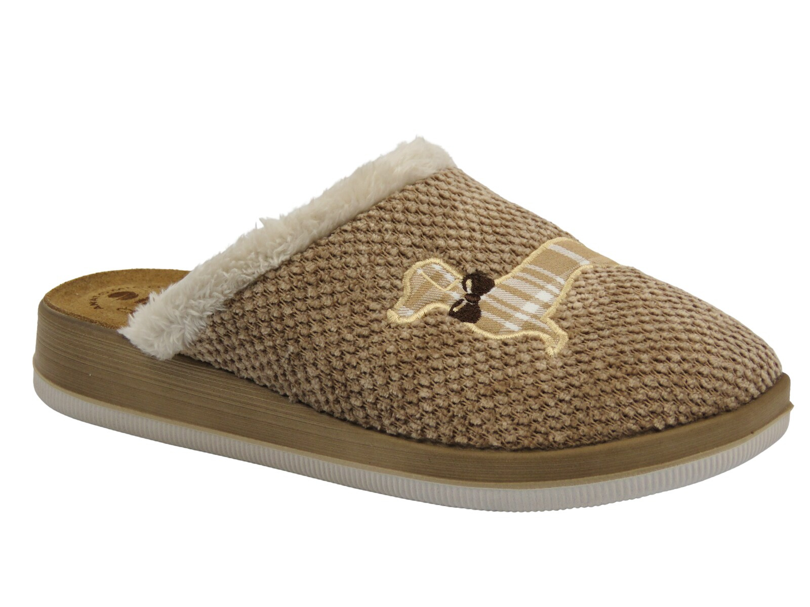 Uroczy haft z motywem psa w kratkę oraz futerkowe wykończenie cholewki dodają kapciom przytulnego charakteru i dziewczęcego uroku.