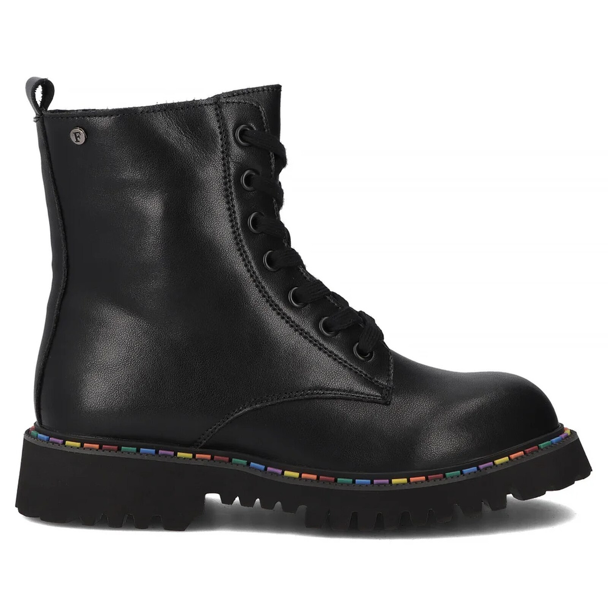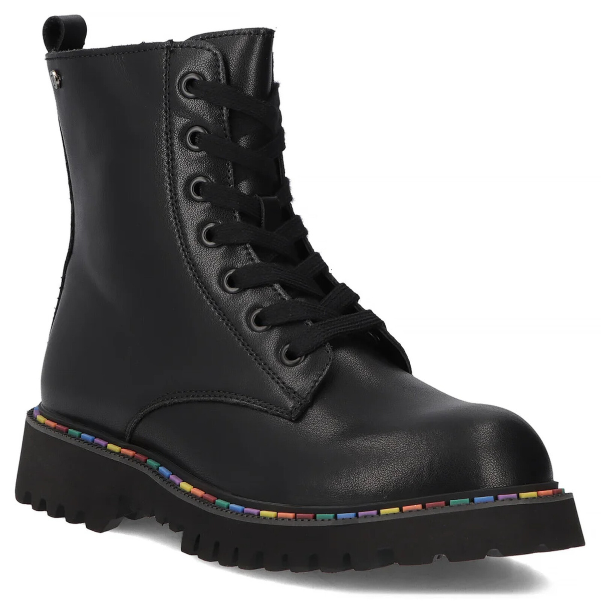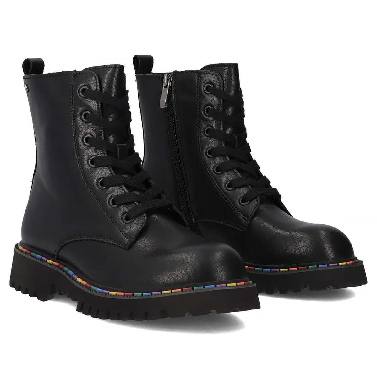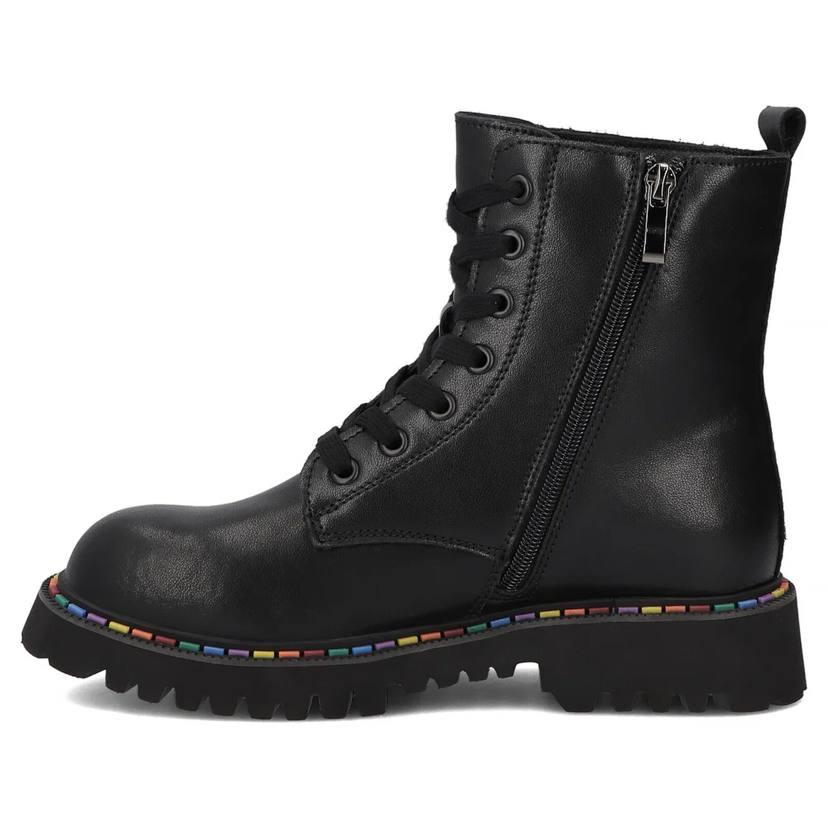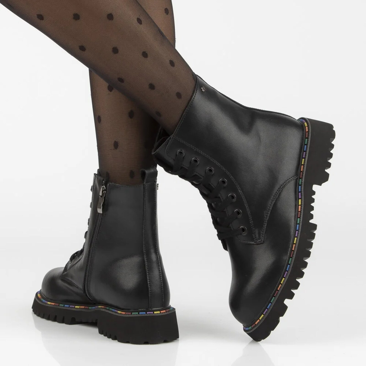 Model wyposażony jest w sznurowanie oraz boczny suwak, co pozwala na łatwe zakładanie i idealne dopasowanie do stopy. Grubsza podeszwa o wysokości 3,5 cm zapewnia amortyzację i przyczepność, a kolorowy akcent wokół podeszwy nadaje całości wyjątkowego charakteru.