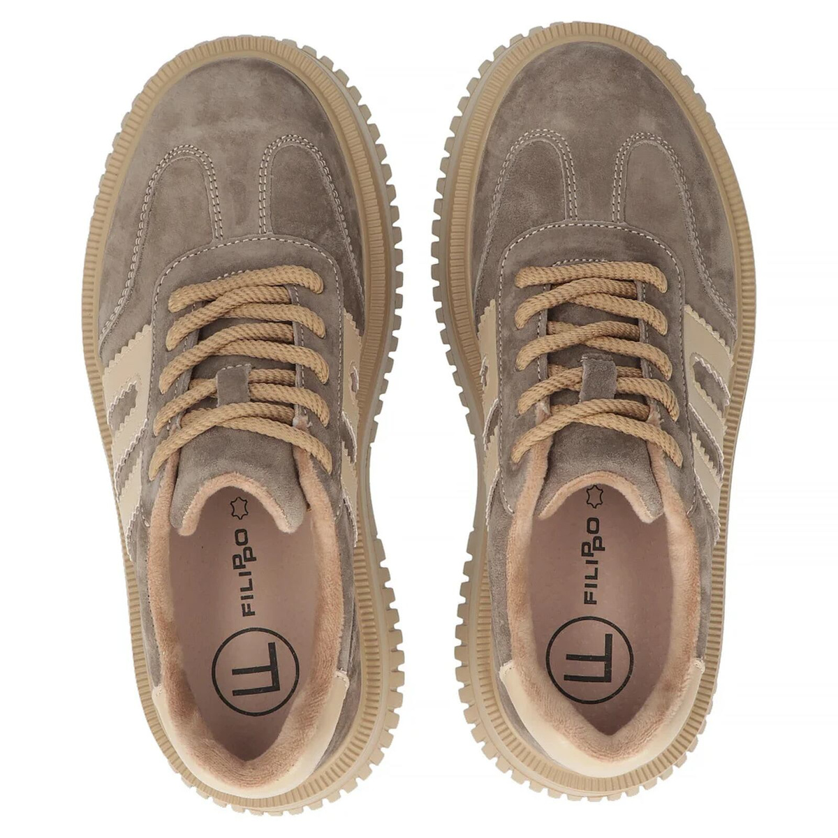 Filippo DP7111/25 to stylowe półbuty damskie na platformie, które łączą w sobie wygodę, kobiecy styl i nowoczesną elegancję. Uniwersalny kolor taupe sprawia, że buty świetnie komponują się z garderobą w różnych tonacjach – zarówno jasnych, jak i ciemniejszych.