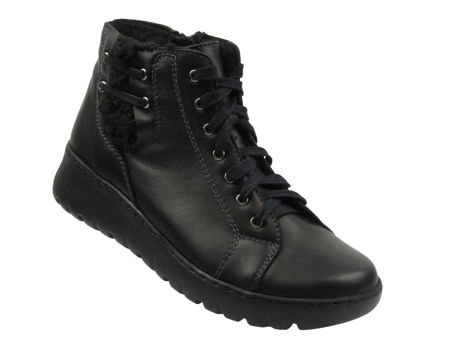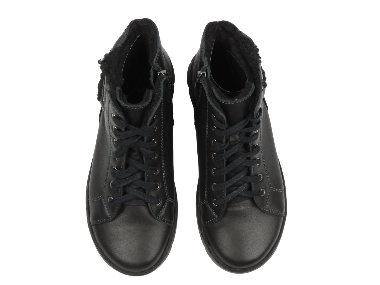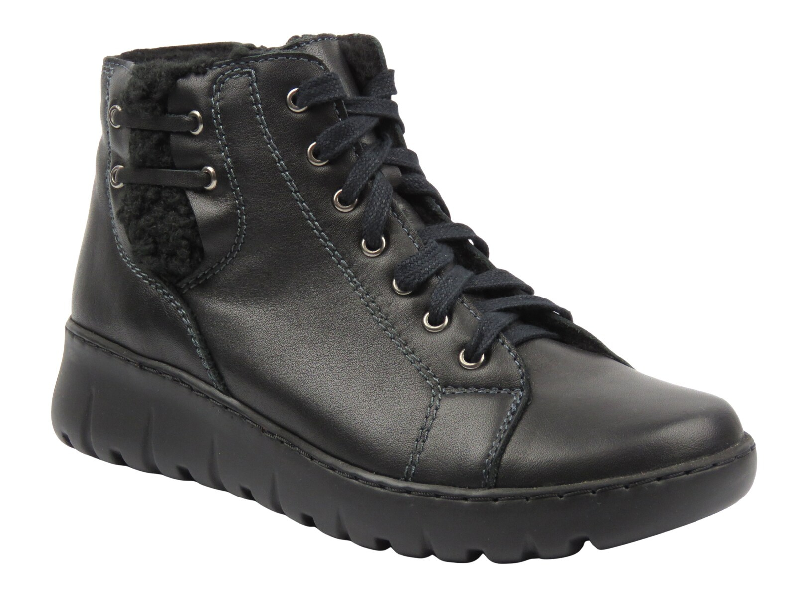 Wnętrze i wkładka z miękkiego kożucha obuwniczego skutecznie izolują termicznie, otulając stopę ciepłem i miękkością. Podwójne zapięcie – na sznurówki i suwak – pozwala na szybkie i wygodne zakładanie butów. Dzięki tęgości G model sprawdzi się także u osób z nieco szerszą stopą. Obcas o wysokości 5 cm podnosi sylwetkę, nie rezygnując z wygody.