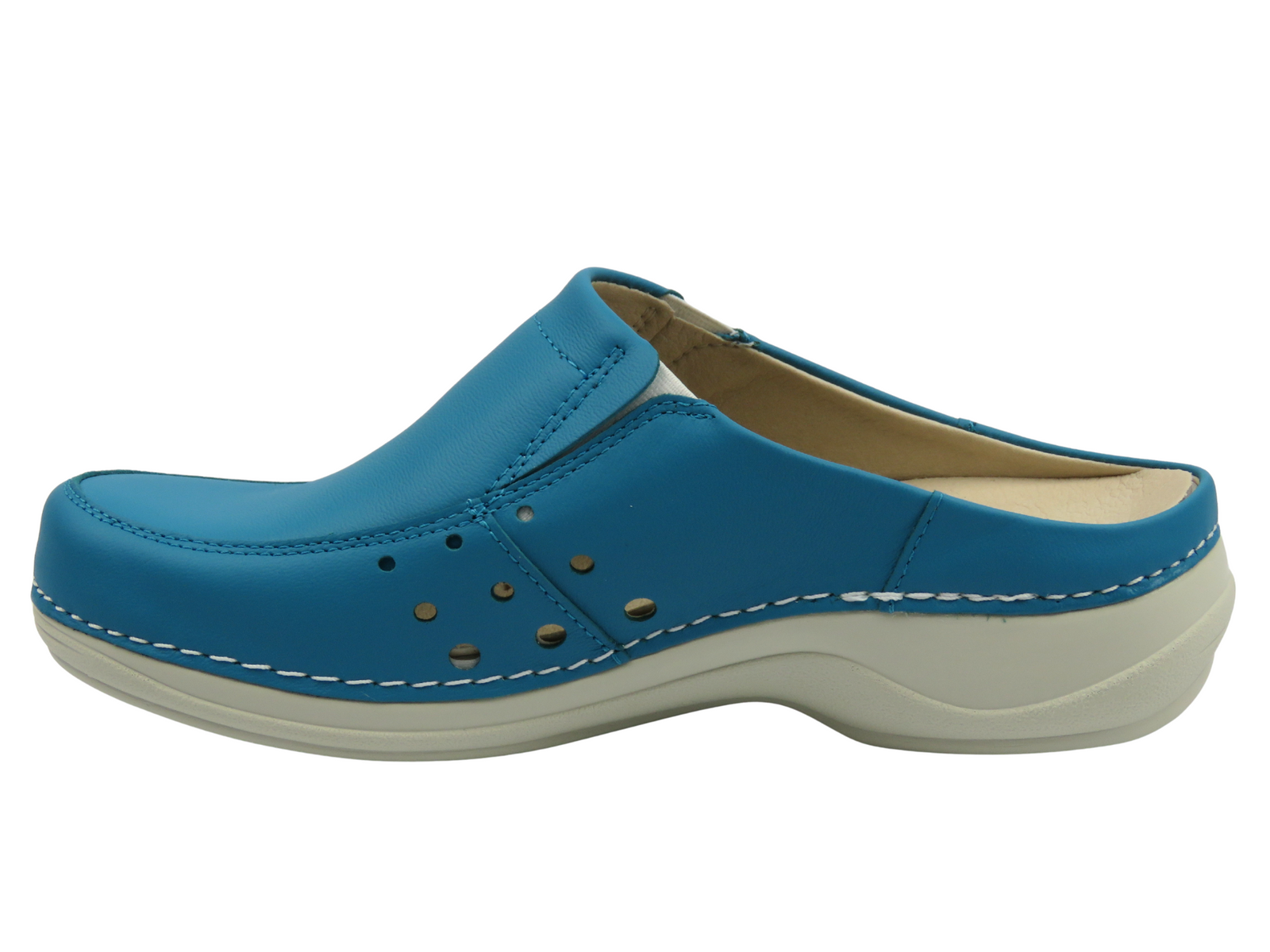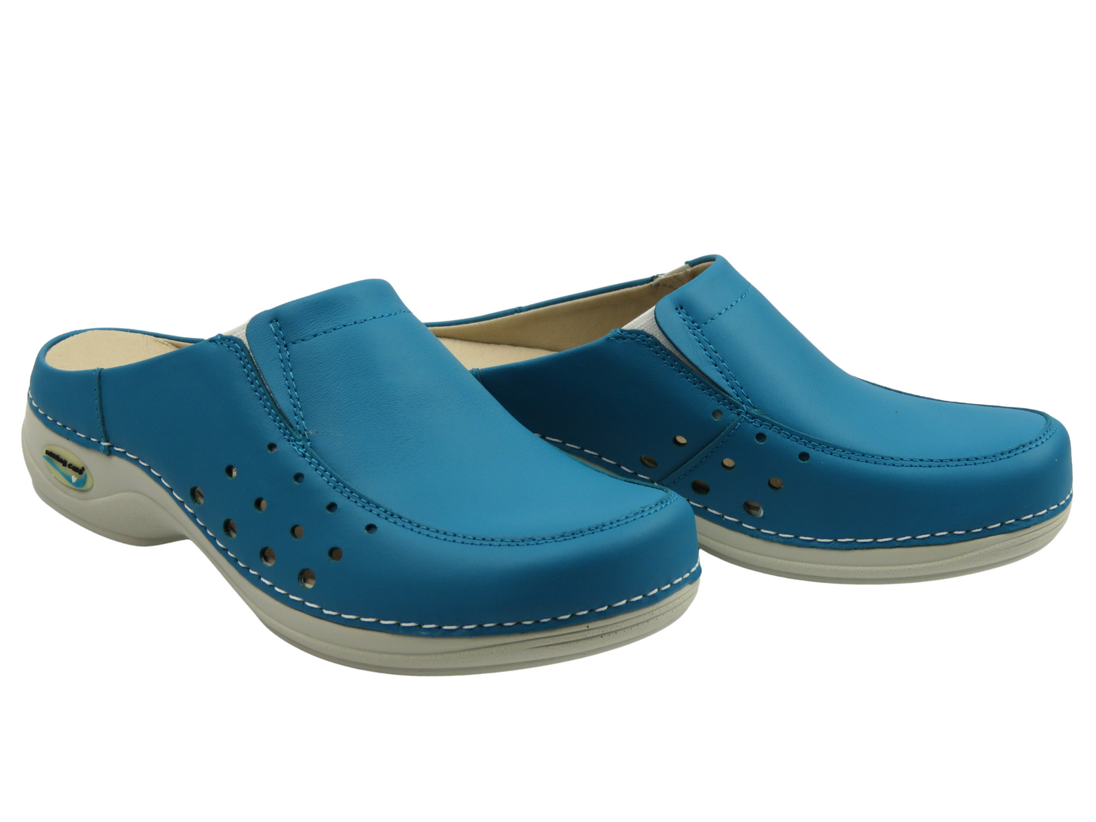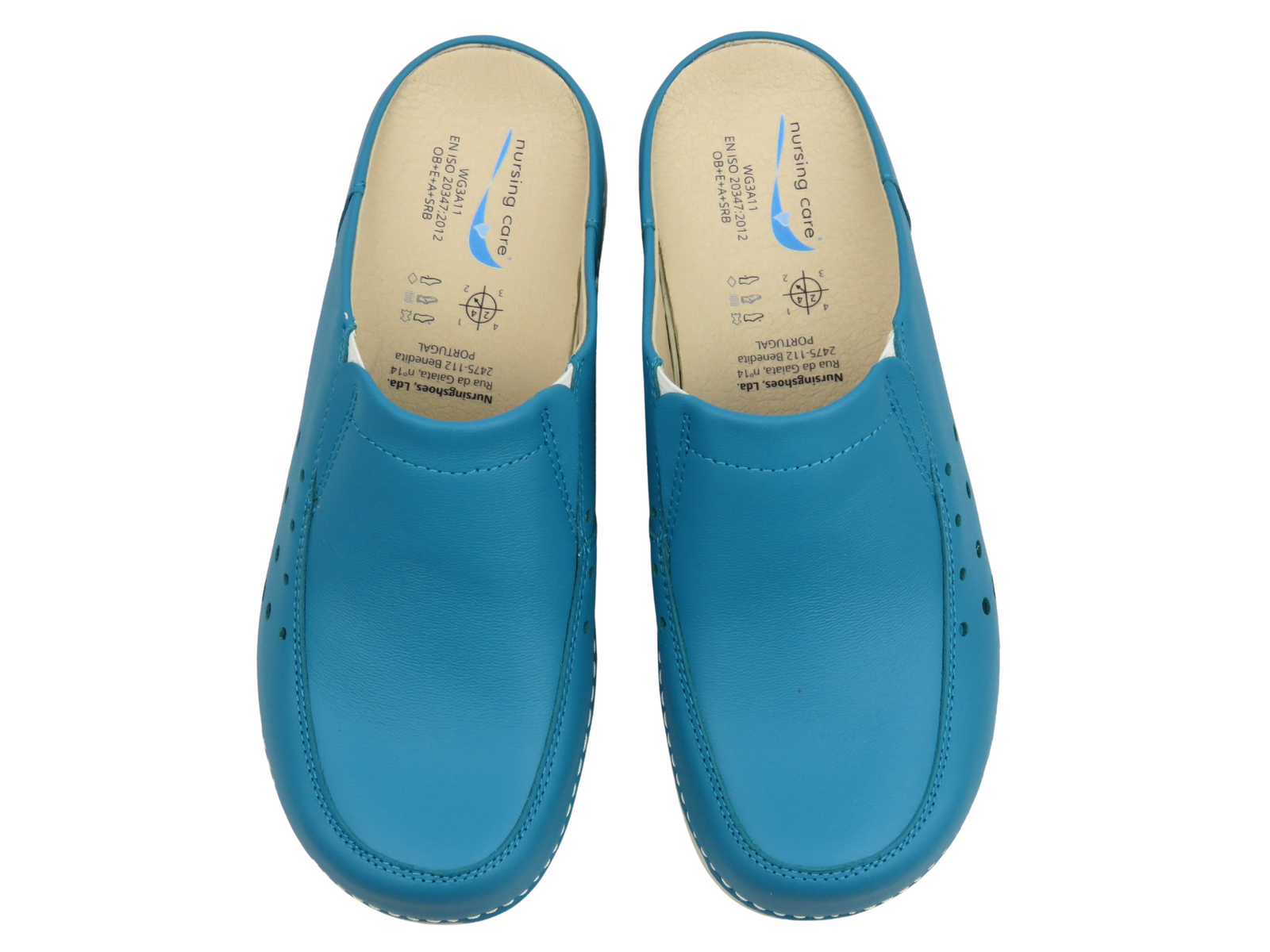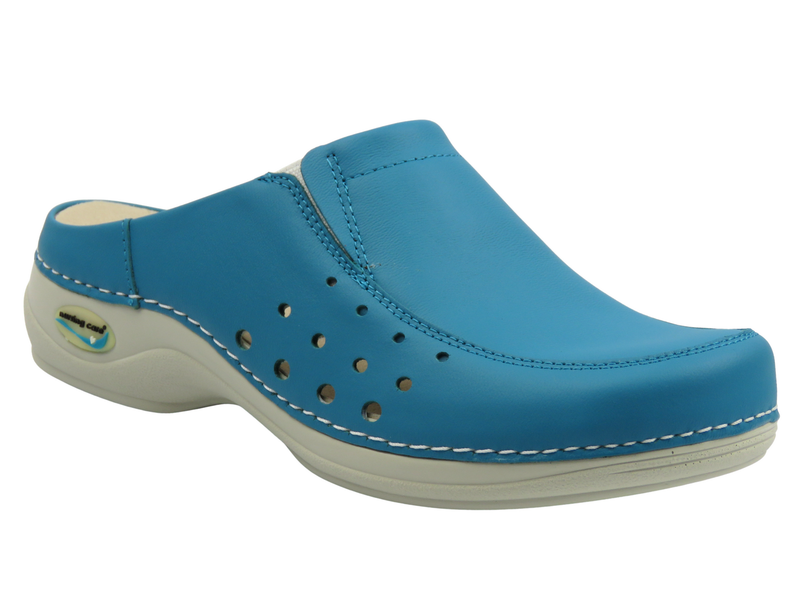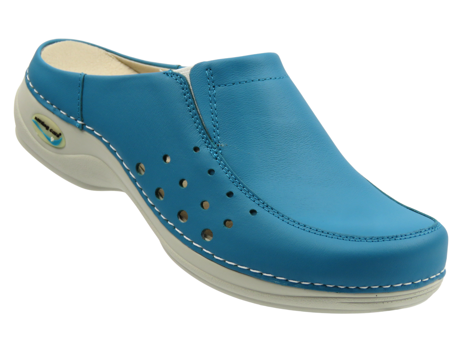 Nursing Care WG4A19 to lekkie i funkcjonalne klapki sanitarne zaprojektowane z myślą o kobietach pracujących w służbie zdrowia, gastronomii i innych wymagających branżach. Cholewka wykonana jest z wysokiej jakości naturalnej skóry w odcieniu jasnoniebieskim, który wprowadza świeżość i nowoczesny wygląd.
